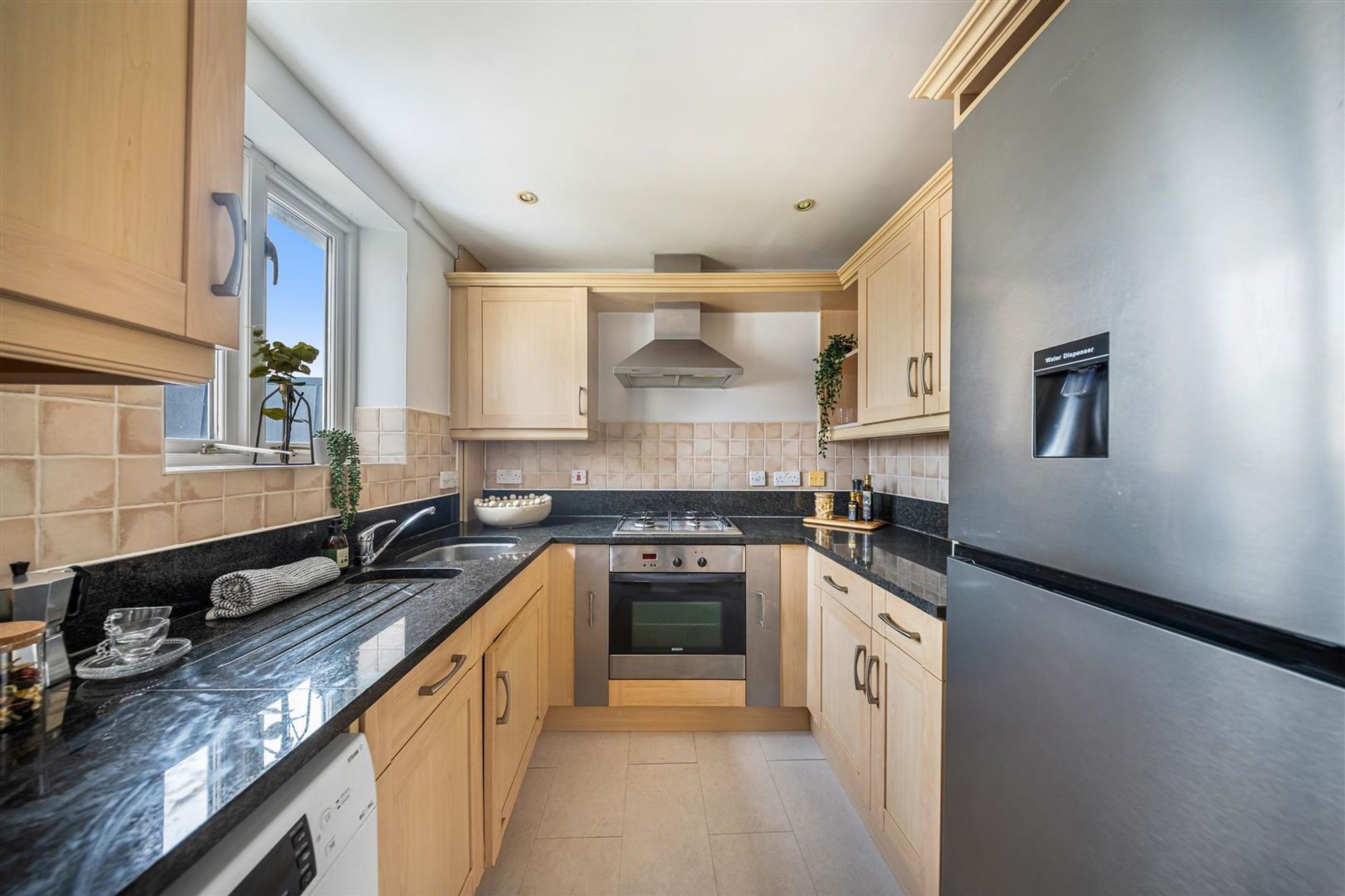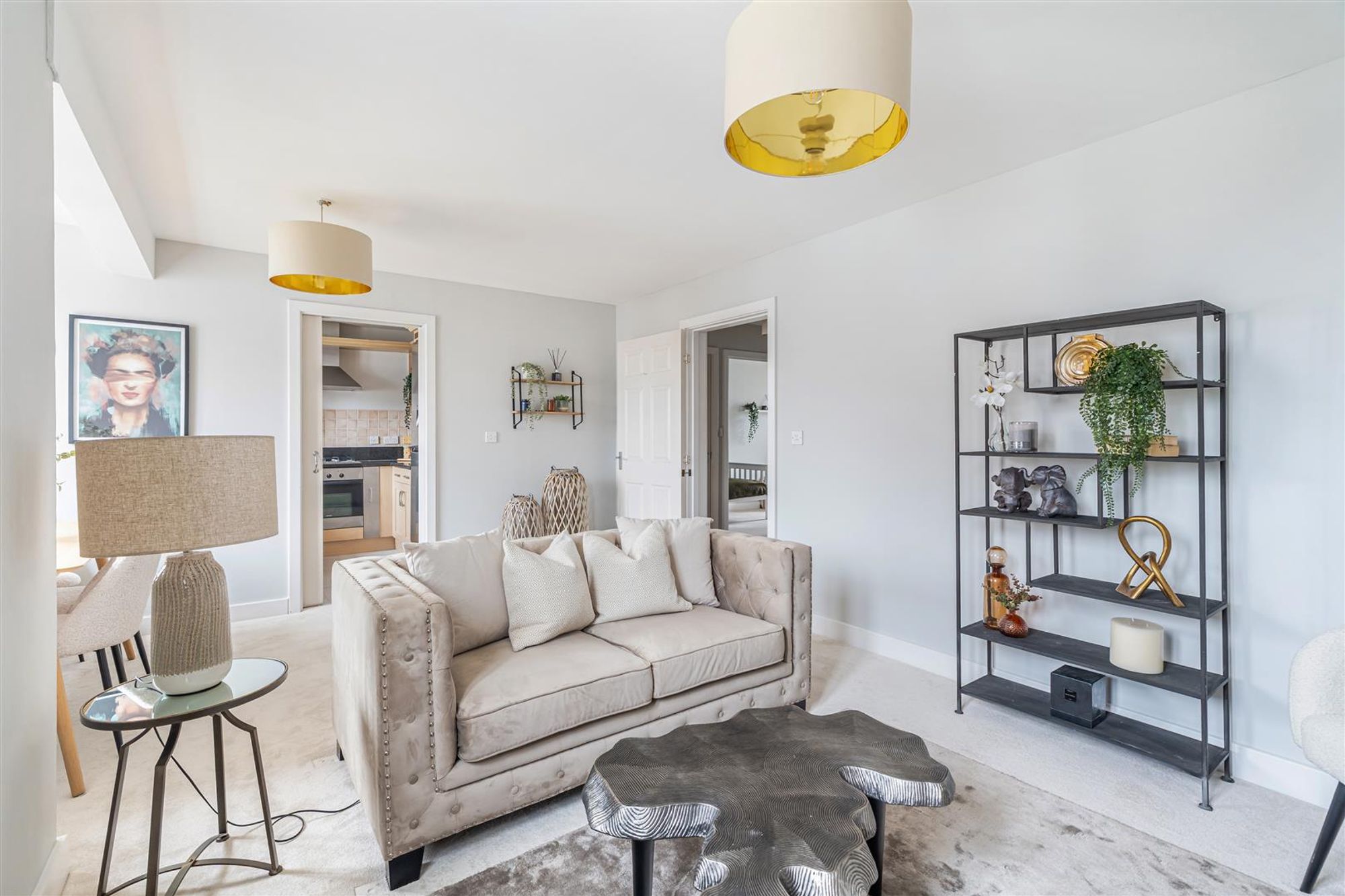 The flat is arranged around a central entrance hall with built-in storage. The living space sits to the rear of the building and includes a bright open-plan reception room with defined areas for sitting and dining. An opening leads through to a modern kitchen fitted with granite worktops and integrated appliances, positioned separately but with a clear visual connection to the living area.
