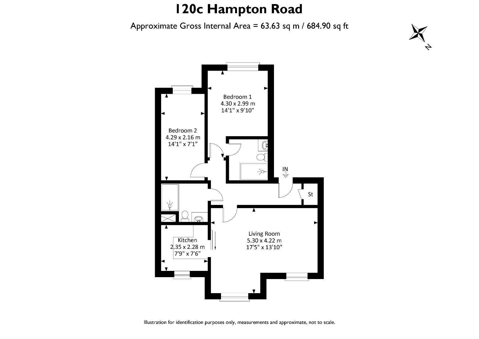 Both bedrooms are positioned at the front of the building, with the main bedroom benefiting from an en-suite shower room. A second double bedroom is served by a separate bathroom located off the hallway.