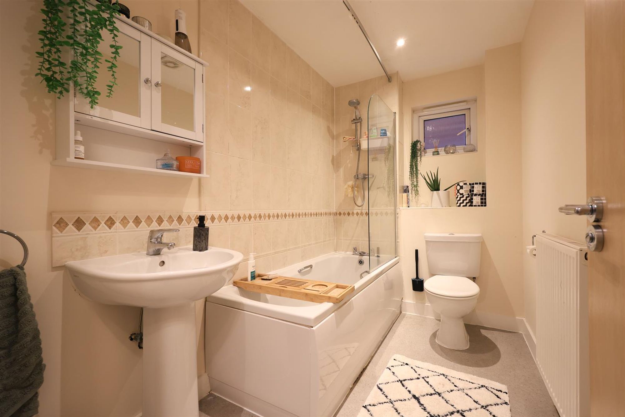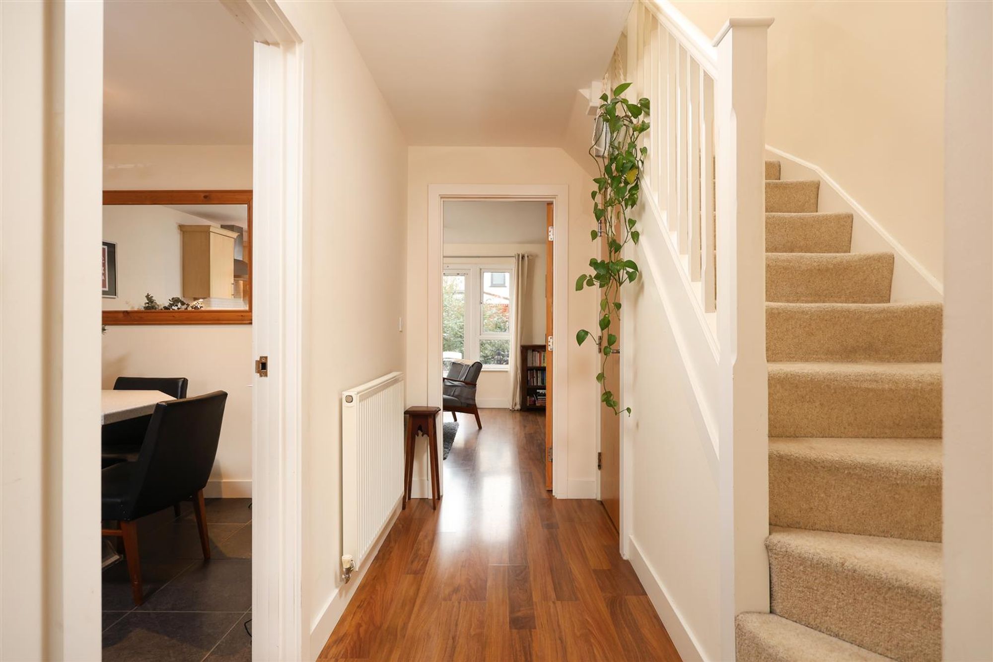 A staircase, with large storage cupboard below, leads up to the first floor to three bedrooms and a family bathroom. The principle bedroom is located at the front of the house and benefits from an en-suite shower room. The en-suite features a white suite with large walk-in shower, floor to ceiling tiled splash-backs and a tiled floor. Bedroom two and three are situated at the back of the house and have a green and leafy outlook over the rear garden. Finally, completing the accommodation is a modern family bathroom with a white three piece suite, tiled splash-backs and a vinyl floor.