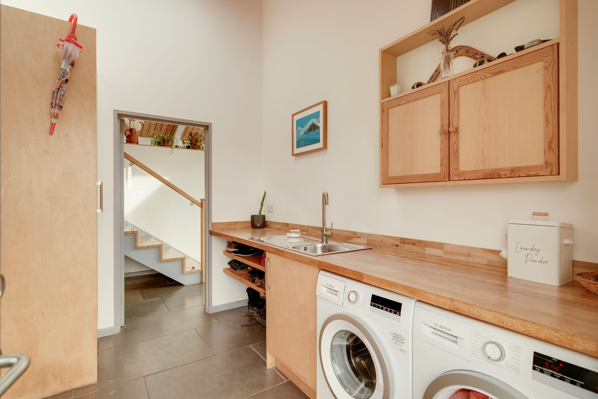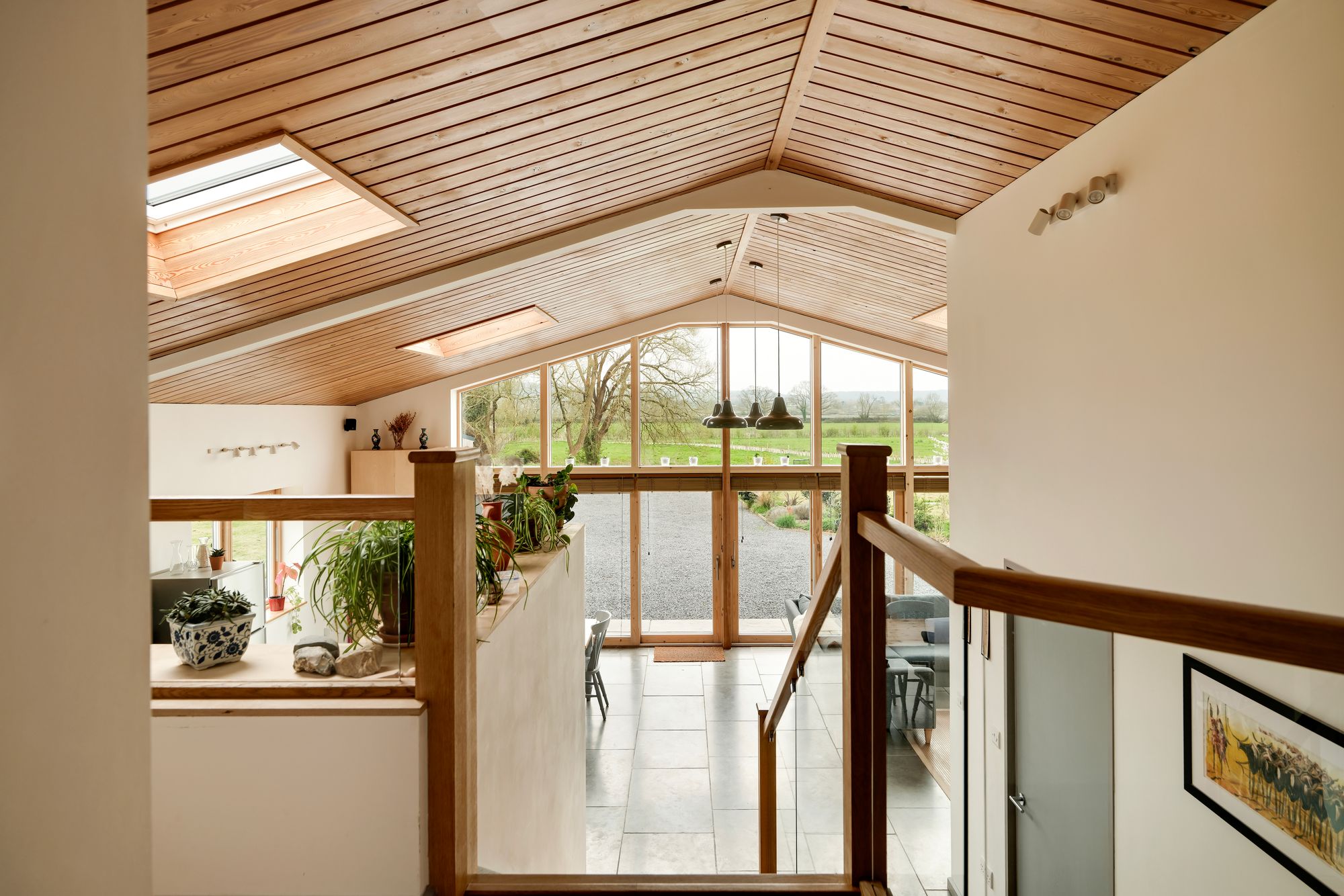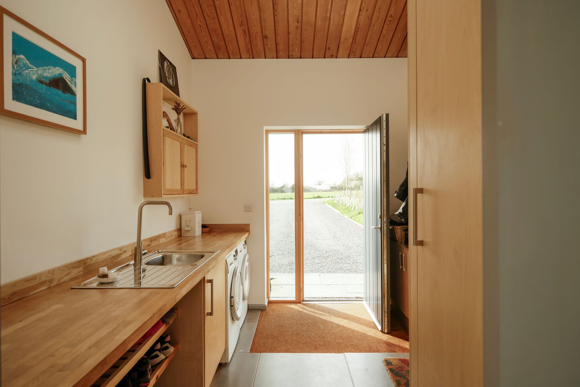 The main barn was built on the site of a former cow shed, and has been finished to an excellent standard. The entrance hall doubles up as a utility room, with space for a washing machine and tumble dryer, and a door leading to the impressive open-plan kitchen/dining and living space.