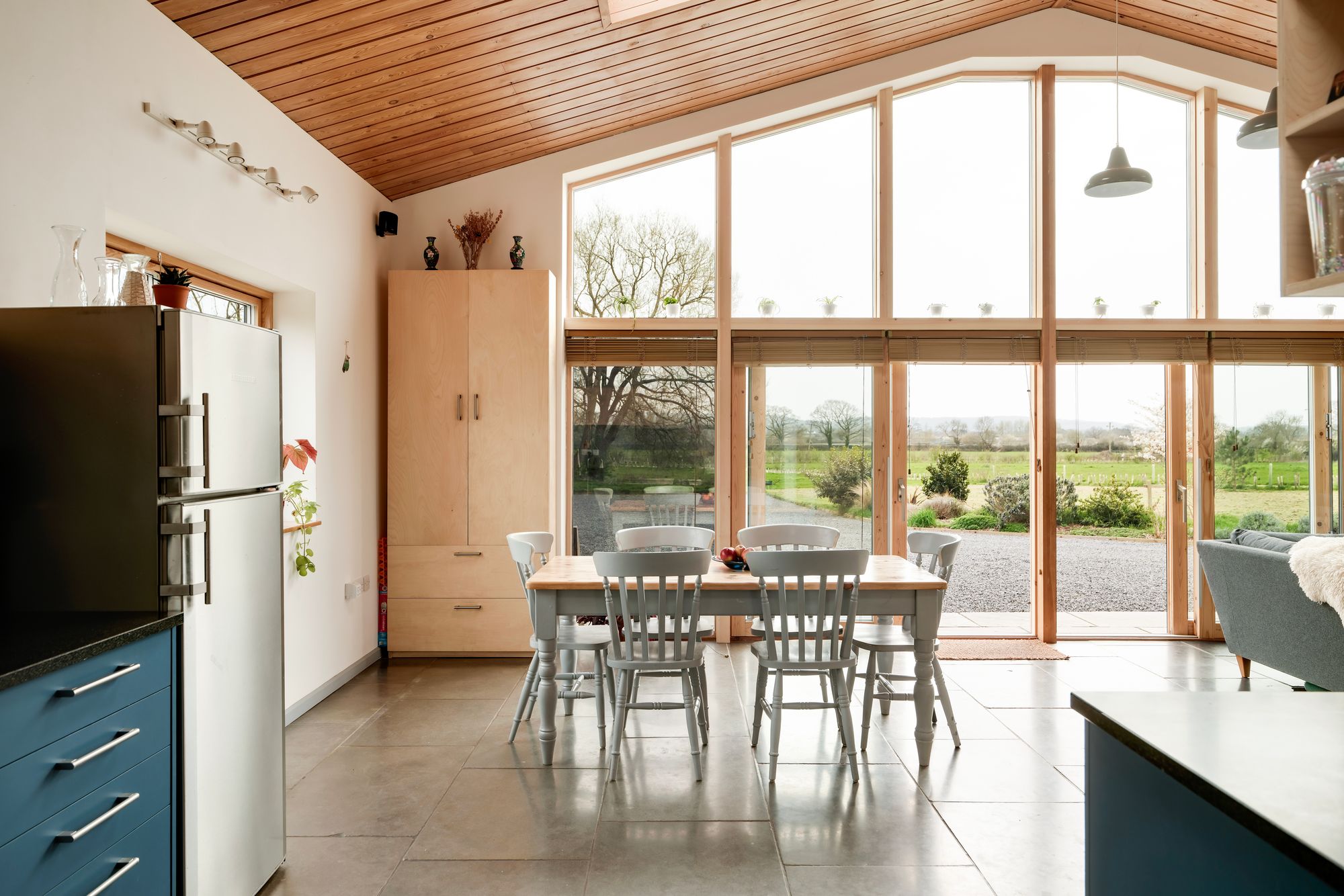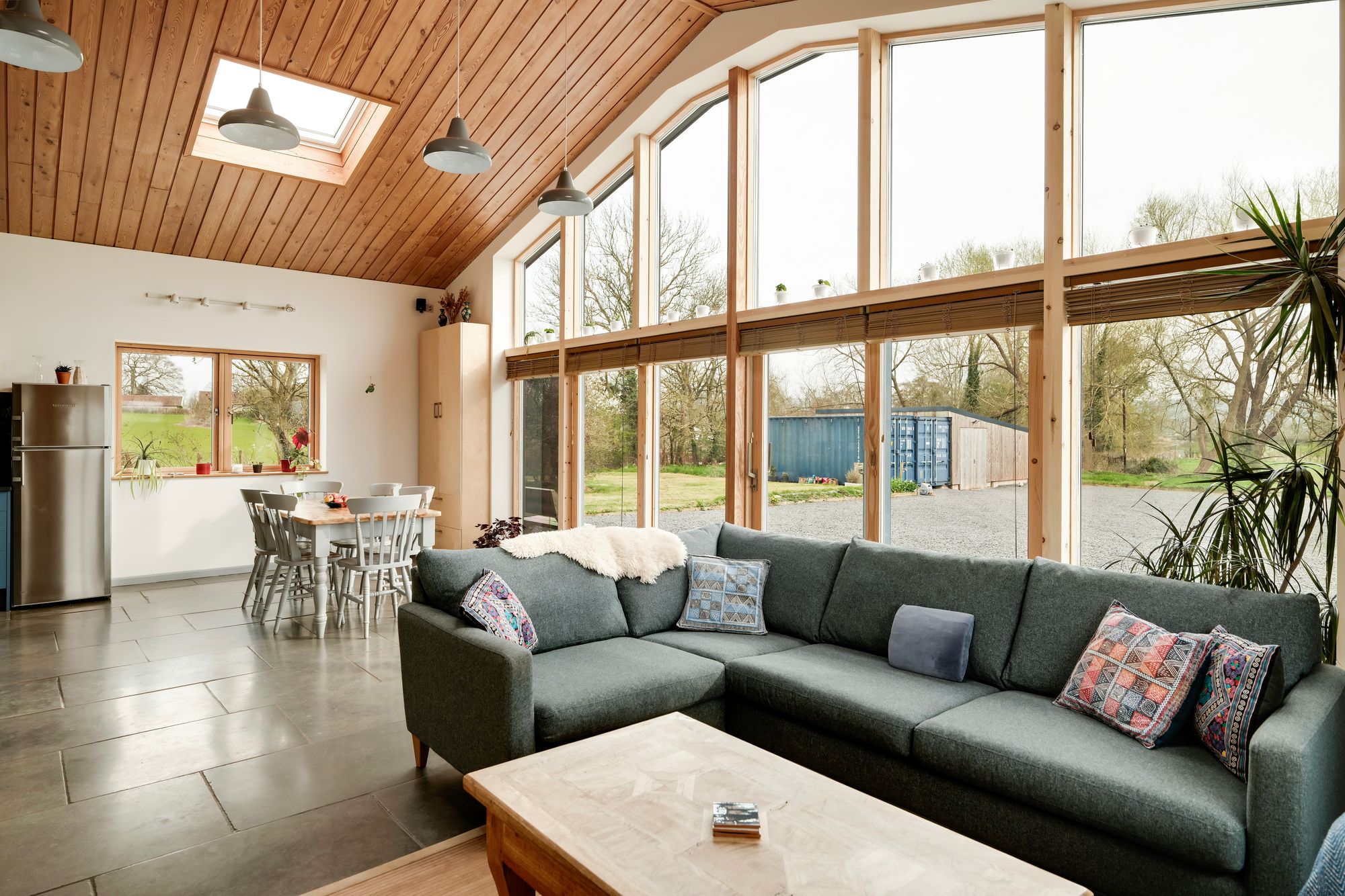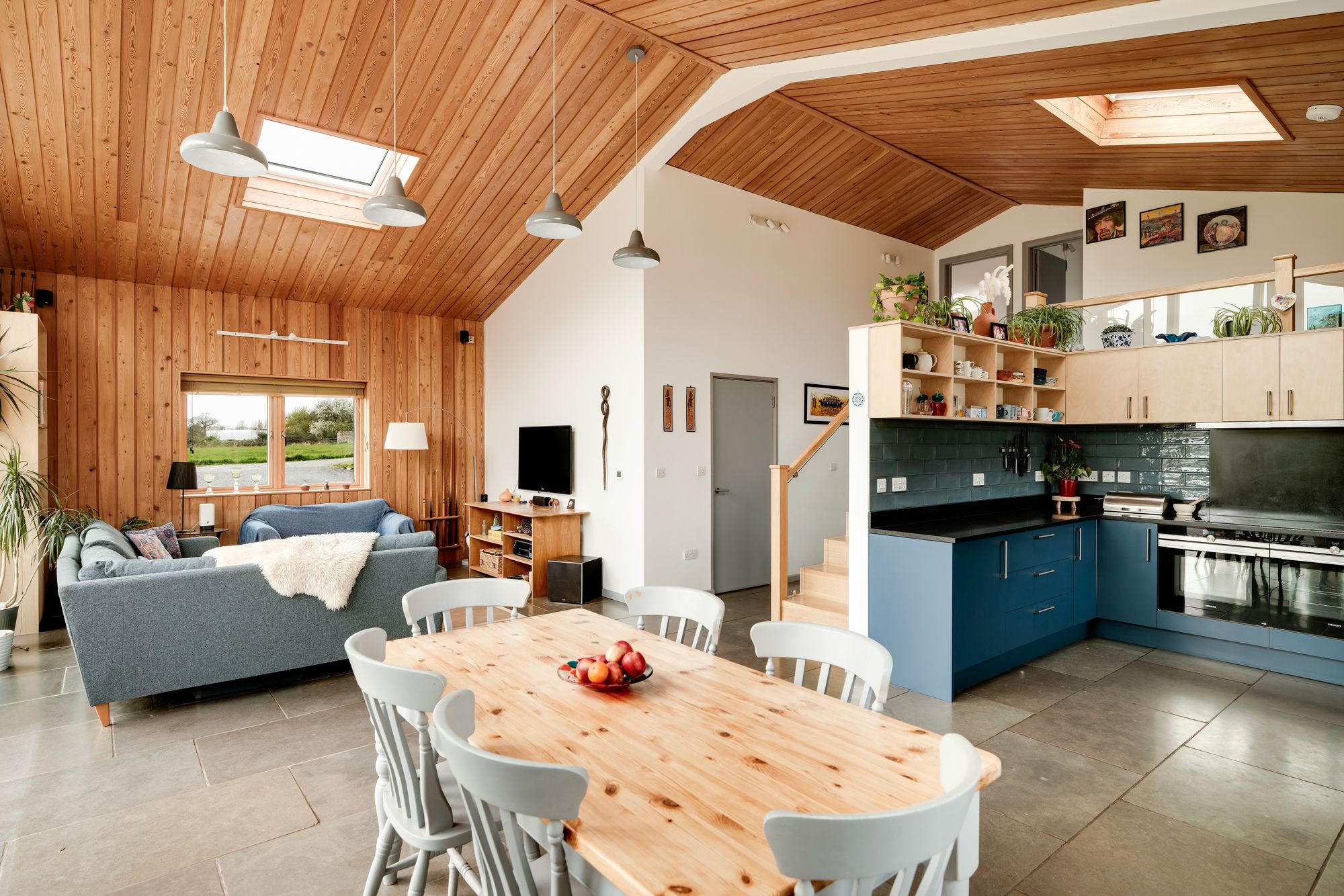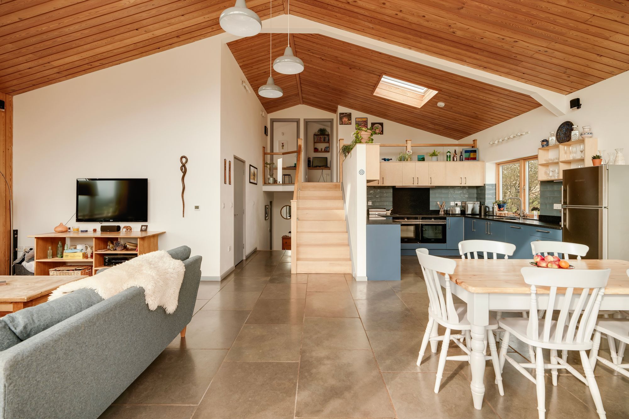 The living area features a vaulted ceiling and a south-facing glass wall that floods the room with natural light, and provides a seamless connection with the outdoors. This large, versatile space currently accommodates a lounge area, pool table, and dining area. Tucked away on the left is the spacious kitchen with plywood units and shelving, contrasting granite worktops and integrated appliances.