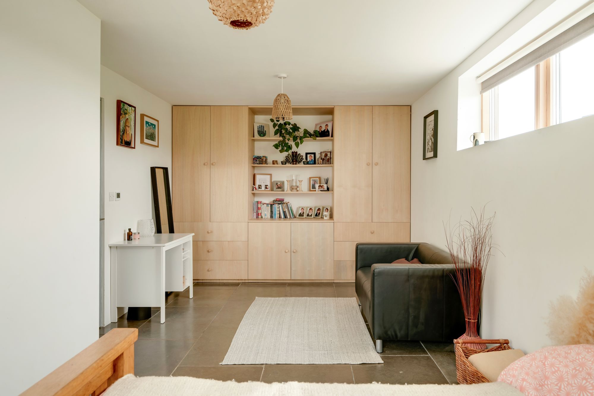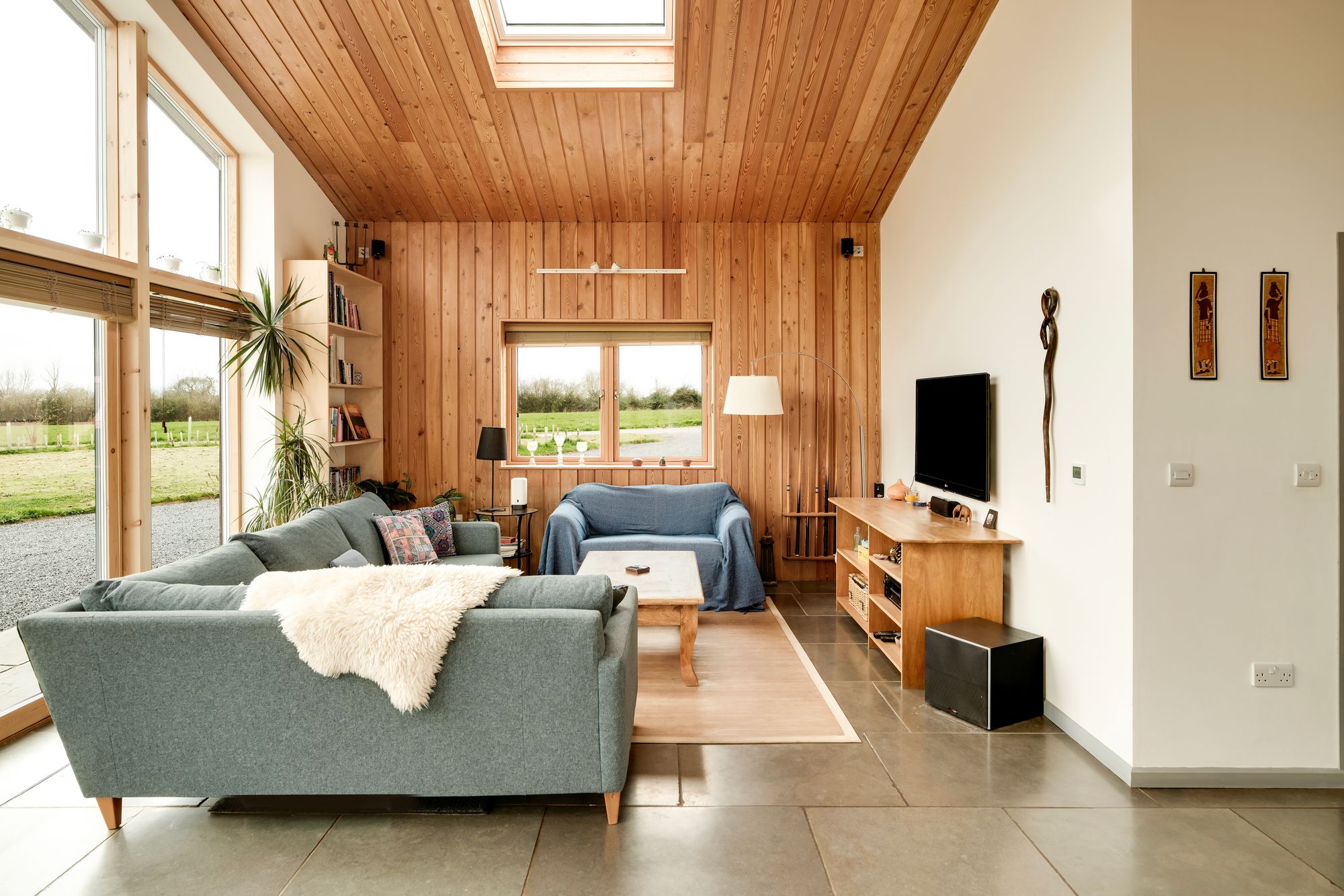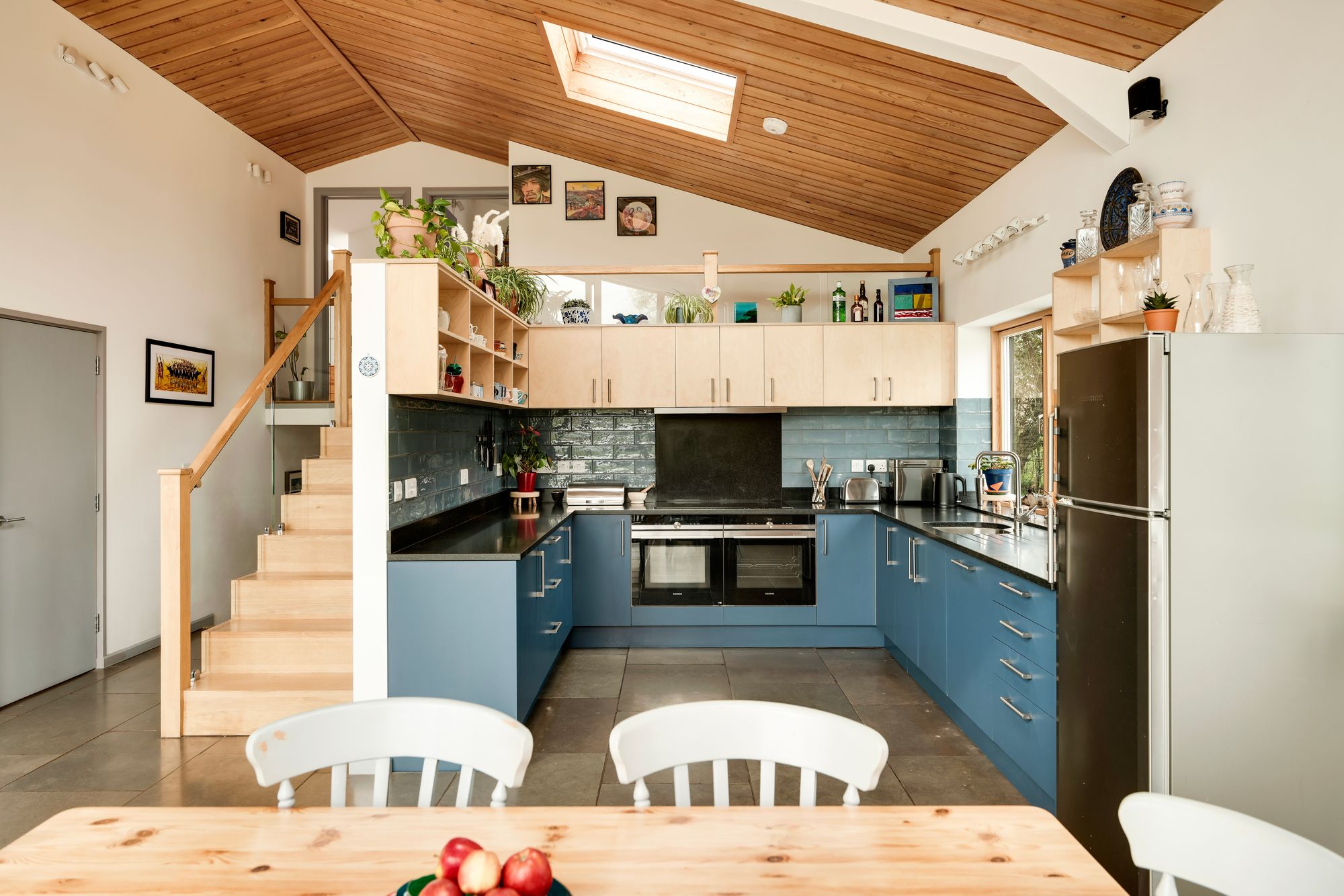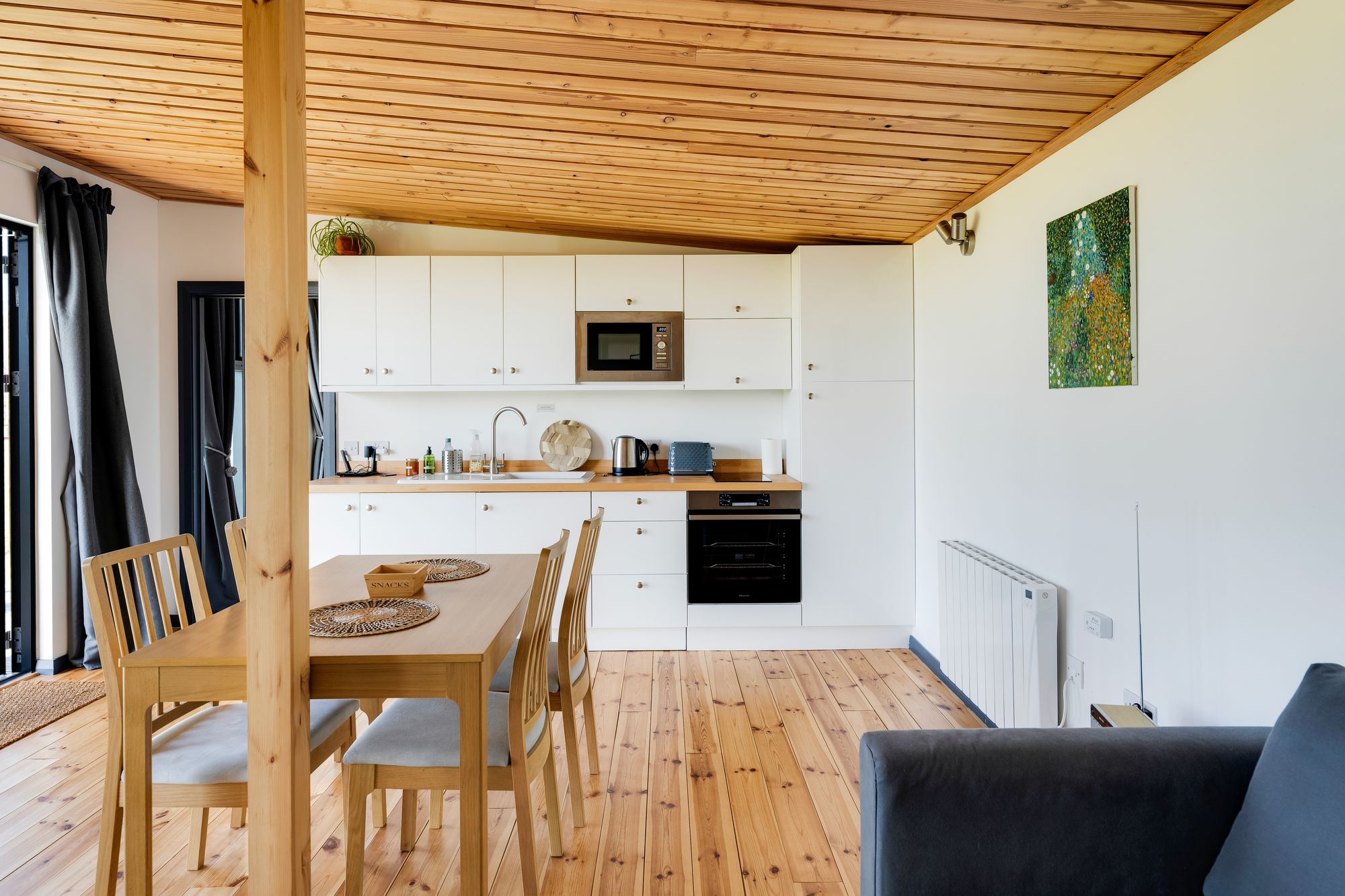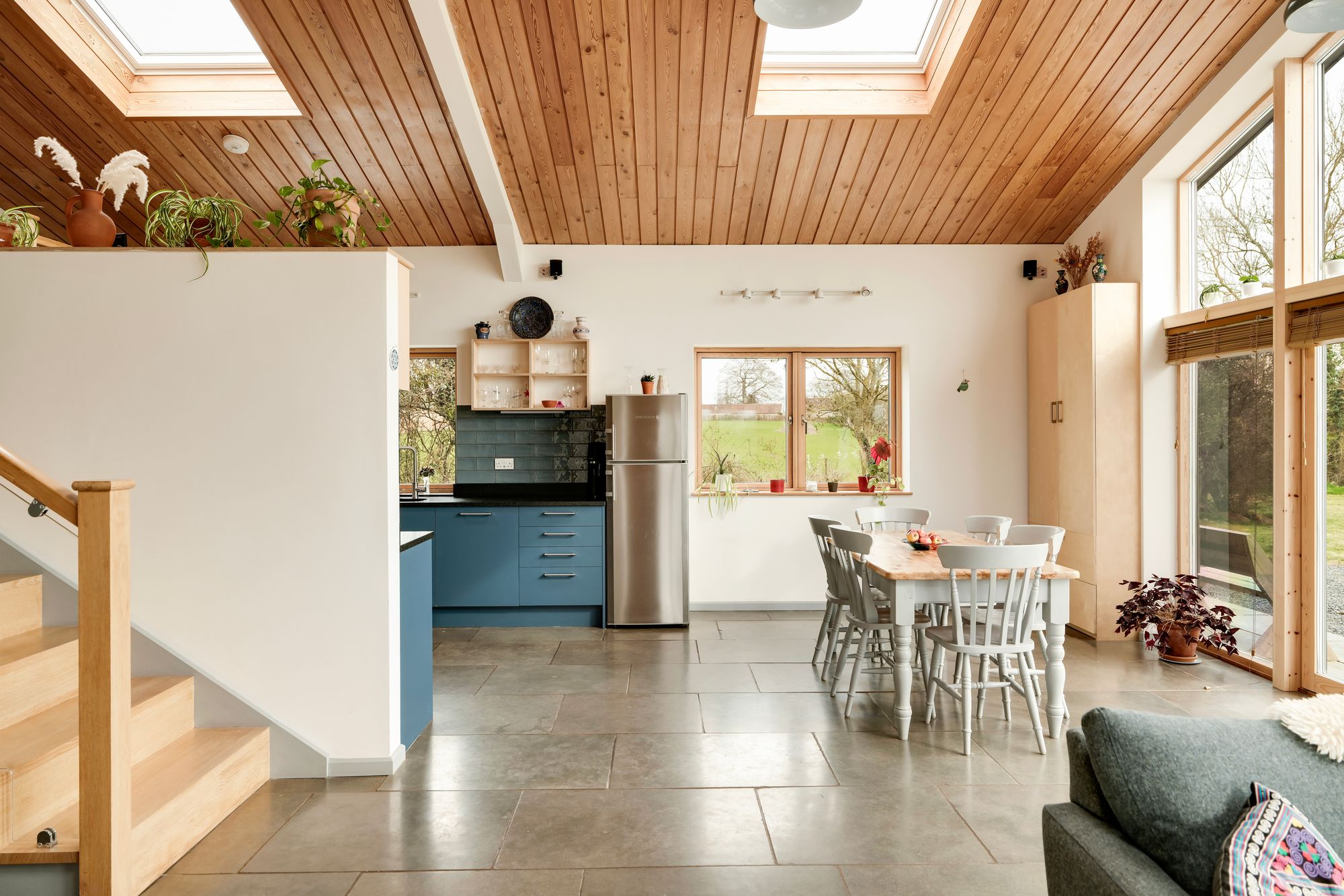 The living area features a vaulted ceiling and a south-facing glass wall that floods the room with natural light, and provides a seamless connection with the outdoors. This large, versatile space currently accommodates a lounge area, pool table, and dining area. Tucked away on the left is the spacious kitchen with plywood units and shelving, contrasting granite worktops and integrated appliances.