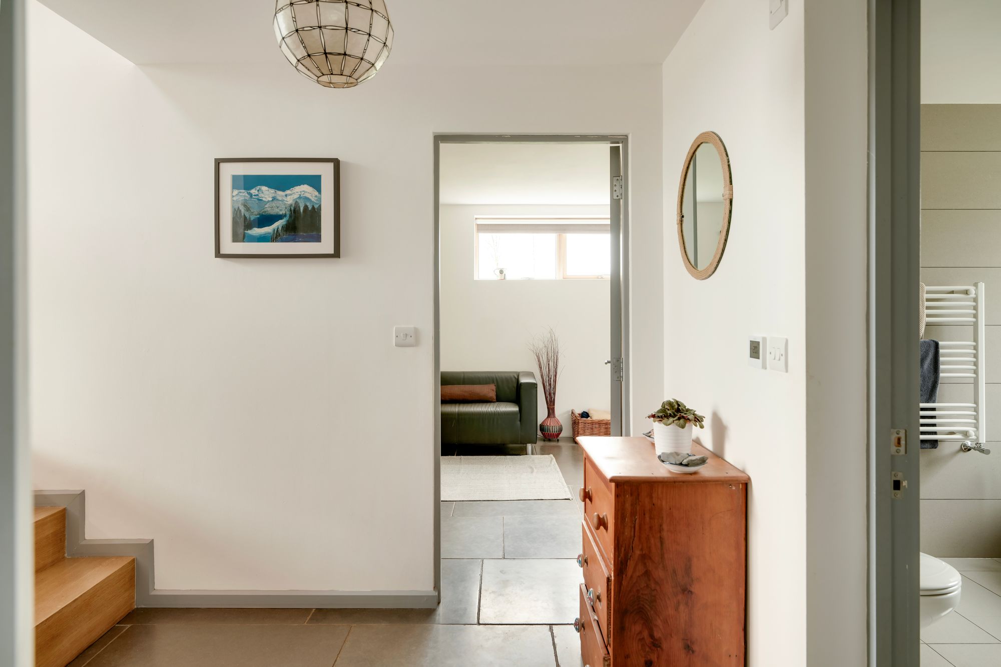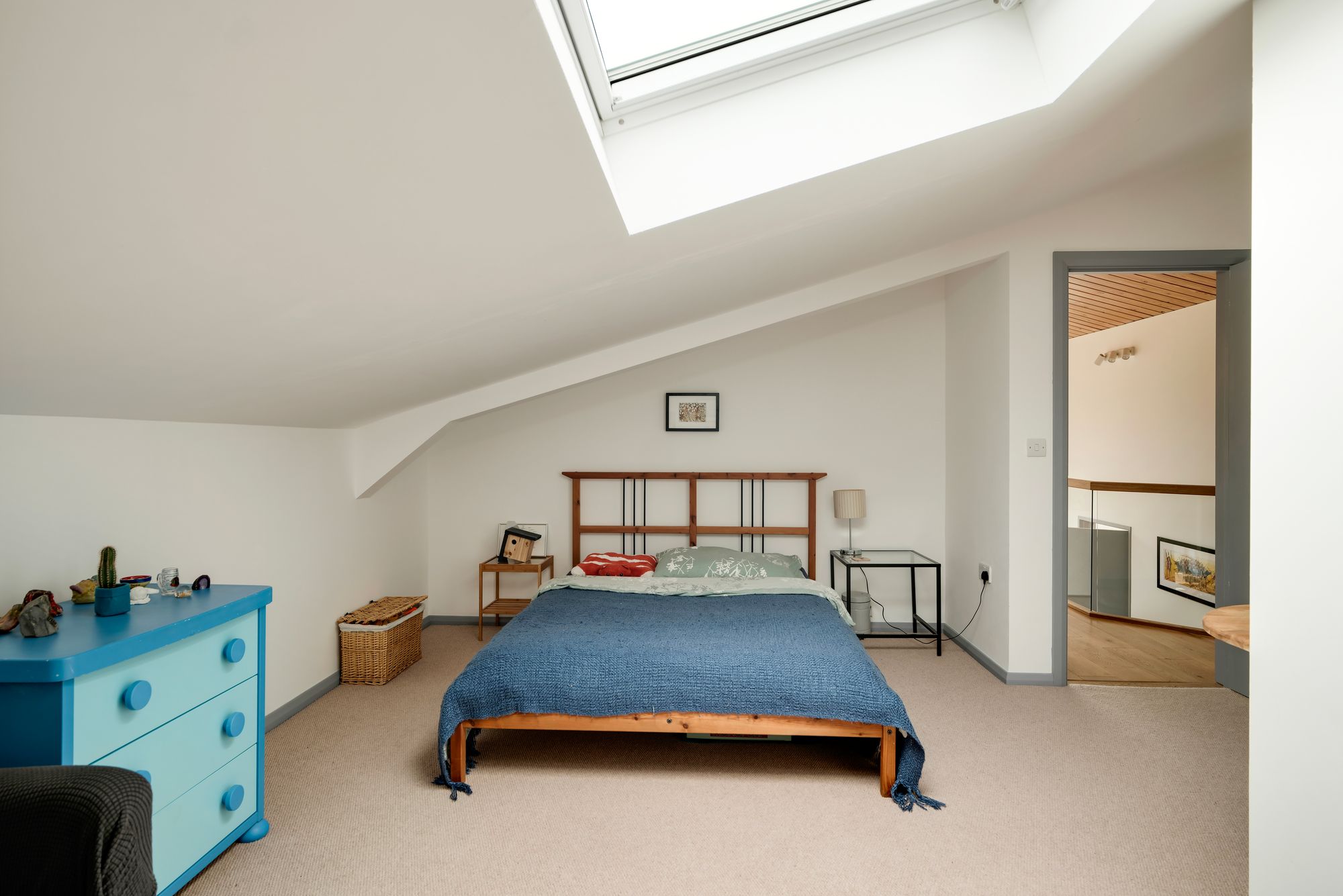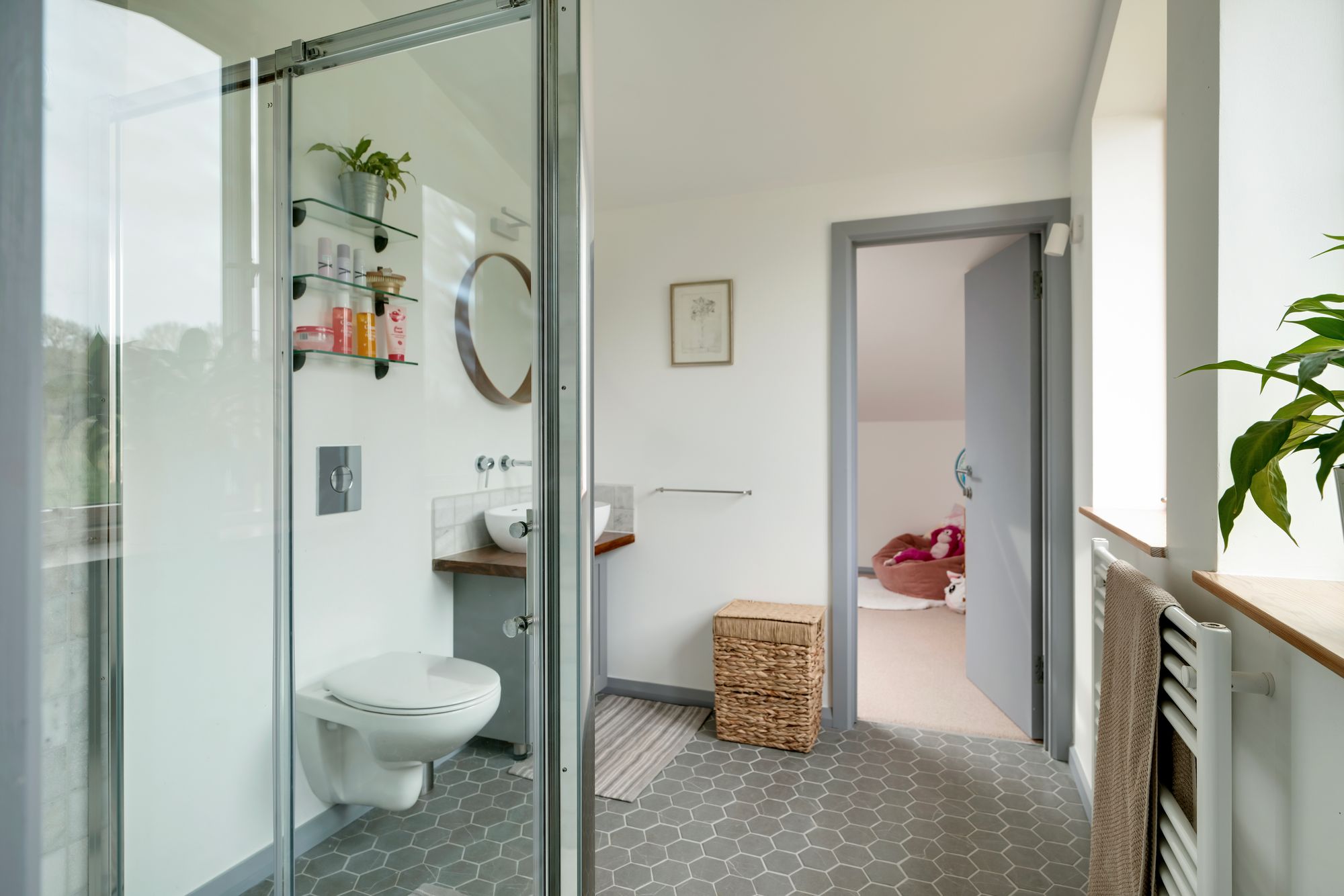 A timber and glass staircase leads to the upper floor and two well sized bedrooms with vaulted ceilings and velux windows letting in plenty of natural light. The second bedroom also features a useful walk in wardrobe. Connecting the bedrooms is a Jack and Jill bathroom complete with a contemporary white suite, enclosed shower, tiled splash back and chrome fittings. There is also a snug and gallery platform which overlooks the main living space.