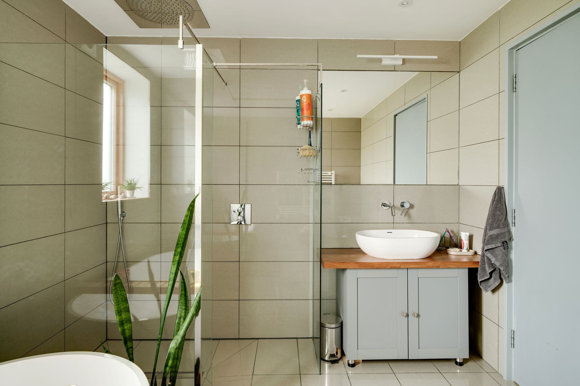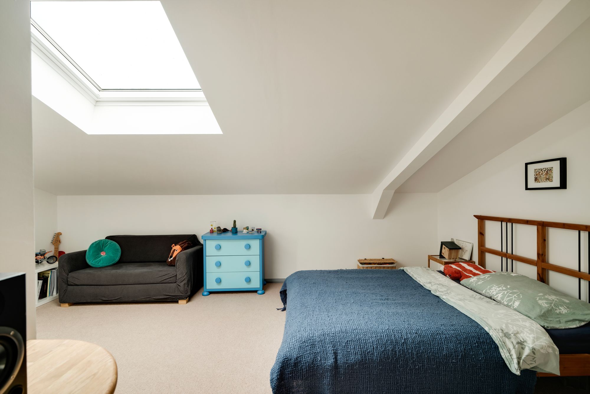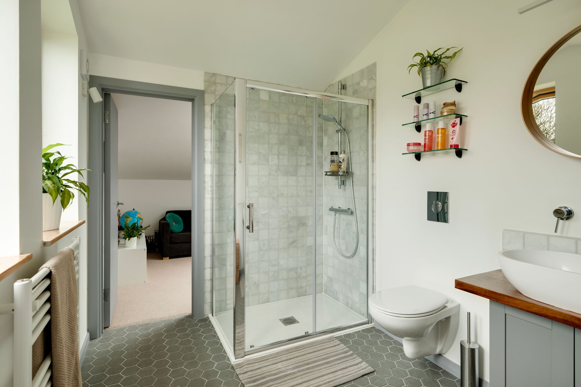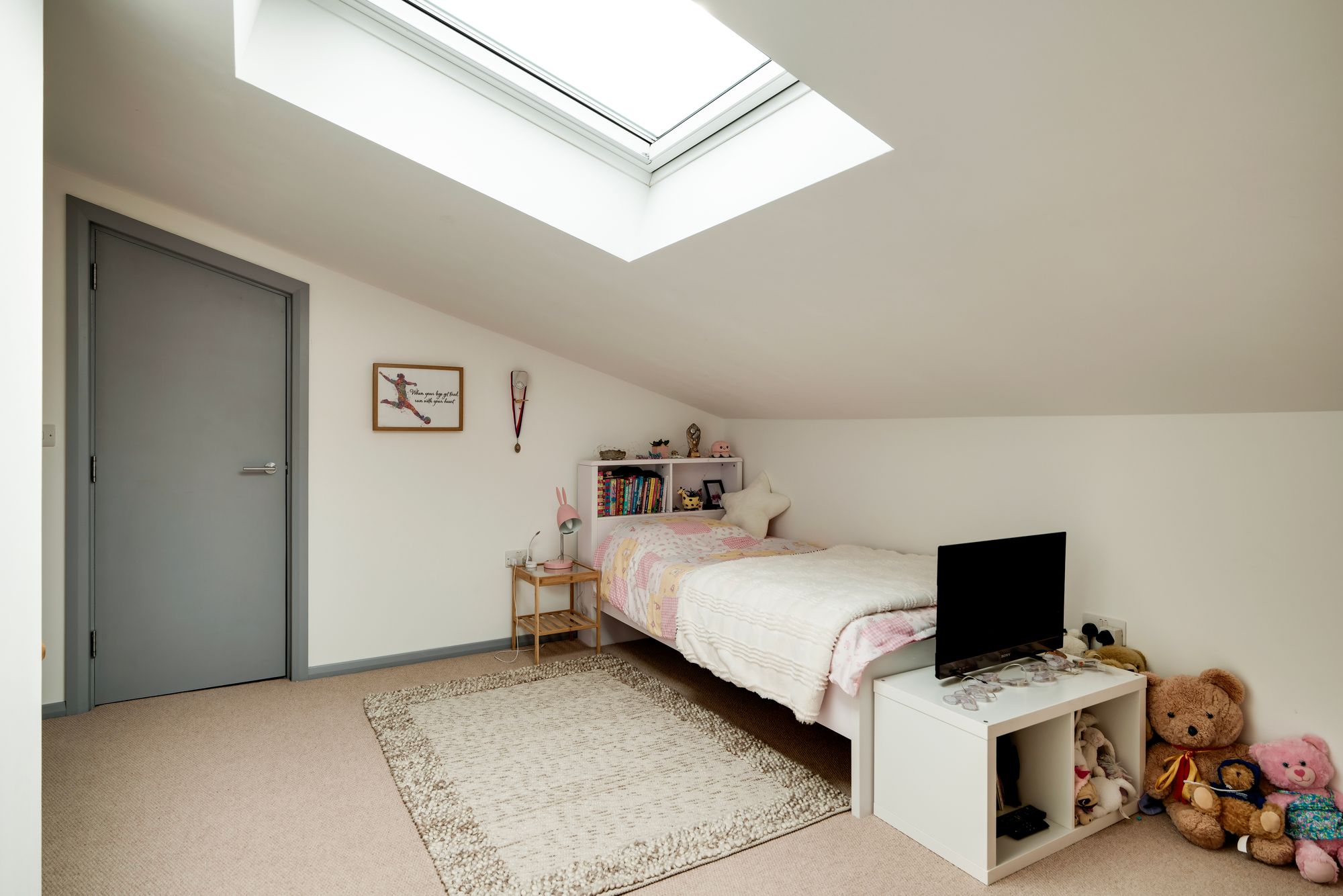 A timber and glass staircase leads to the upper floor and two well sized bedrooms with vaulted ceilings and velux windows letting in plenty of natural light. The second bedroom also features a useful walk in wardrobe. Connecting the bedrooms is a Jack and Jill bathroom complete with a contemporary white suite, enclosed shower, tiled splash back and chrome fittings. There is also a snug and gallery platform which overlooks the main living space.
