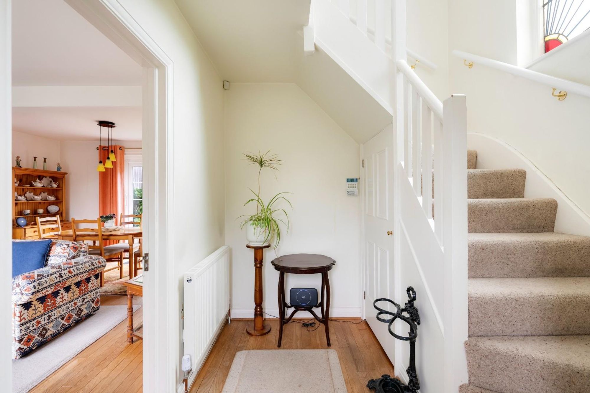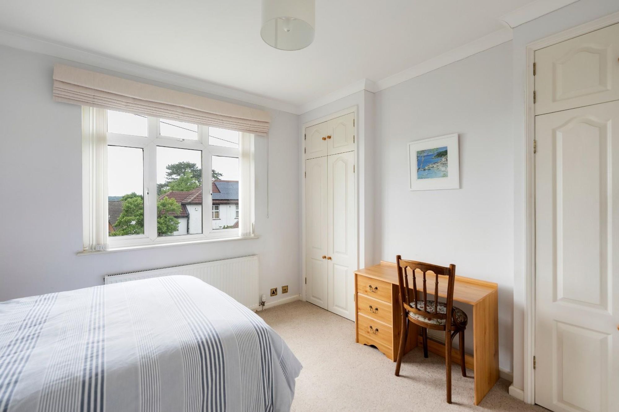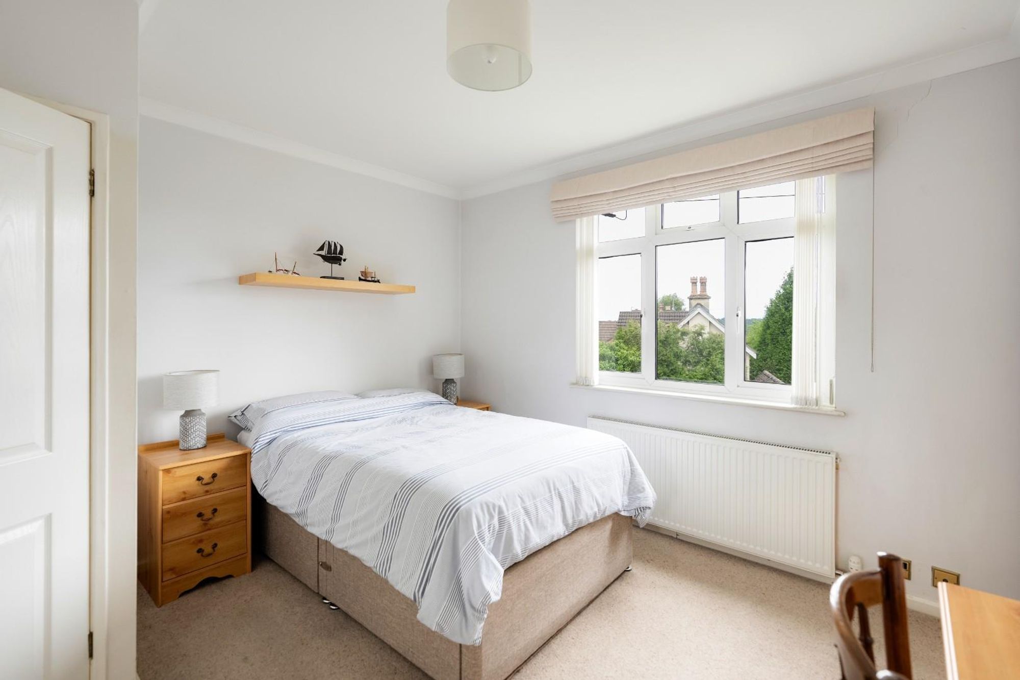 Upstairs, a stained glass window adds a beautiful decorative note to the stairwell, gently filtering natural light across the landing. All three bedrooms are finished with soft carpeting and retain a sense of calm and comfort. The generous primary double bedroom features built-in wardrobes and space for a dressing table. The second double bedroom also includes built-in storage and leads, via a wooden bi-fold door, to a third bedroom which offers flexibility as a study, guest room or nursery.