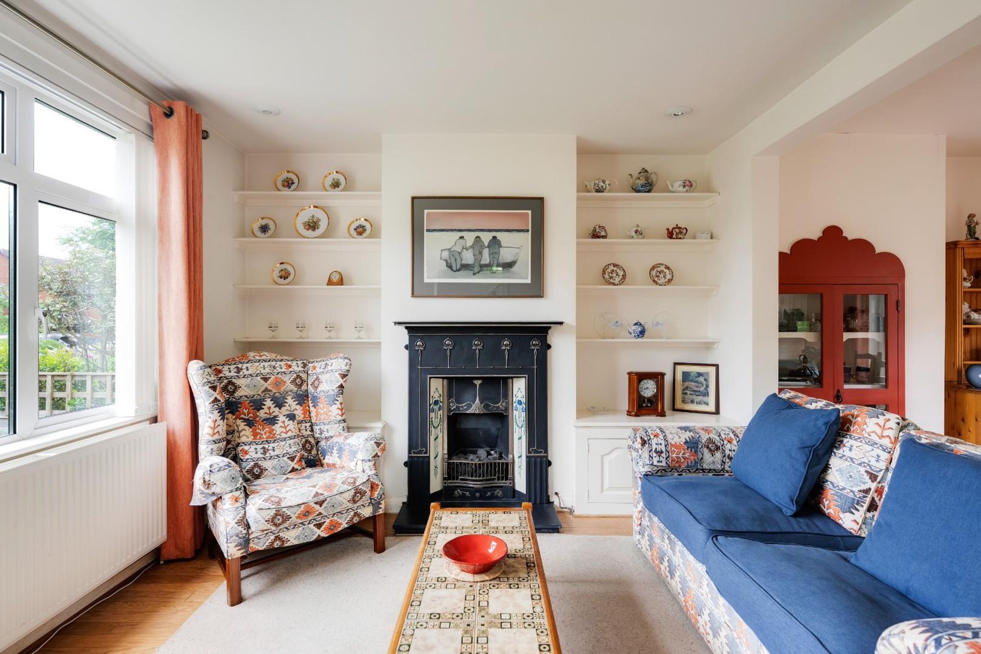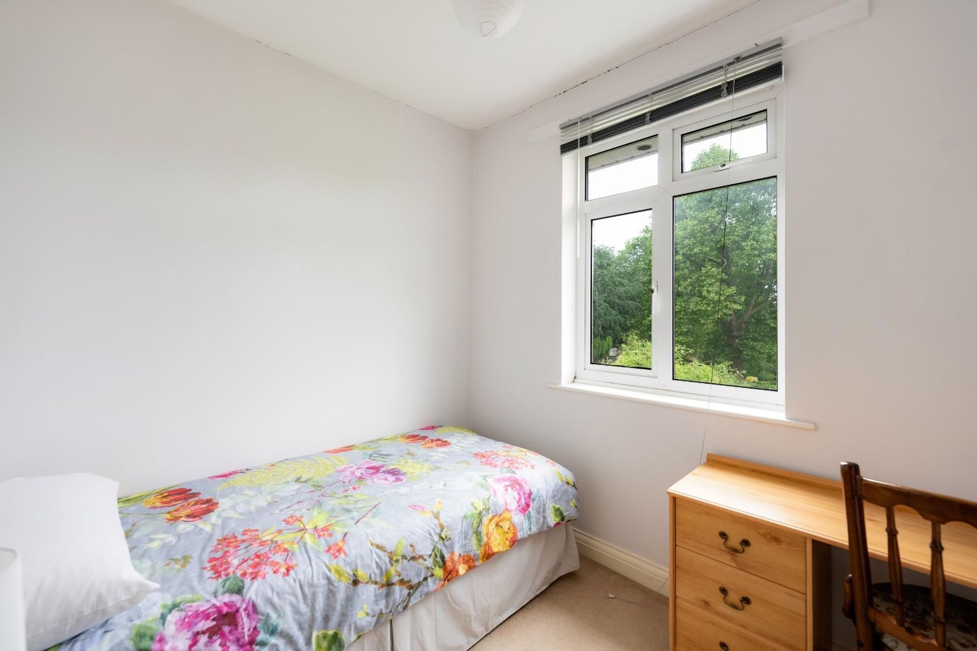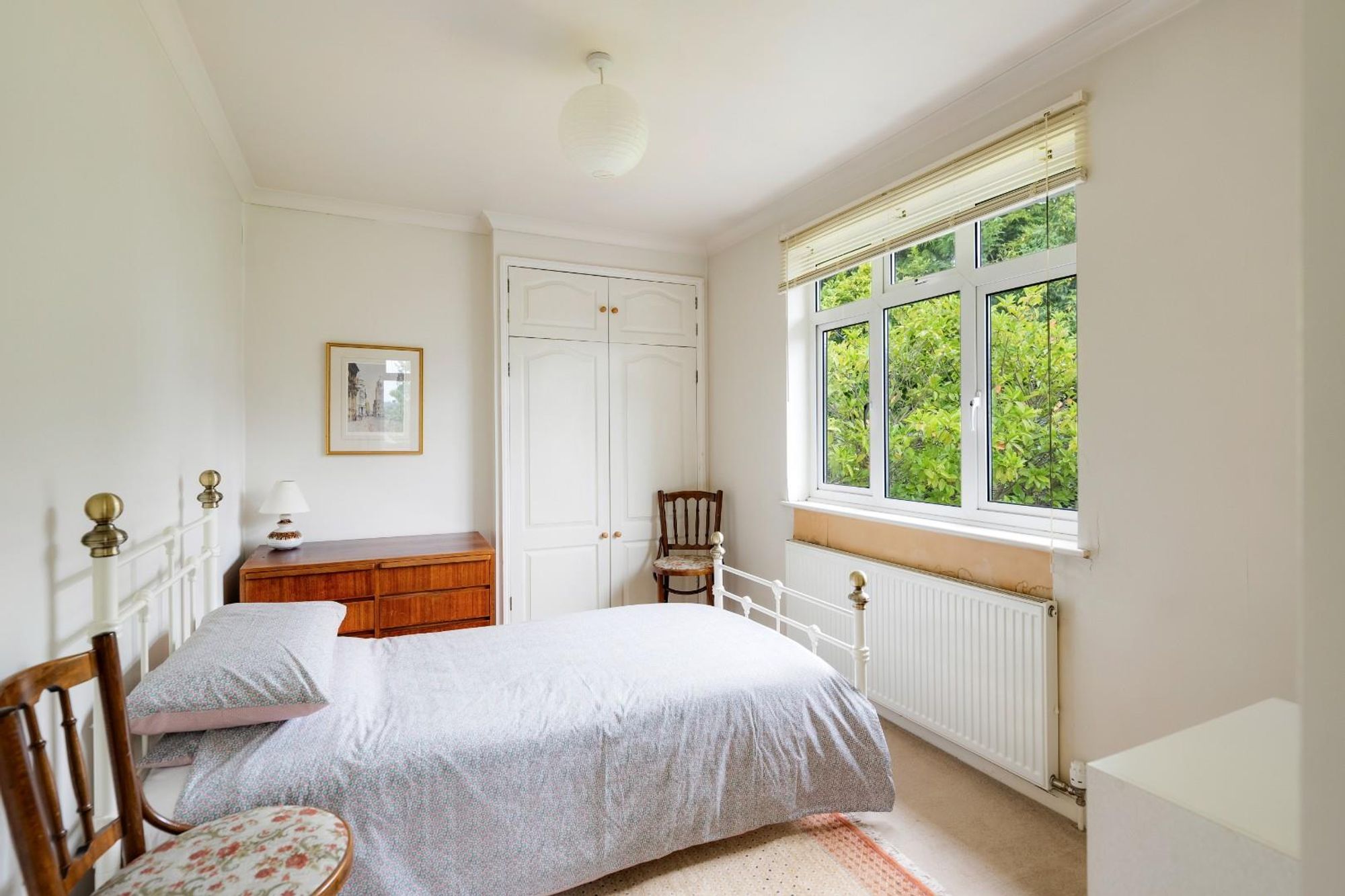Upstairs, a stained glass window adds a beautiful decorative note to the stairwell, gently filtering natural light across the landing. All three bedrooms are finished with soft carpeting and retain a sense of calm and comfort. The generous primary double bedroom features built-in wardrobes and space for a dressing table. The second double bedroom also includes built-in storage and leads, via a wooden bi-fold door, to a third bedroom which offers flexibility as a study, guest room or nursery.