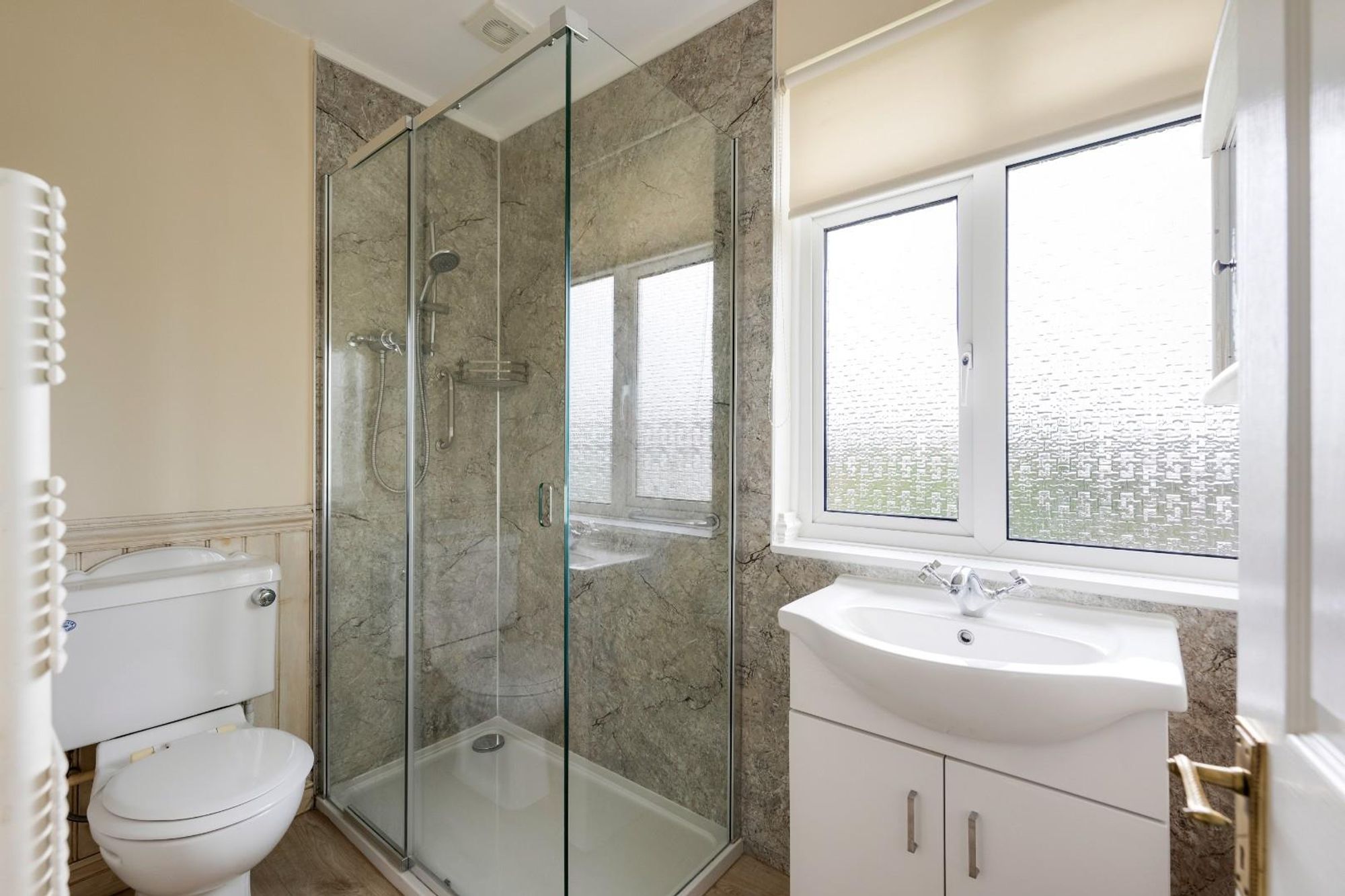 The well sized, modern family bathroom features a glass walk in shower, white vanity unit under the basin and heated towel rail.