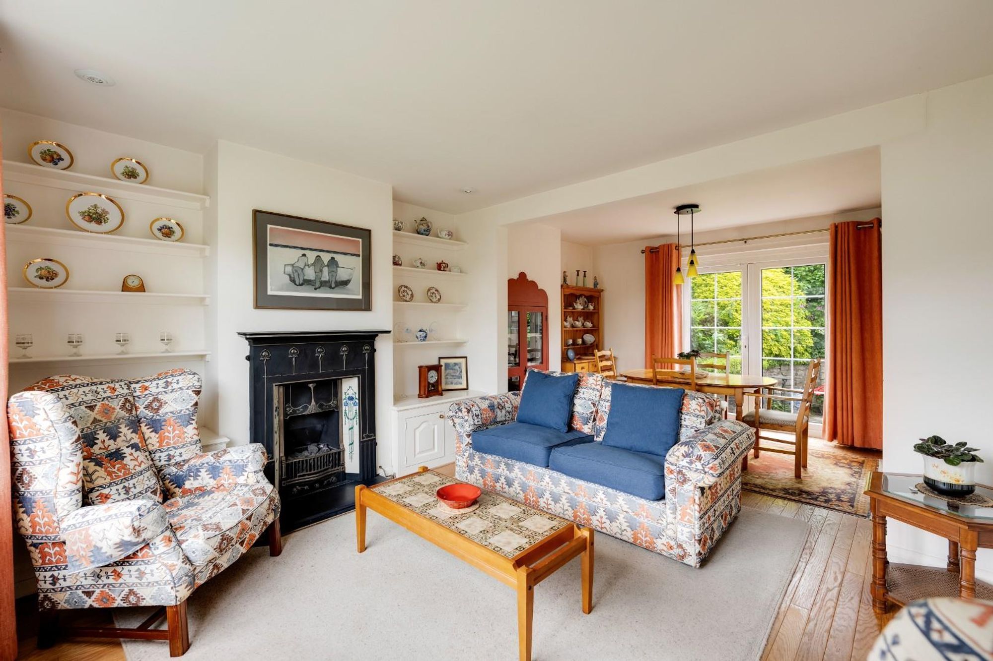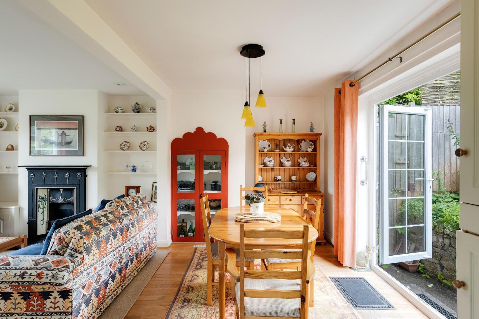 To the front, the living area is arranged around an elegant fireplace, flanked by built-in storage within the alcoves. Beyond, the dining area features further cabinetry surrounded by characterful framing, creating a practical and atmospheric space to gather. The kitchen is fitted with classic neutral shaker-style cabinetry, providing plenty of storage and space for integrated appliances. French doors lead directly onto a private south-facing courtyard garden with raised flower bed, enclosed by established planting creating a calm and private area.