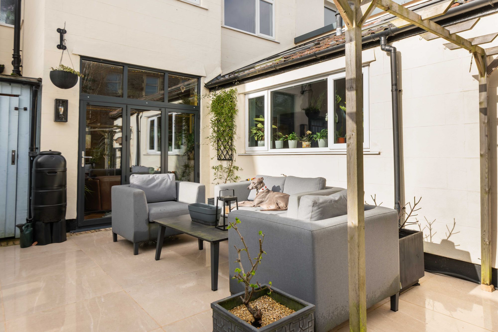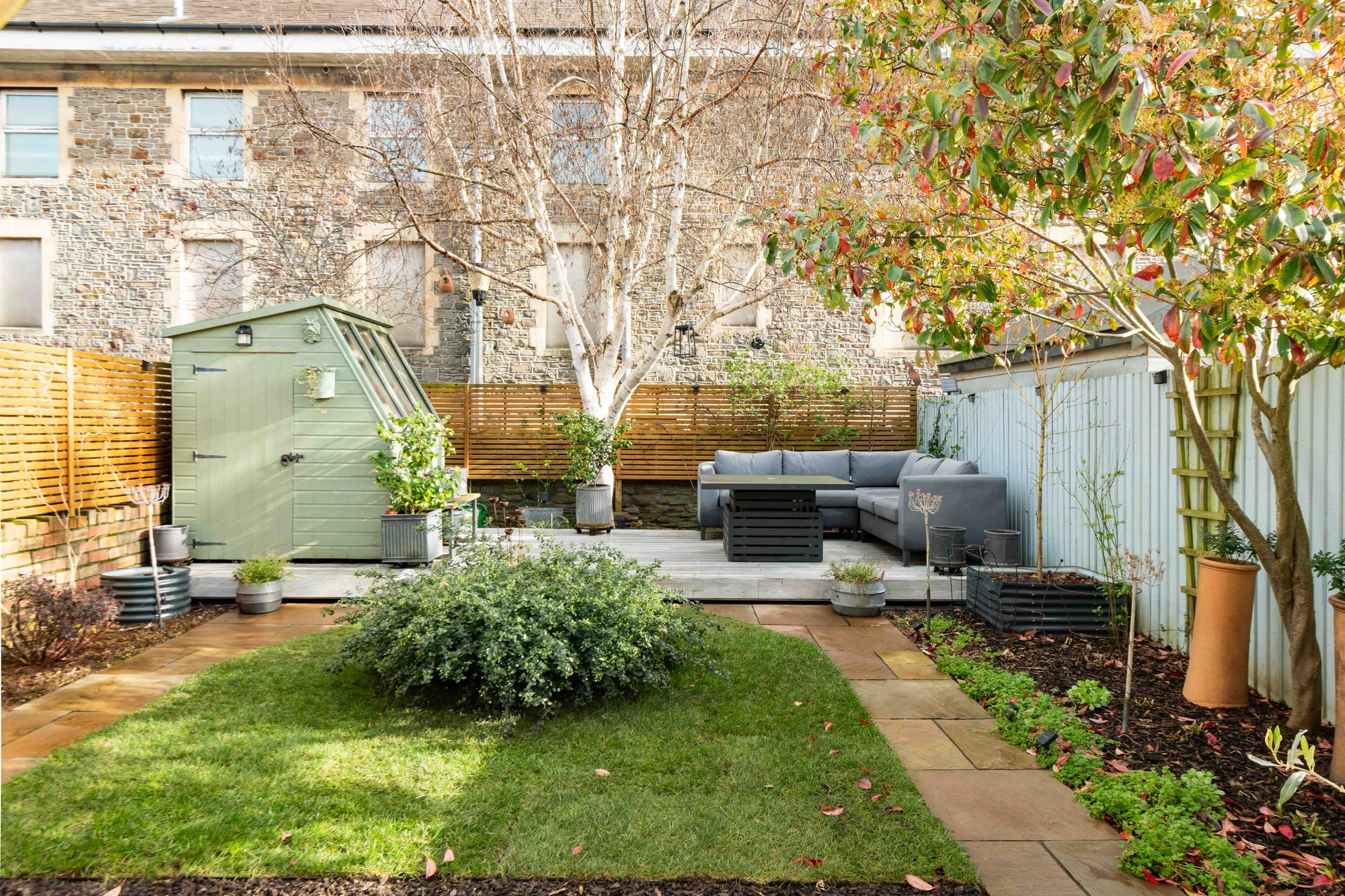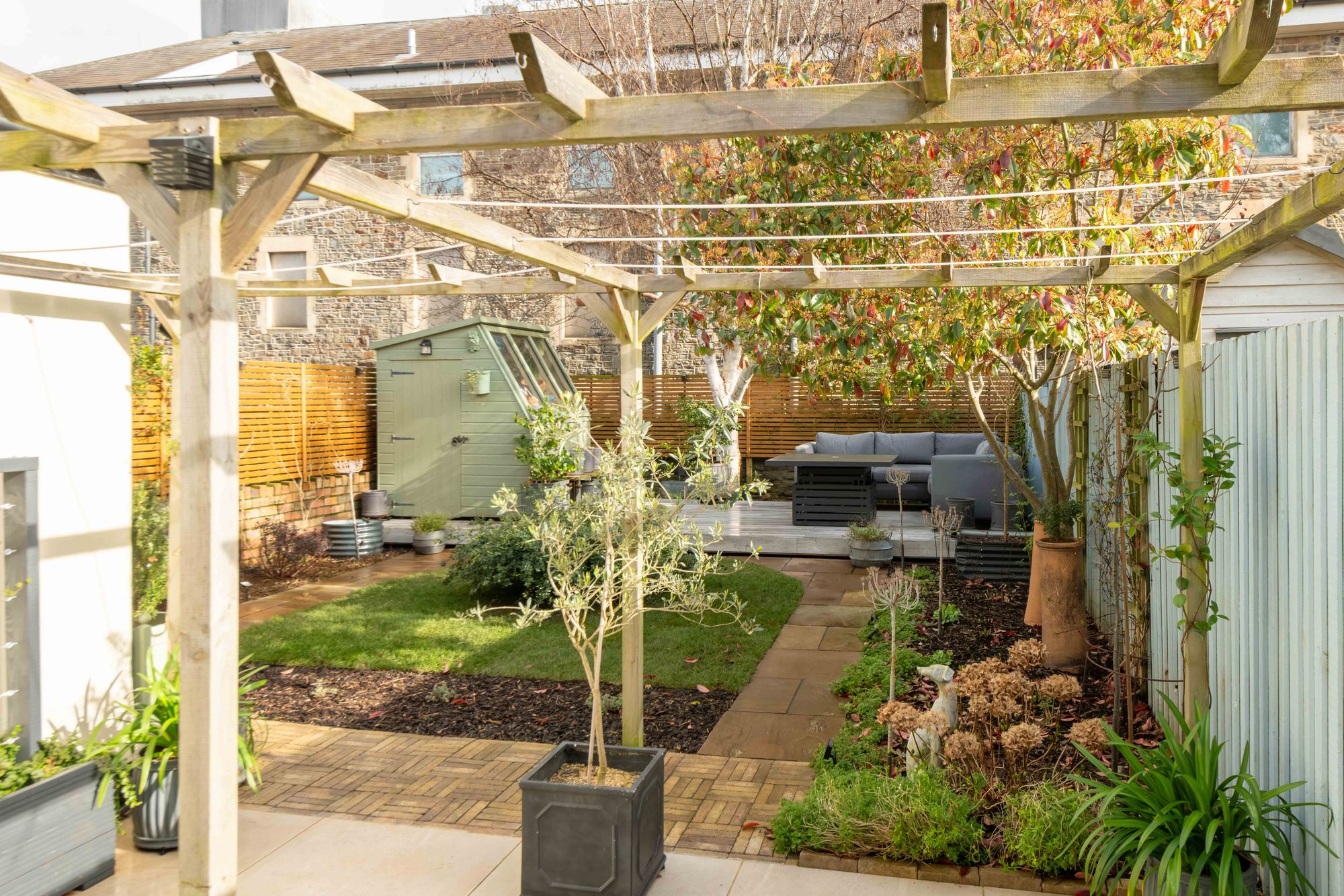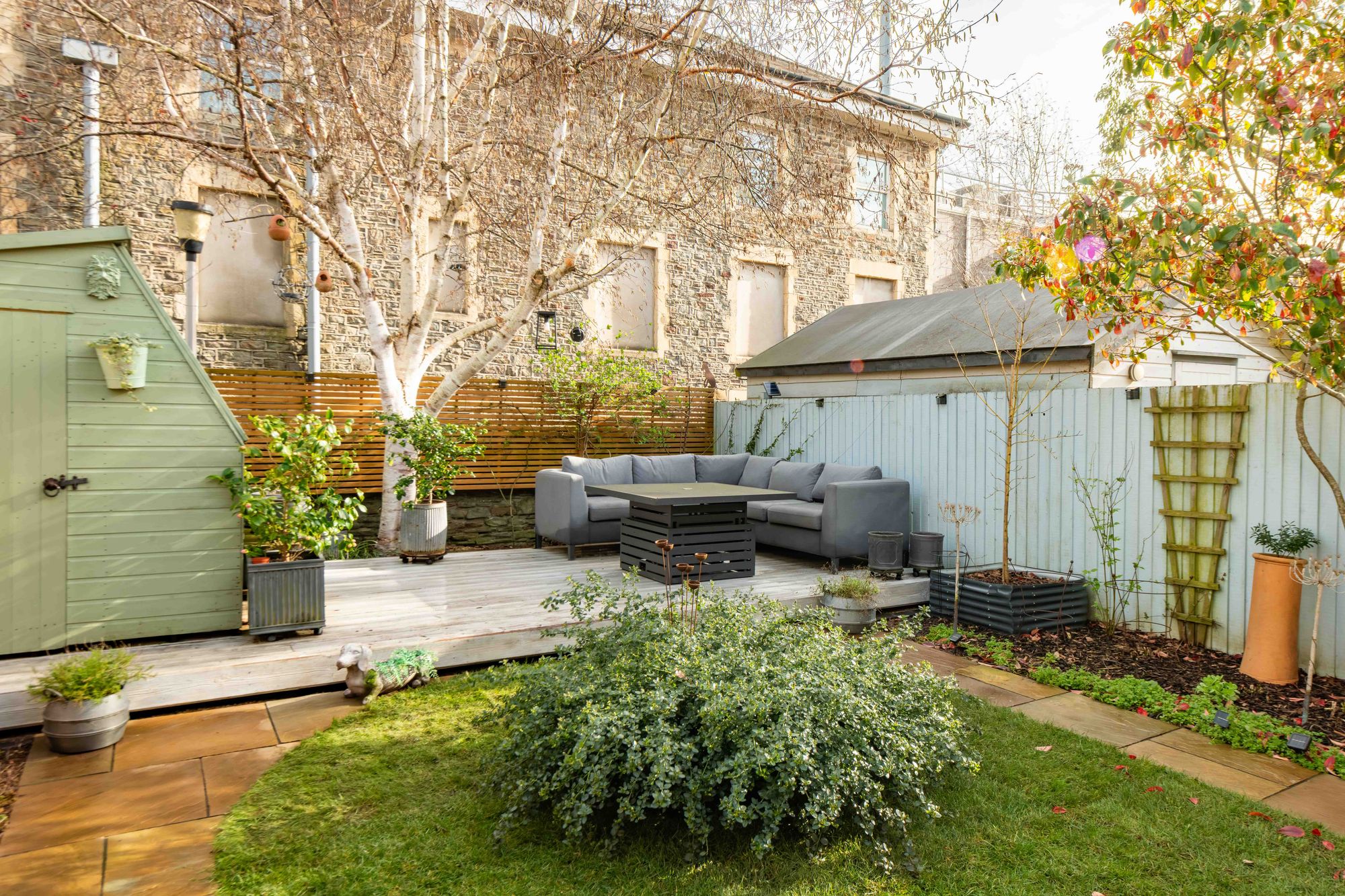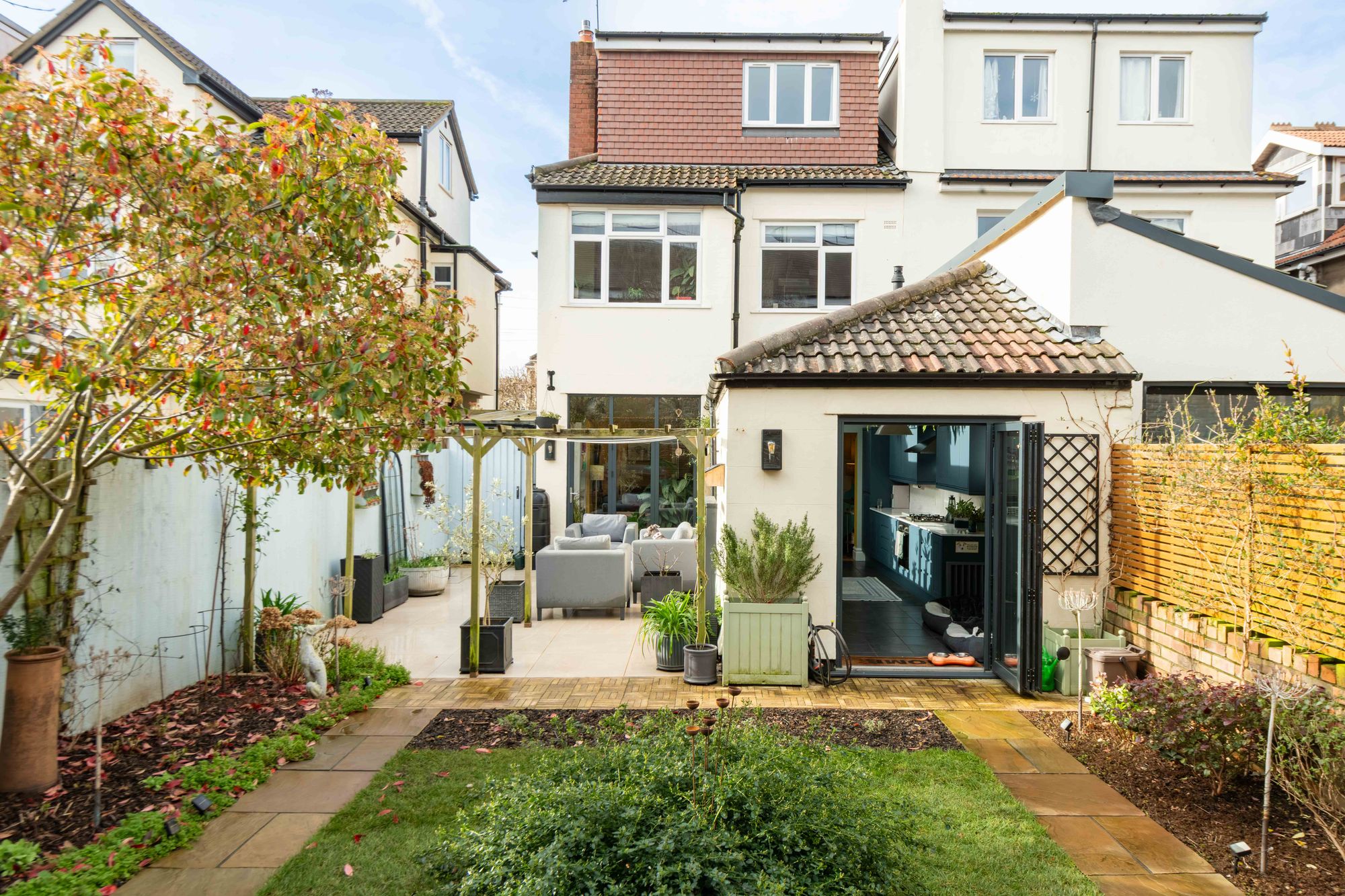 The garden has been fully landscaped and features a great range of mature trees and shrubs along its borders, as well as a porcelain-tiled patio area for al-fresco dining, partly covered by a timber pergola and accessible via wide bi-fold doors and a side gate. A central lawn is bordered by paved paths leading onto a raised decked seating area constructed just two years ago of IRO charred timber, which basks in afternoon and evening sunshine in the summer months. Additionally, there is a timber-framed storage shed and a combination of contemporary horizontal fencing, lap-panel fencing, and a wall enclosing the garden.