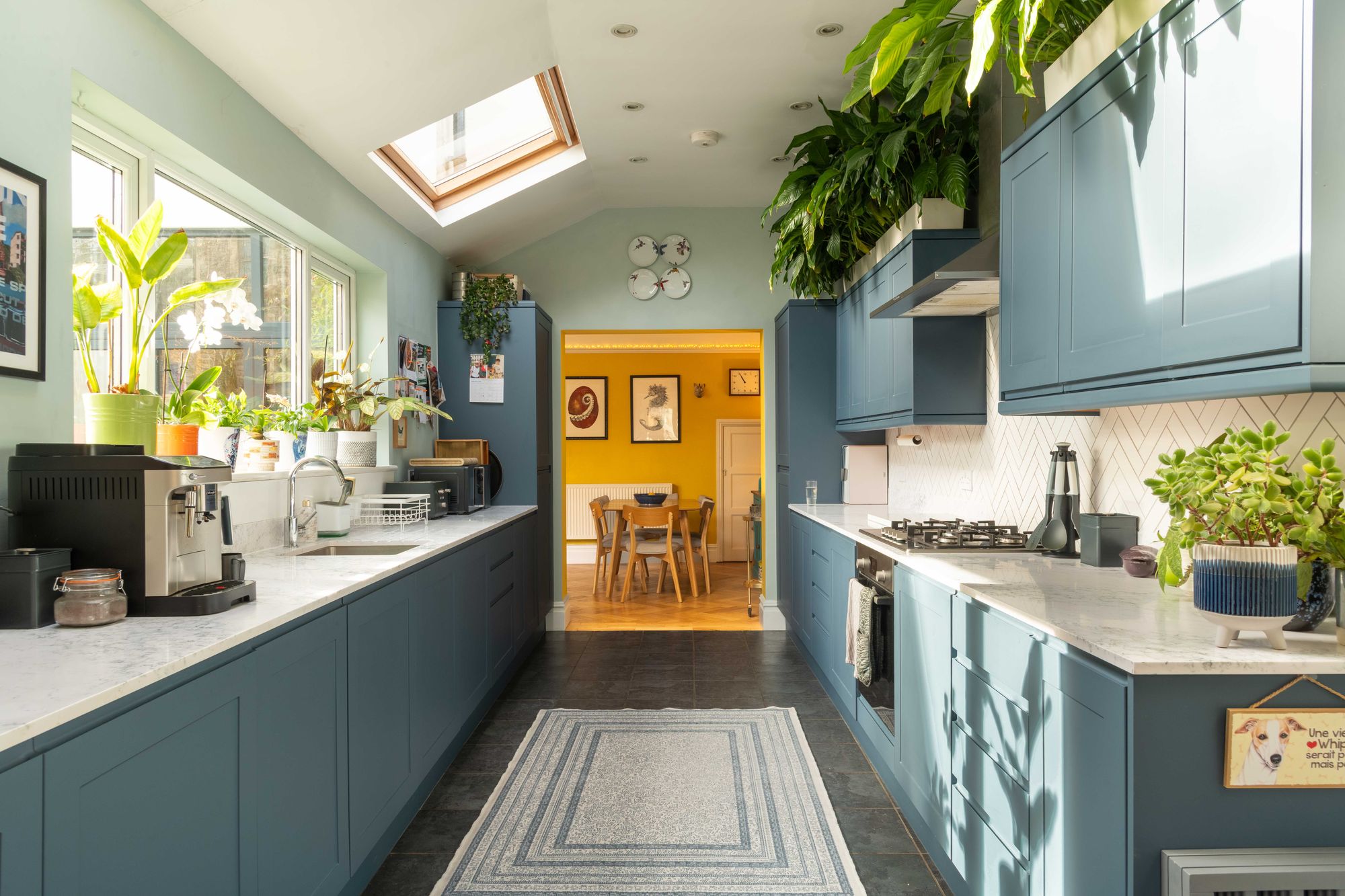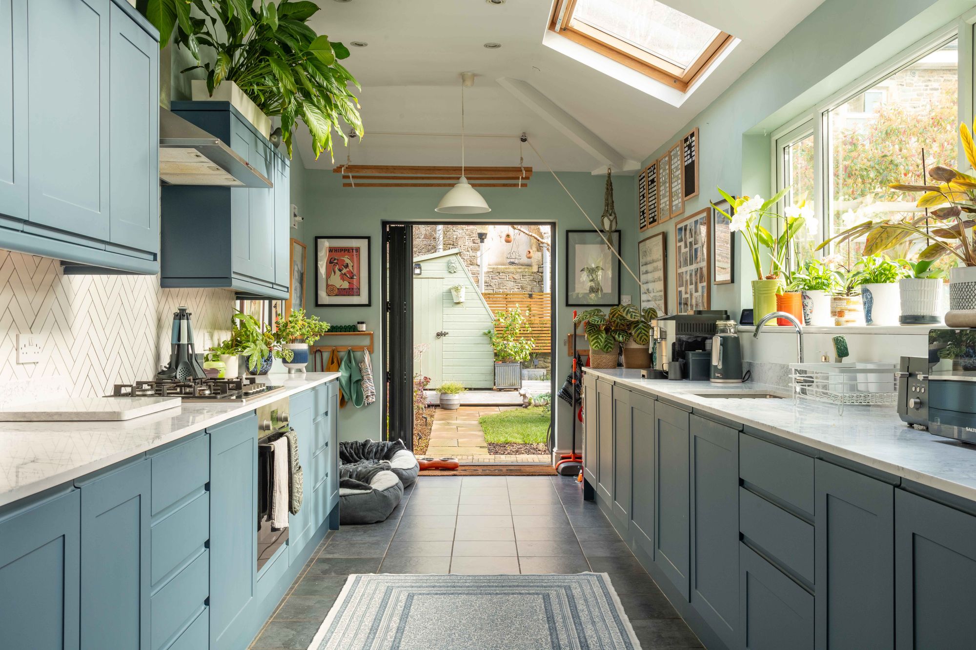 The spacious sitting room extends the entire width of the property and features double-glazed bay and picture windows to the front, cornice and a gas-fueled, period-style fireplace. At the rear, the family/dining room is bathed in natural light through floor-to-ceiling bi-doors and windows that connect seamlessly to the rear garden. The room retains built-in bookshelves, cornice, picture rail, a wood-burning stove and is open to the kitchen. The kitchen extends an impressive 7m in length and has an additional set of bi-folding doors onto the rear garden, as well as two large skylight windows, allowing an abundance of natural light into the home. A range of handleless contemporary units offers plenty of storage alongside integrated appliances, including a gas hob and an electric oven with an extractor fan over.