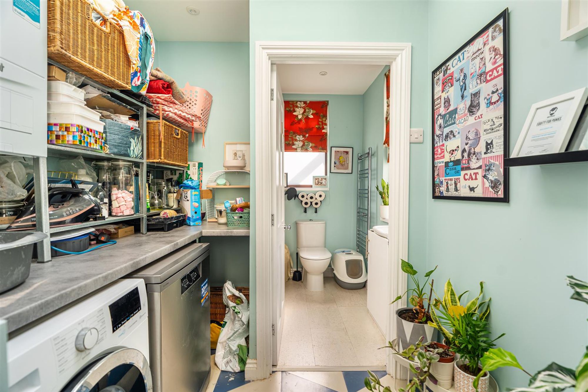 A hallway leads through to the back of the house where there is an impressive kitchen-diner. The kitchen features a range of contemporary units, a central kitchen island, and geometric floor tiles. At the rear of the property is a helpful utility room and a downstairs W/C. A glazed panel door leads out to the rear garden.