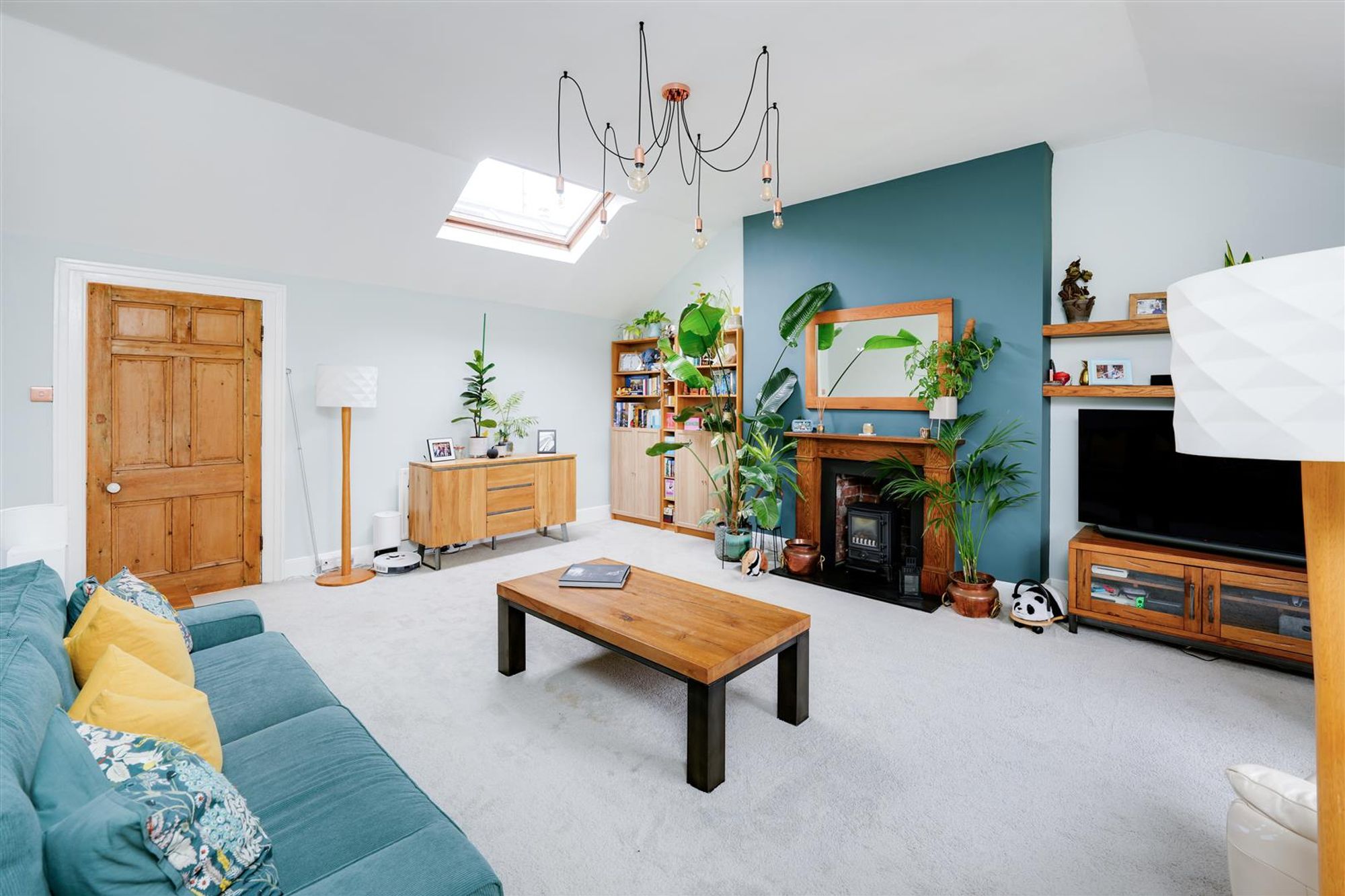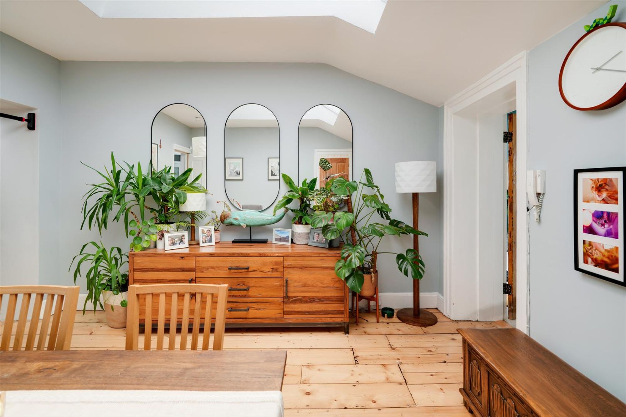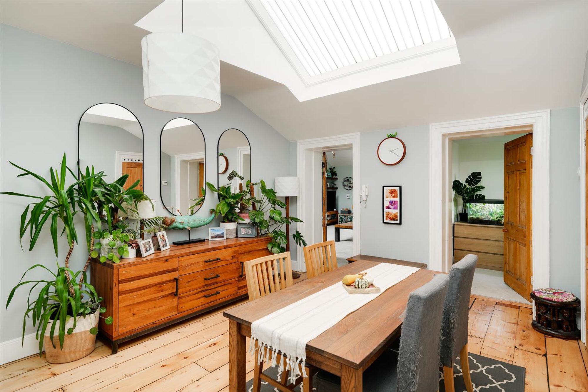 The living room is large at circa 32m2 (344 sq ft), and features a gas fire with character surround, vaulted ceilings with a skylight and a large panel-glazed sash window providing treetop views over the surroundings.