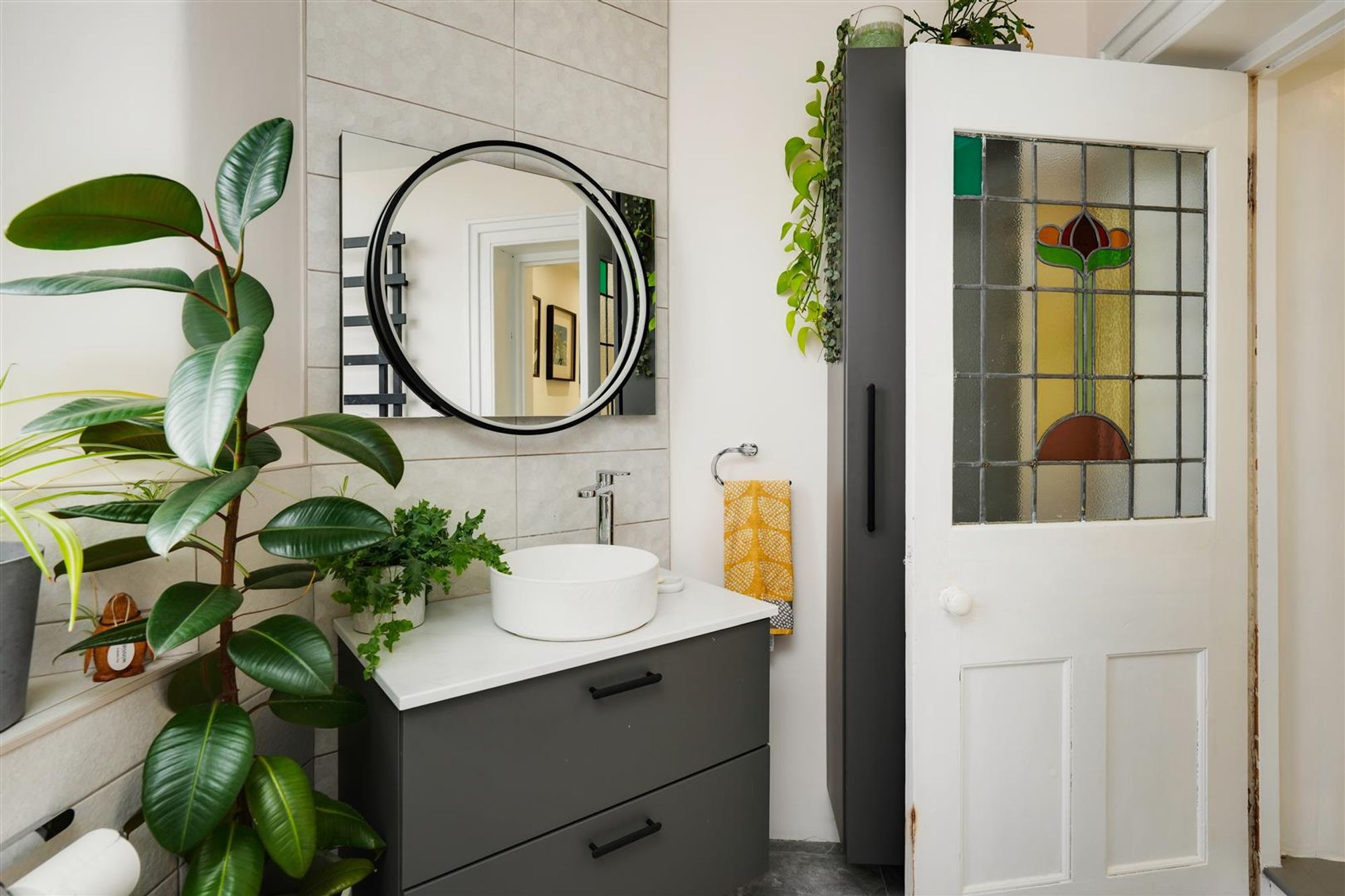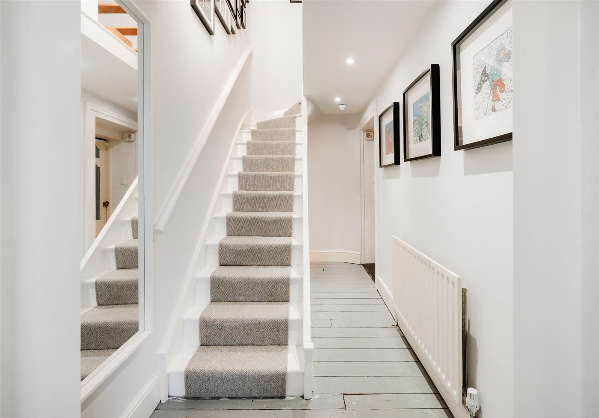 Once inside, you are met with an entrance hallway and staircase leading up to the main accommodation. At the bottom of the stairs is a smartly finished bathroom with a shower/bath, toilet and wall-hung vanity sink unit. The room receives lots of natural light via the characterful panel-glazed sash window.