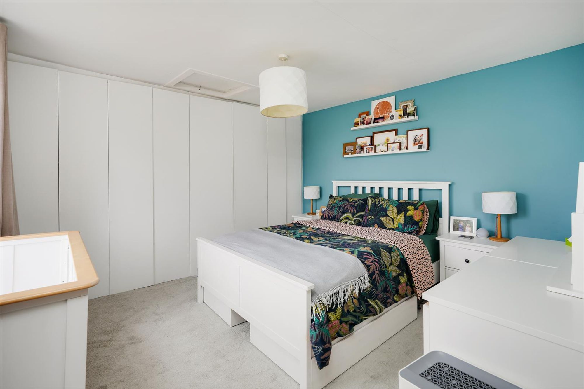 Leading off the living space is the master bedroom. The panel-glazed sash window shares the same aspect with the living room. This room has a wall of built-in wardrobes spanning the width of the room, offering excellent storage.