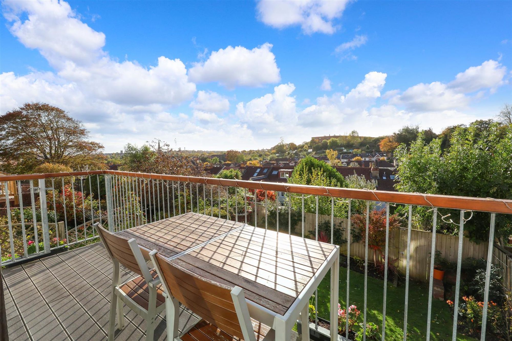 The kitchen and dining space, designed and built by Moon Design & Build, extends across the back of the home with contemporary cedar cladding adding a modern contrast to the period façade. Grey shaker-style cabinetry pairs beautifully with sleek white worktops, offering abundant storage and space for integrated appliances. The dining area sits beneath skylights that flood the room with natural light, and dual-aspect windows provide far-reaching views over the city. At the rear, bi-fold doors open to a balcony, an ideal spot for morning coffee or evening drinks watching the sunset, with steps leading down to the garden.