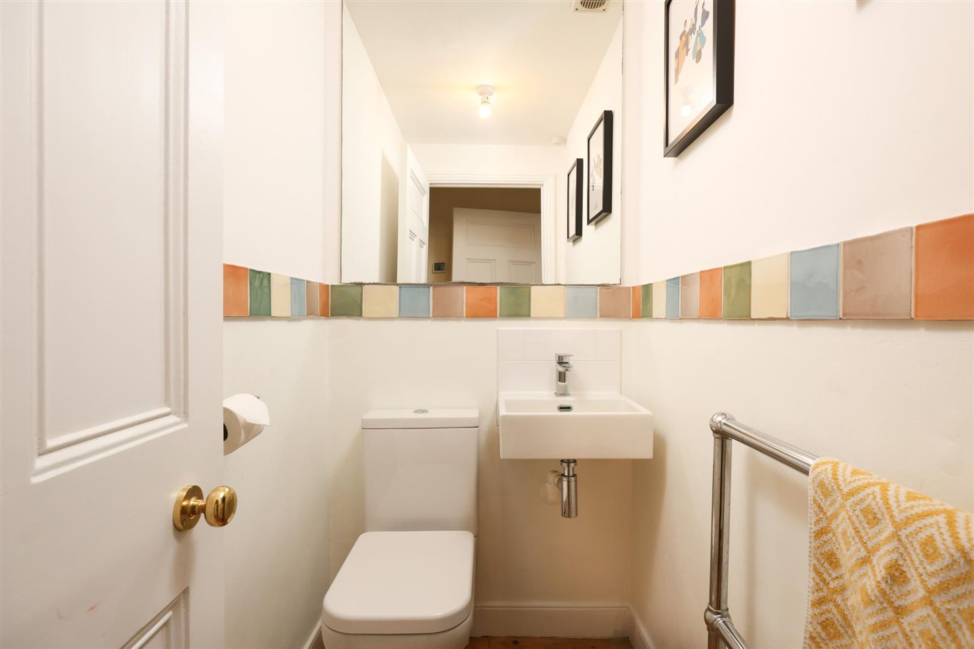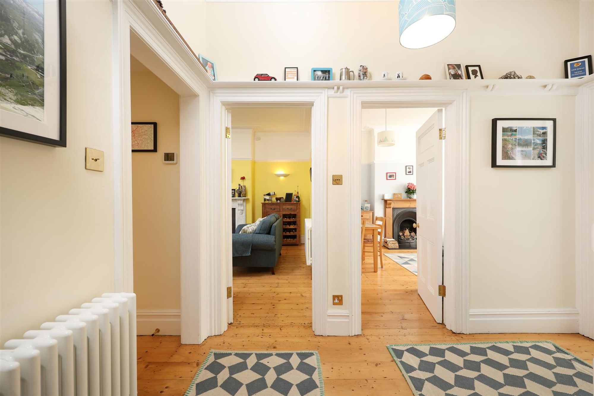 The entrance porch, with its original patterned floor tiles, offers direct access to both the rear garden and the main hallway. Inside, stripped wooden floorboards extend through the reception rooms, and cast iron radiators feature throughout the home, highlighting the home’s period character.