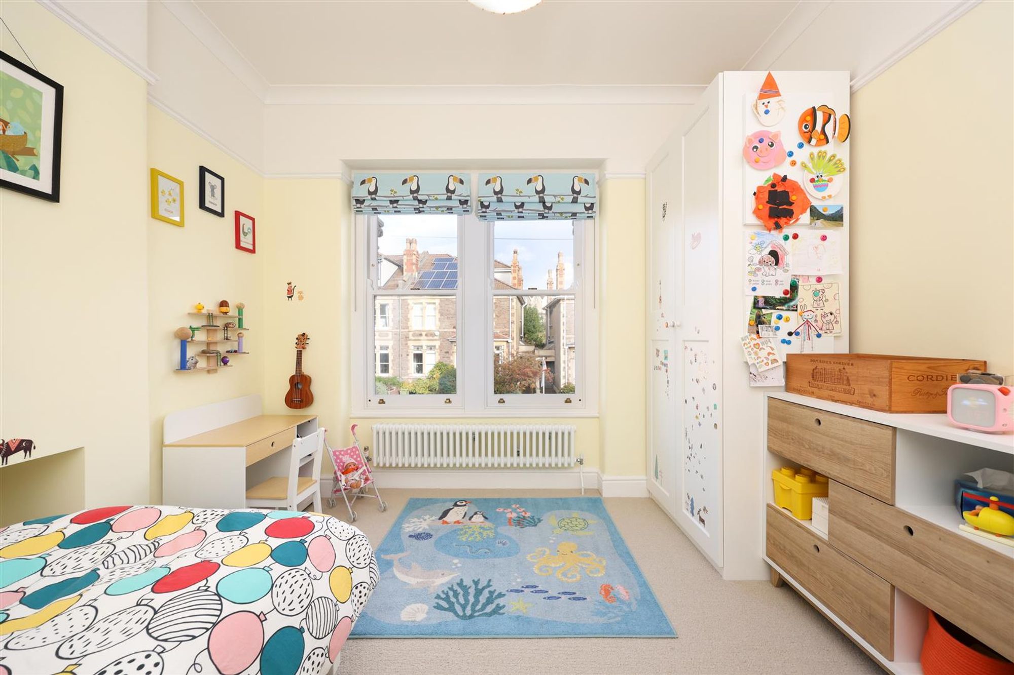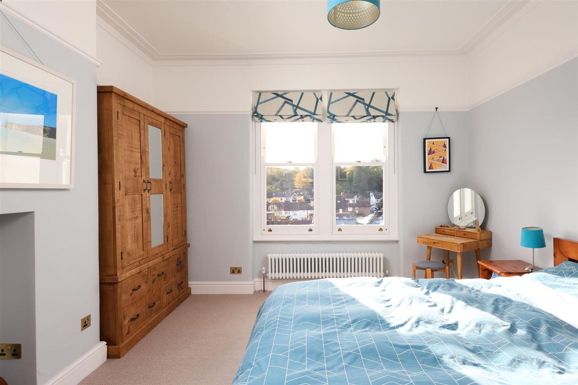 On the first floor are four well-proportioned bedrooms and a family bathroom. Soft neutral carpeting extends throughout, creating a sense of calm and continuity. The spacious primary bedroom is painted in soothing blue tones and includes a central fireplace, ceiling rose and space for wardrobes within the alcoves. The second and third bedrooms are generous doubles, currently arranged as children’s rooms, while the fourth at the rear is used as a home office but would also make a comfortable guest room.