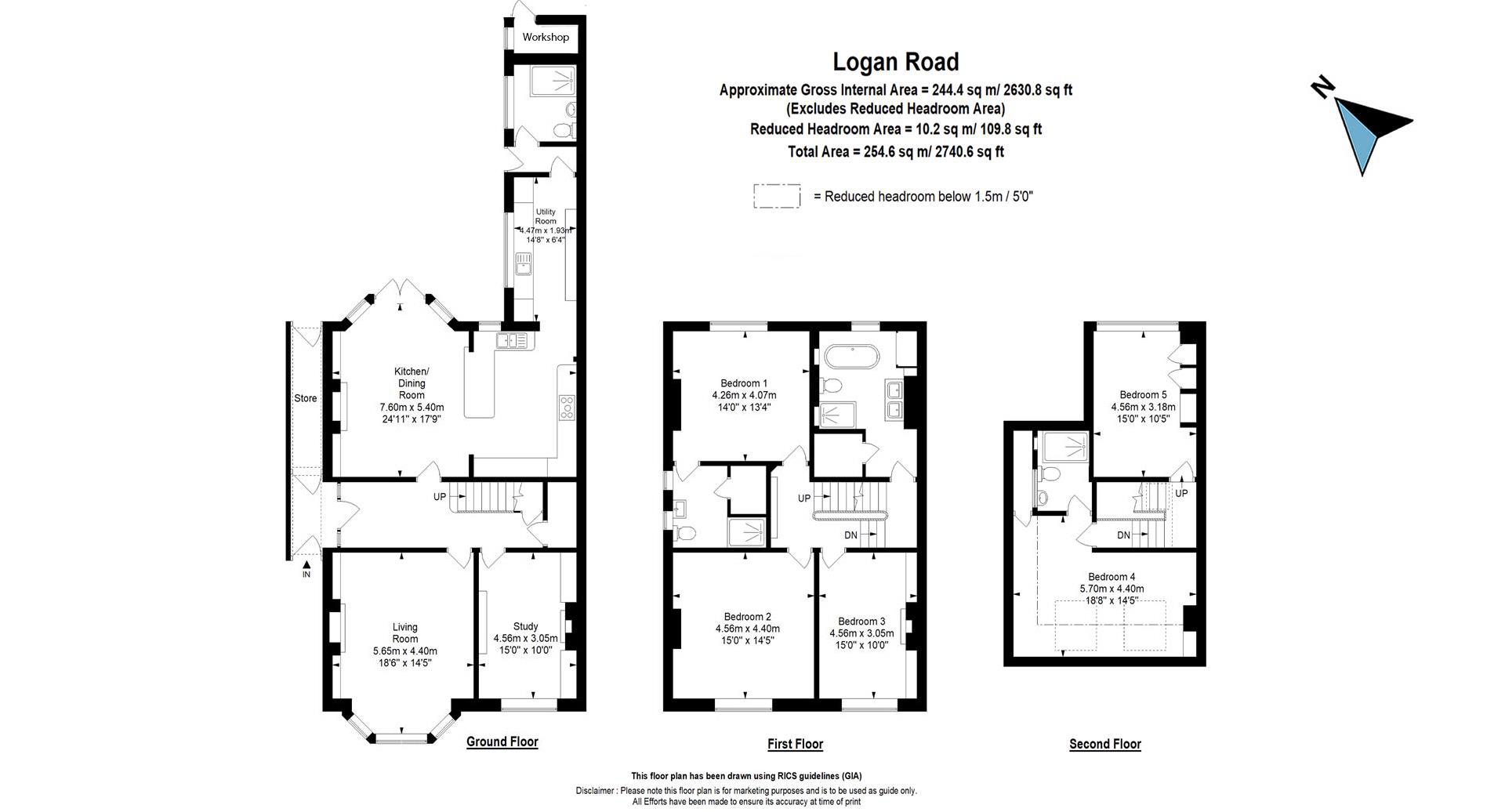 The 2,740sq ft. internal accommodation is split over three floors comprising a sitting room, study, kitchen/diner, utility room and shower room on the ground floor, and five bedrooms, a bathroom, and two ensuite shower rooms on the upper floors.