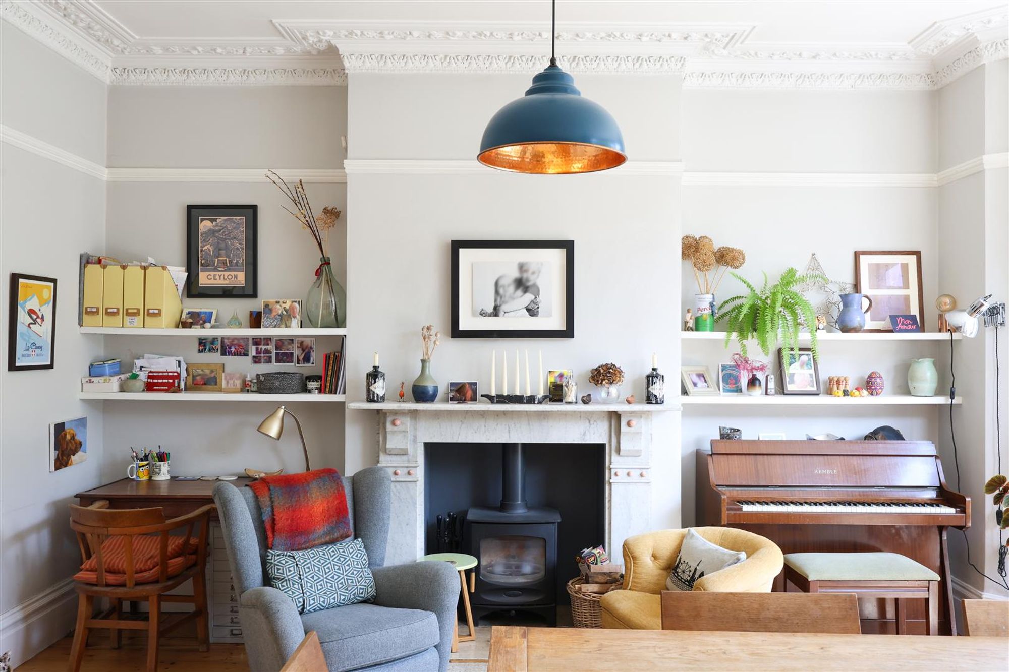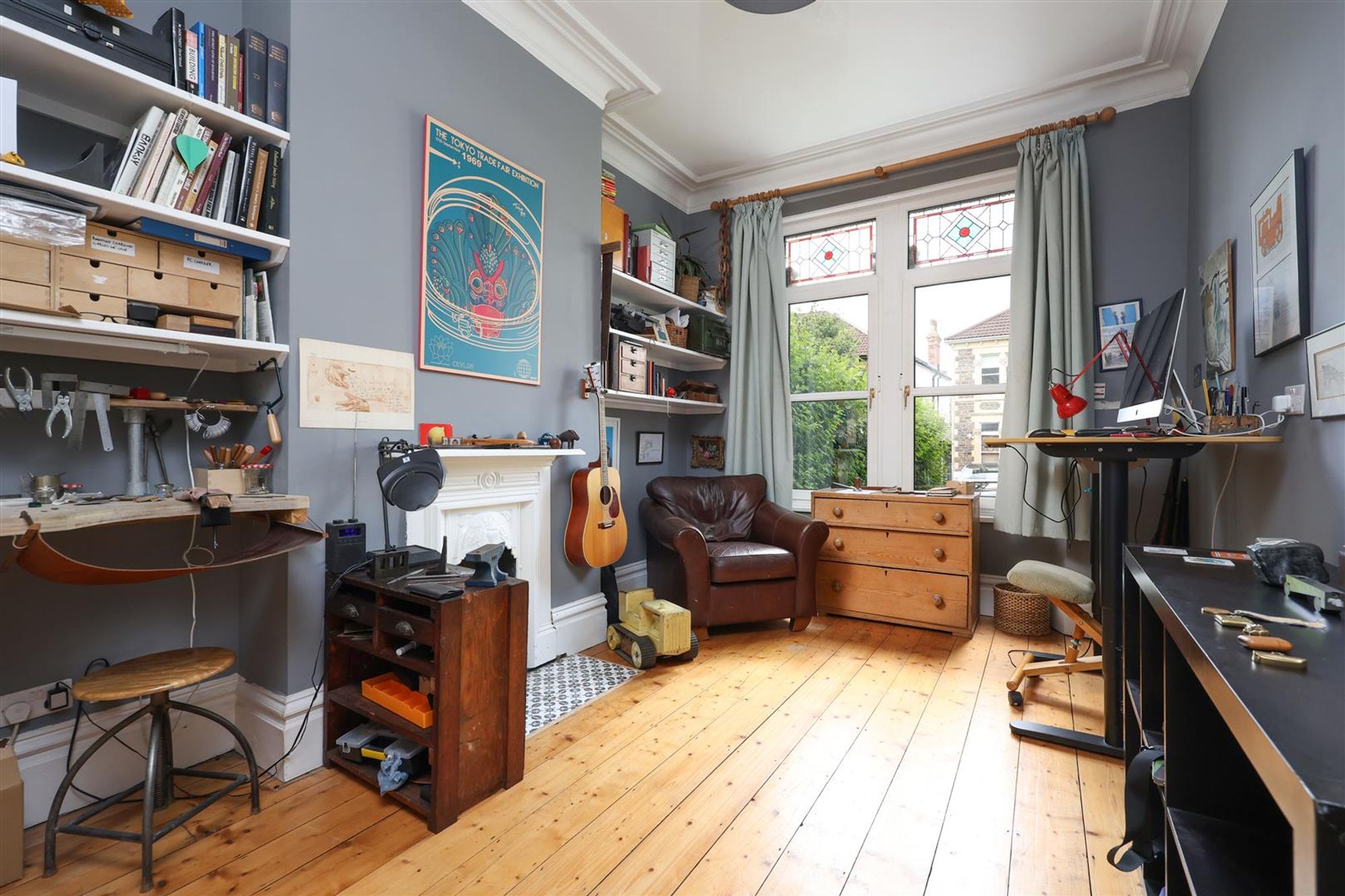 The classically proportioned sitting room has a blend of modern and period touches, including a contemporary wood burning stove with full glass frontage contrasting wonderfully against the period backdrop of decorative cornice, a ceiling rose, picture rail and stained glass leaded lights over double glazed bay windows. The adjacent study is used as a home office/workshop, featuring double-glazed windows with stained glass leaded lights over to the front, cornice, a feature period fireplace and stripped wooden floorboards.
