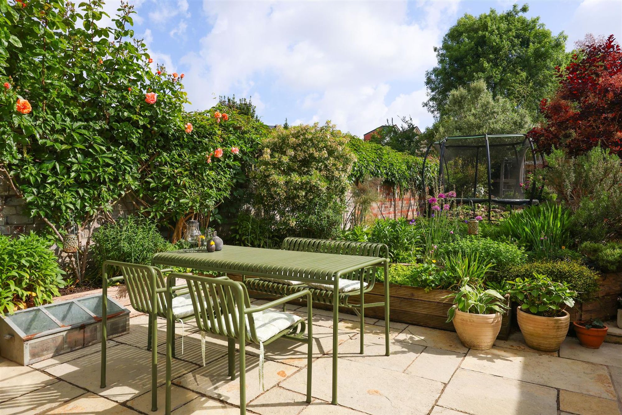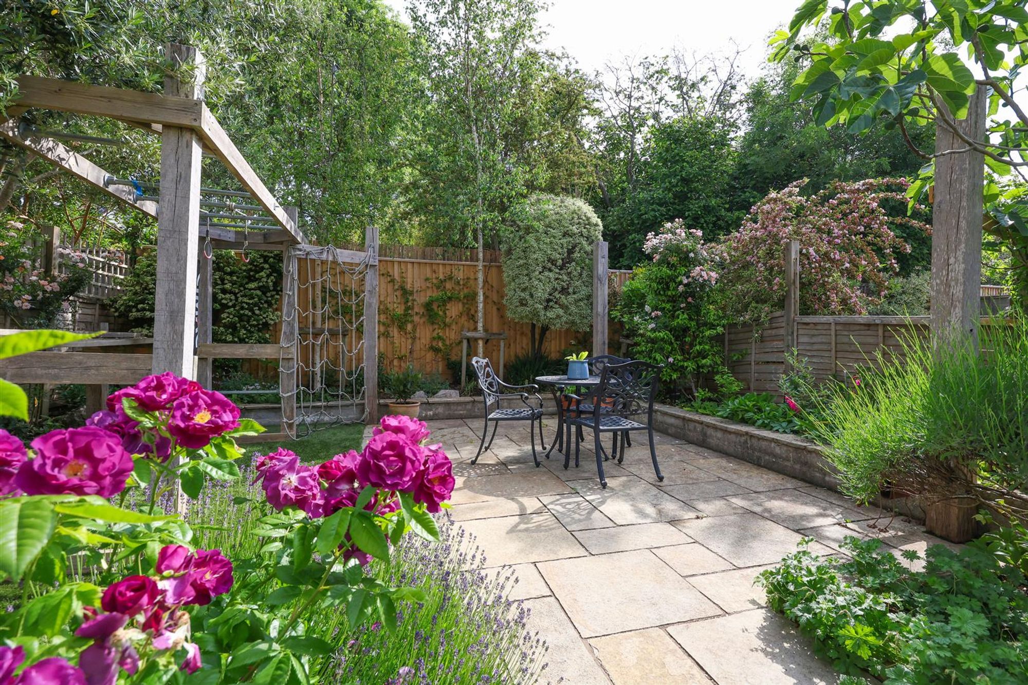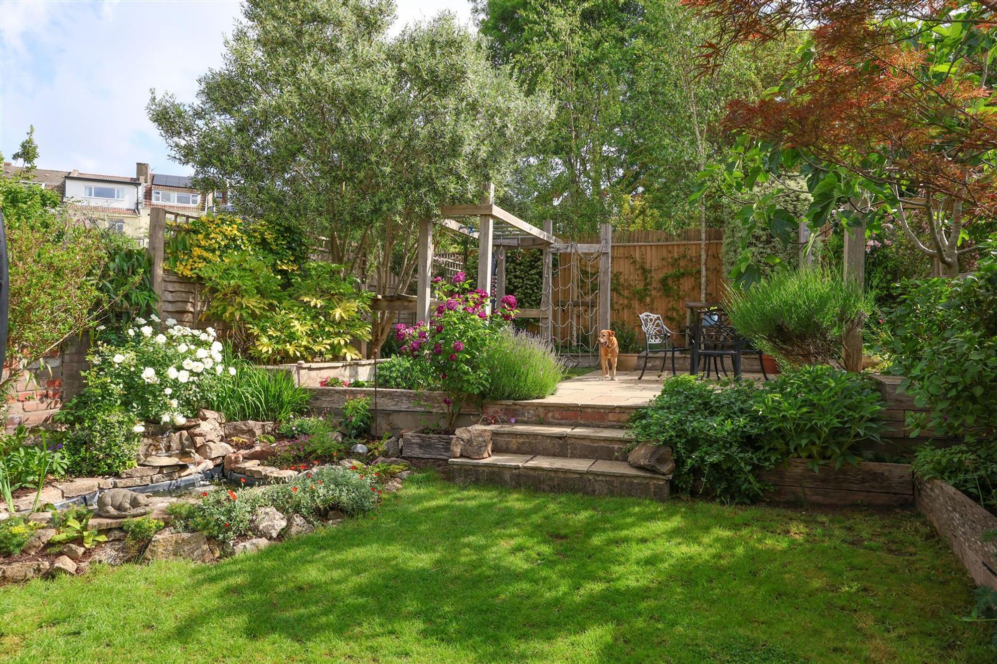 Externally, a surprisingly large 83ft rear garden enjoys a leafy backdrop of neighbouring gardens with a generous Indian sandstone patio seating area adjacent to the kitchen/dining room. A walkway leads through raised railway sleeper planters with mature and colourful shrubs to artificial grass leading to lawn with flower borders containing various plants and shrubs. Further steps lead up from the lawn to a top section of the garden, which provides an additional outdoor seating area, perfect for entertaining and a children's climbing frame. Garden shed, door accessing a garden store and a further door beside the property accessing the 'lean-to' bike store and outside tap.
