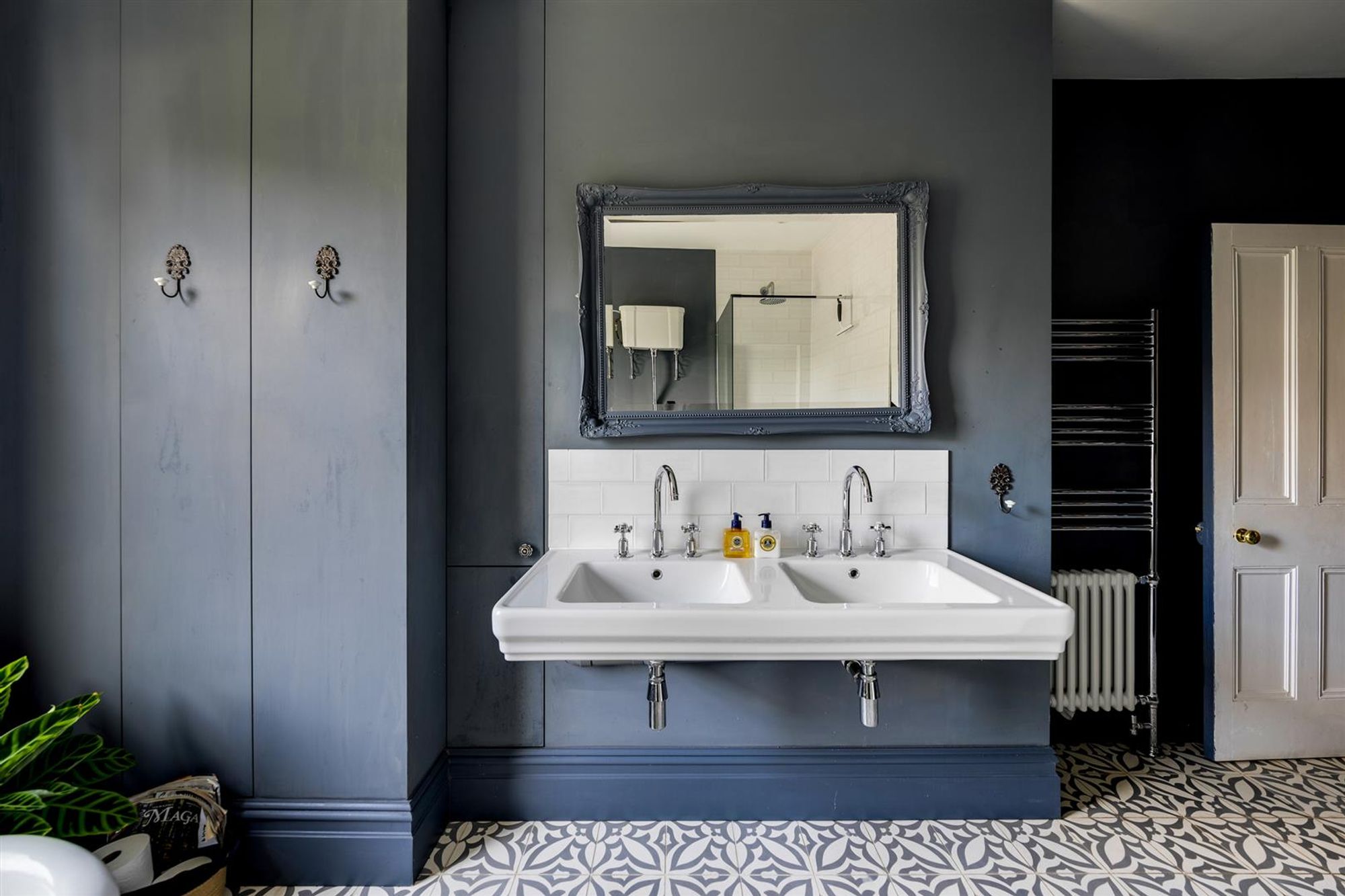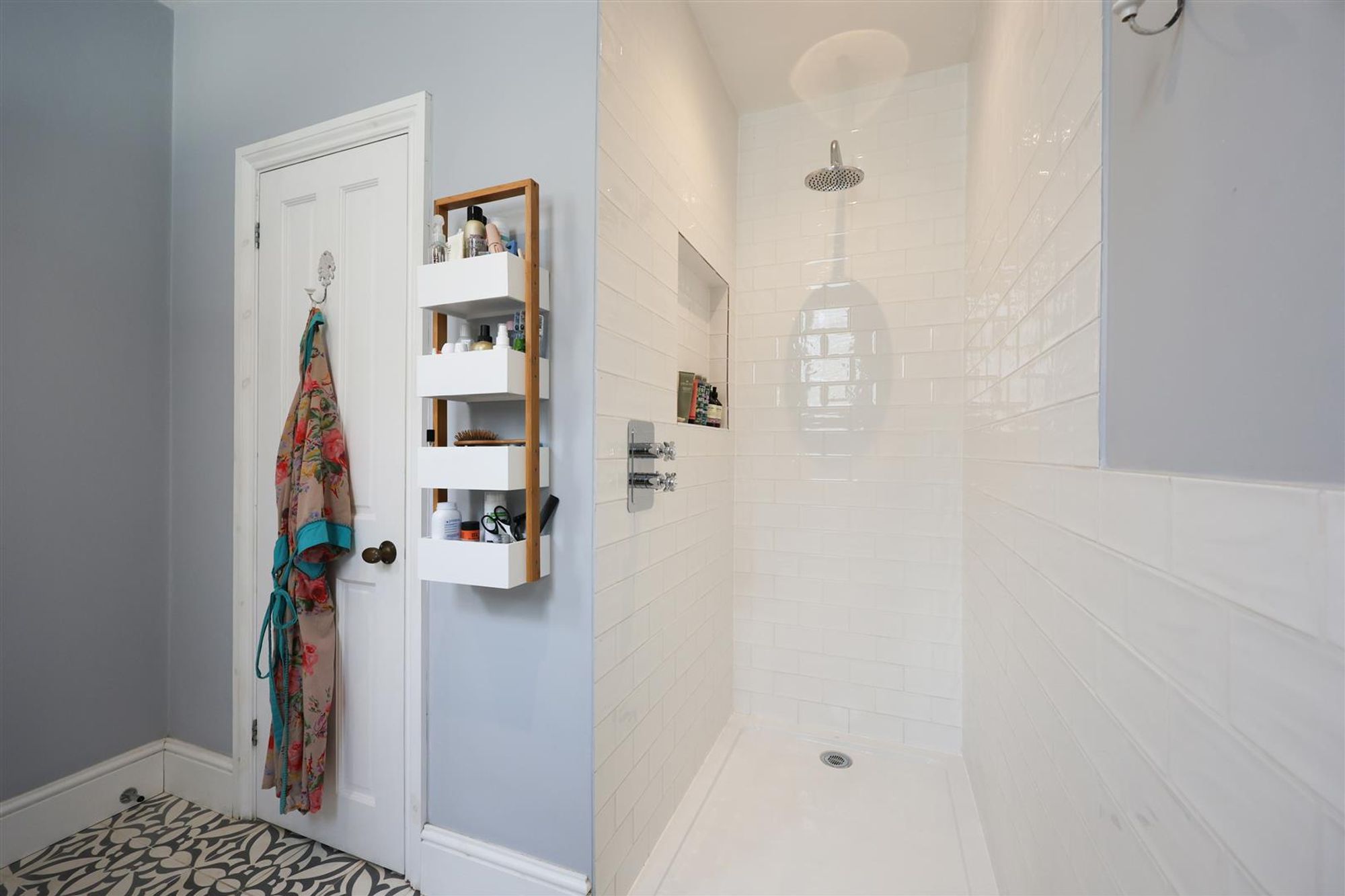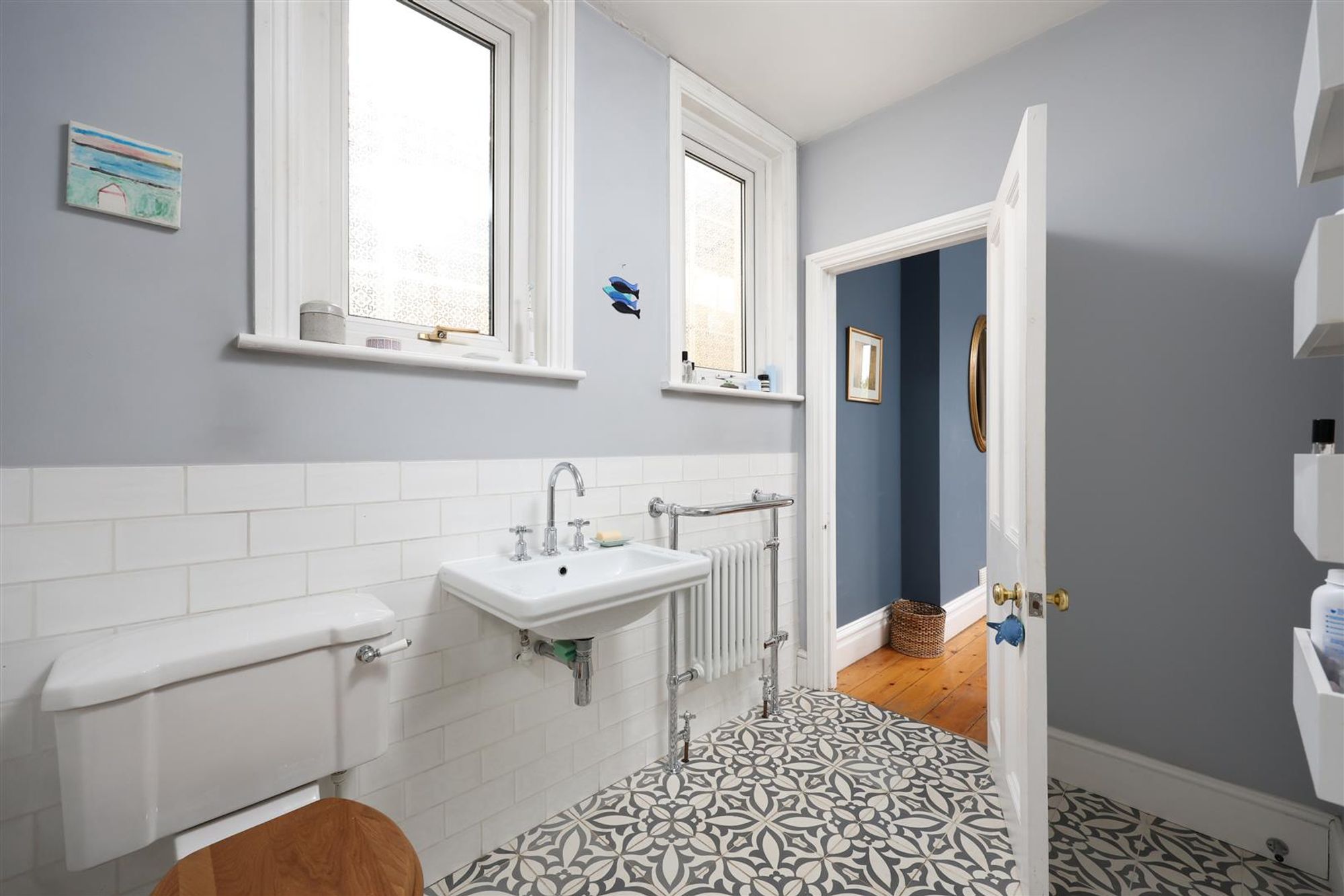 The first floor has three double bedrooms and a family bathroom. Bedroom one has double-glazed windows overlooking the rear garden and access to an ensuite shower room and walk-in wardrobe. The family bathroom on the half landing has a modern suite comprising a freestanding bath, walk-in shower, double-wash hand basins, and hidden storage.