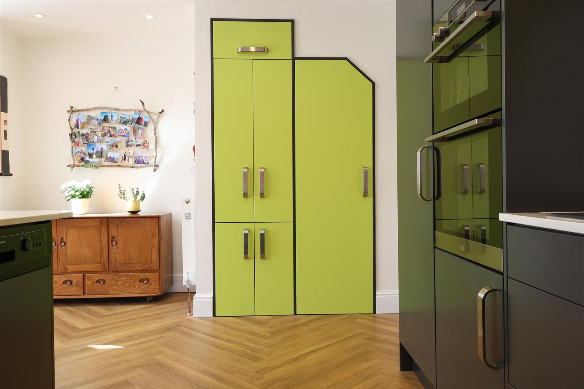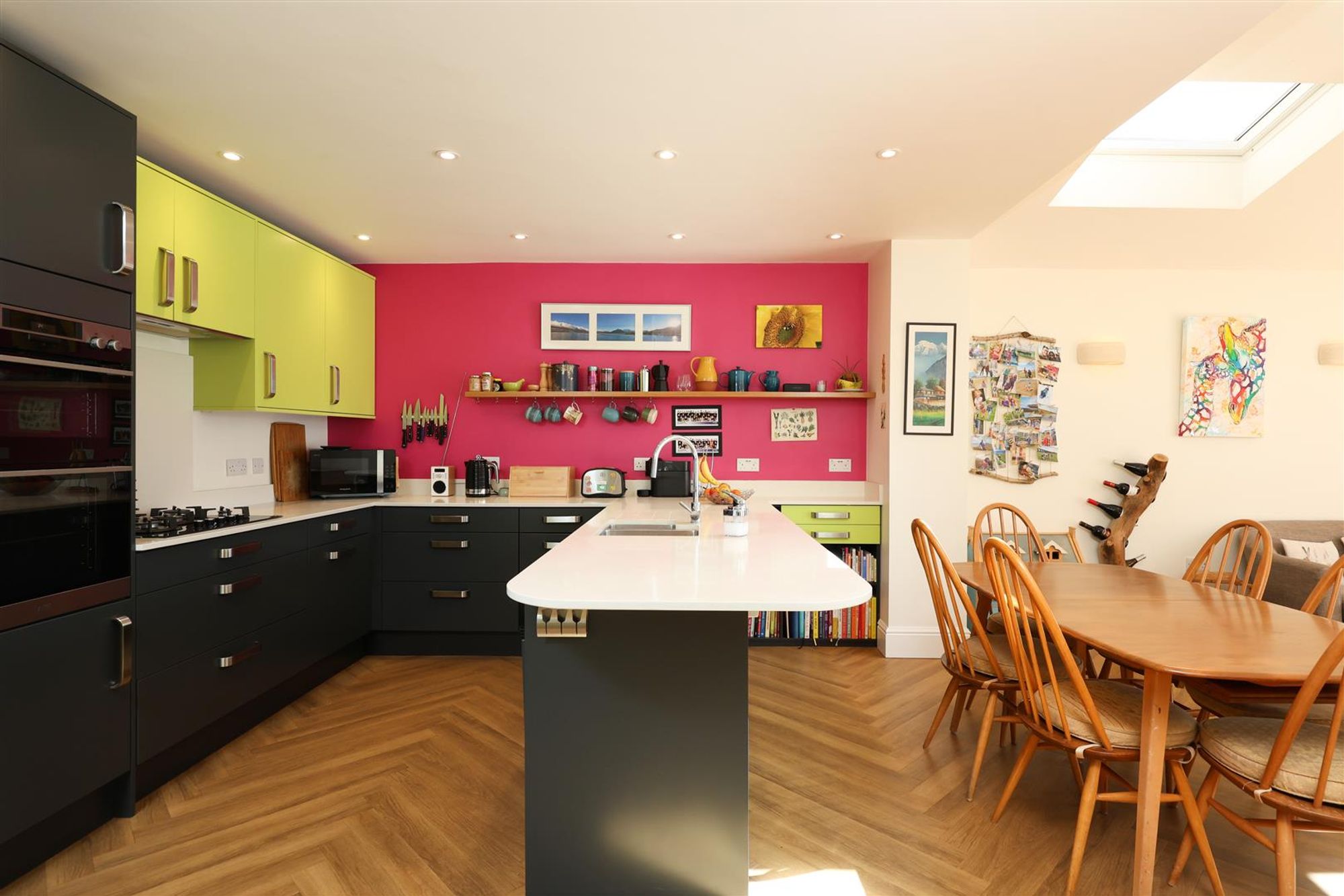 The sitting room to the front features a large square bay with UPVC double-glazed windows and inbuilt cabinetry/shelving to the chimney recesses. At the rear of the house is a well-designed kitchen extension, creating an open and social space that seamlessly connects to the garden. The room has herringbone flooring extending from the front door through to the rear, skylight windows and bi-fold doors. The kitchen area comprises a range of modern units and built-in appliances, including a dishwasher, gas hob, double ovens, a fridge/freezer, breakfast bar and pantry. A large utility room and WC is accessed via the kitchen with a door to the rear garden.