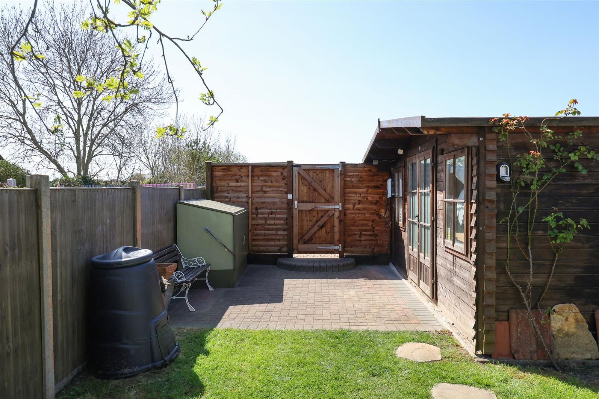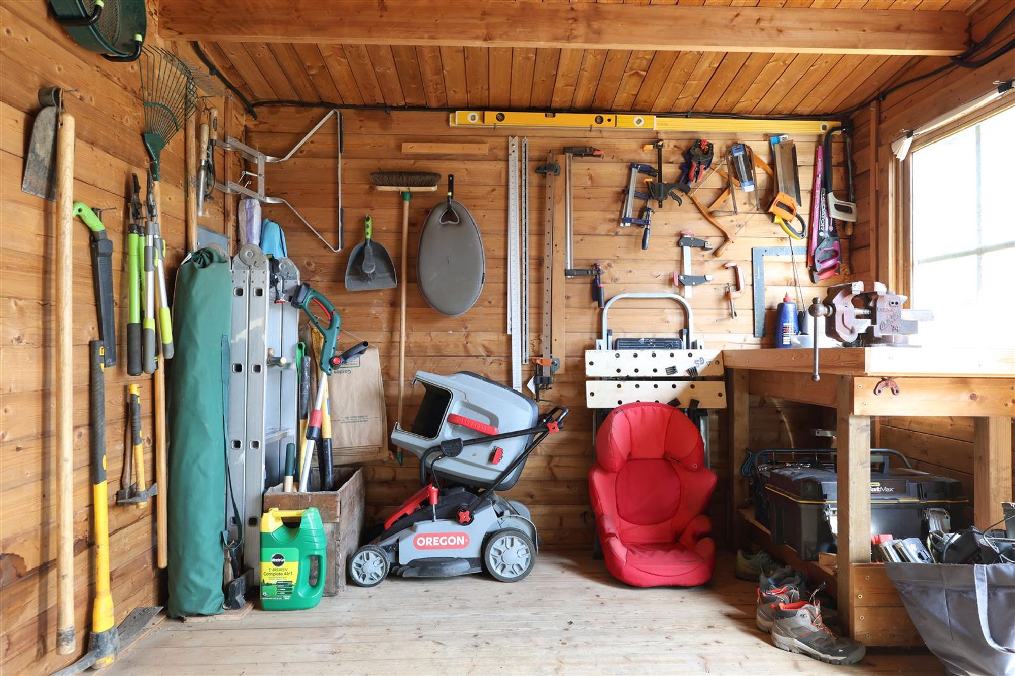 At the rear, the cleverly designed southwest-facing garden has an Indian Sandstone patio area (with an outside tap and weatherproof power point) leading directly onto the lawn, with raised beds to its borders and various colourful mature trees and shrubs. A central stepping stone pathway leads up through the lawn to an additional block-paved patio at the rear of the garden, a timber-framed workshop/storage shed with lights and power, and a gate leading onto two off-street parking spaces with an electric charging point.
