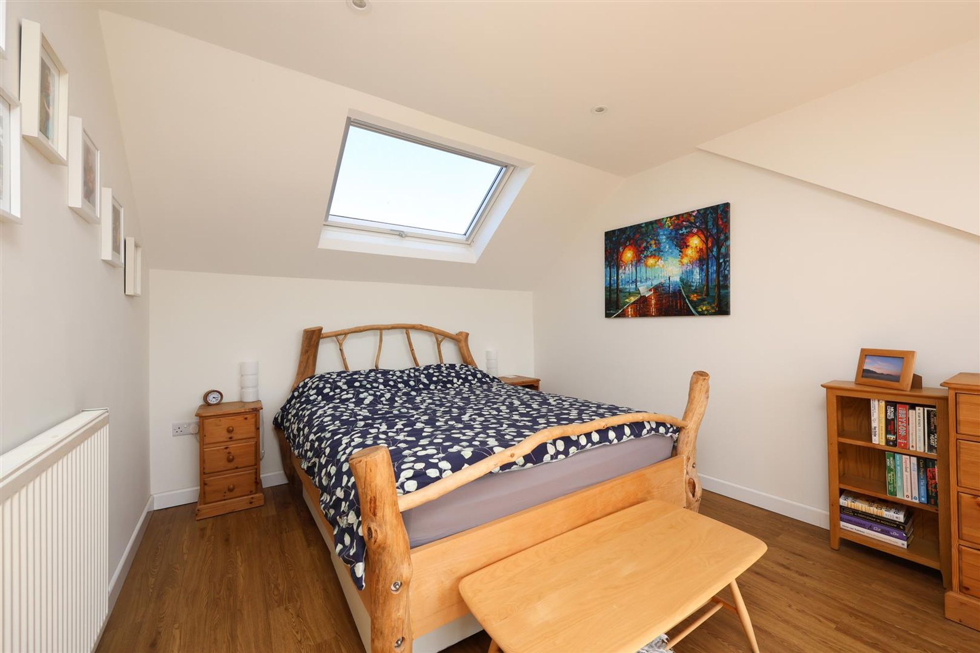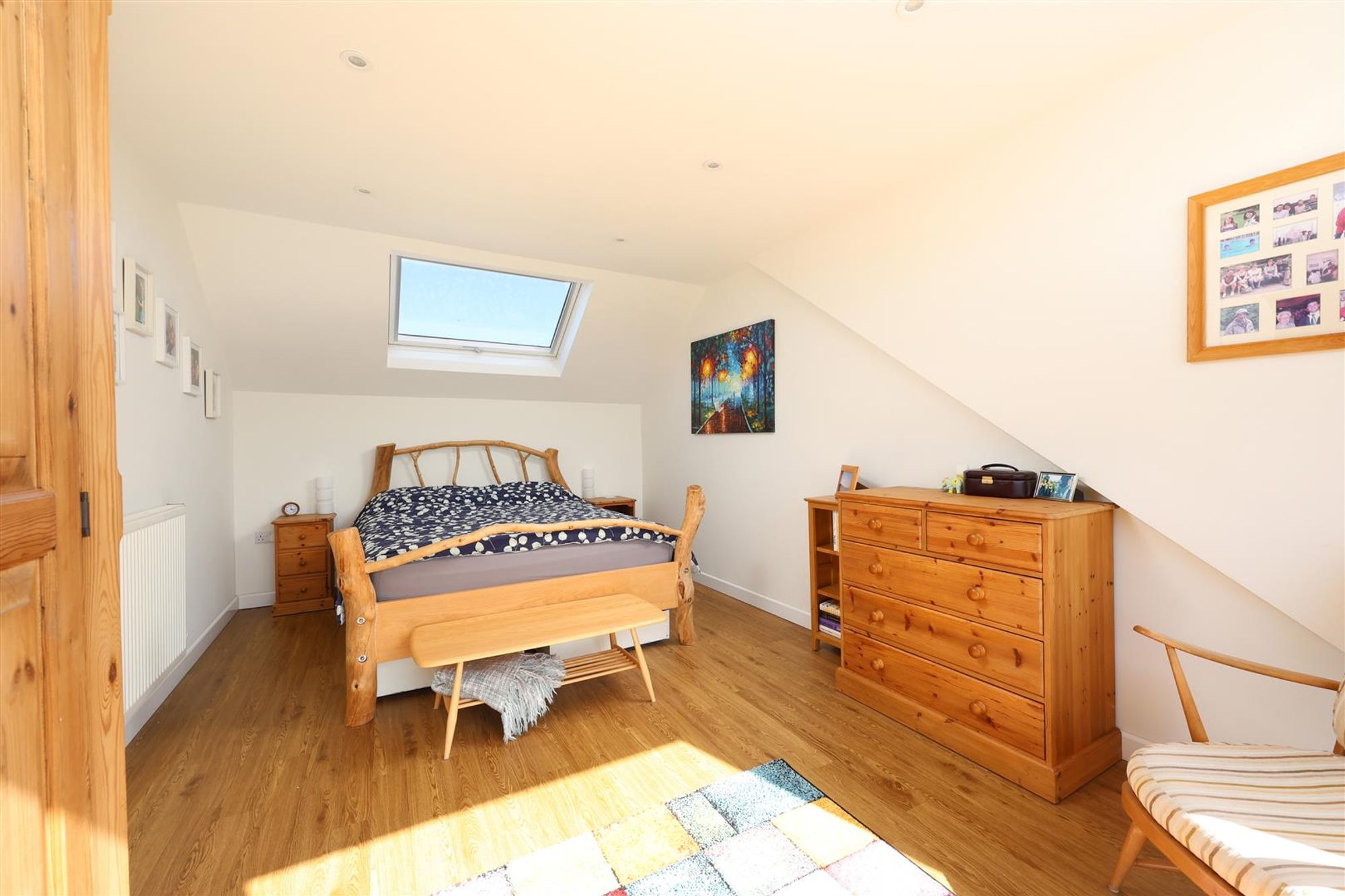 The principal bedroom, an office space and a bathroom extend over the second floor. The bedroom is neatly decorated with large floor-to-ceiling windows framing the view over the allotments and the city beyond. The conversion has been cleverly designed to incorporate a workspace open to the landing and access to ample eaves storage at the front of the property. The contemporary ensuite features a large walk-in shower, wash hand basin, and two heated towel rails.