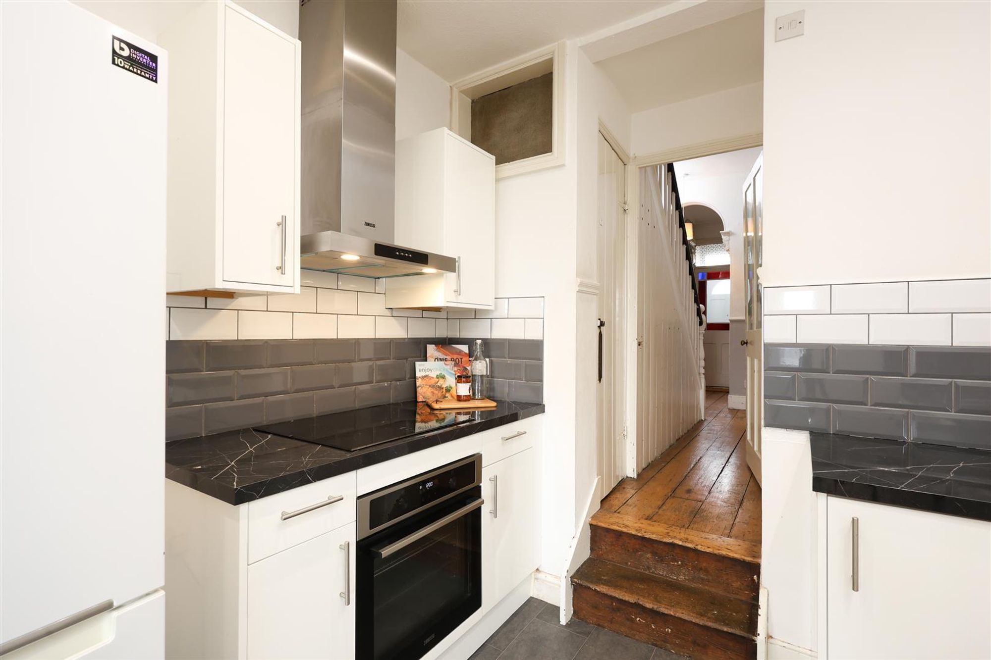 Accommodation on the ground floor comprises: a main entrance hallway with stripped wood floors that leads to a living room, complete with a double-glazed bay window, ceiling cornice, stripped wood floors, and an open fireplace. Adjacent to this is the second reception, which benefits from stripped wood floors, bespoke shelving within one of the alcoves, a gas fireplace and a double-glazed window overlooking the side garden. A step leads down to the kitchen, which features an array of contemporary wall and base units with a contrasting worktop. At the end of the kitchen, a doors provide access to the sunny rear garden and the family bathroom, which features a bath with shower overhead, a w/c, heated towel rail and wash basin.