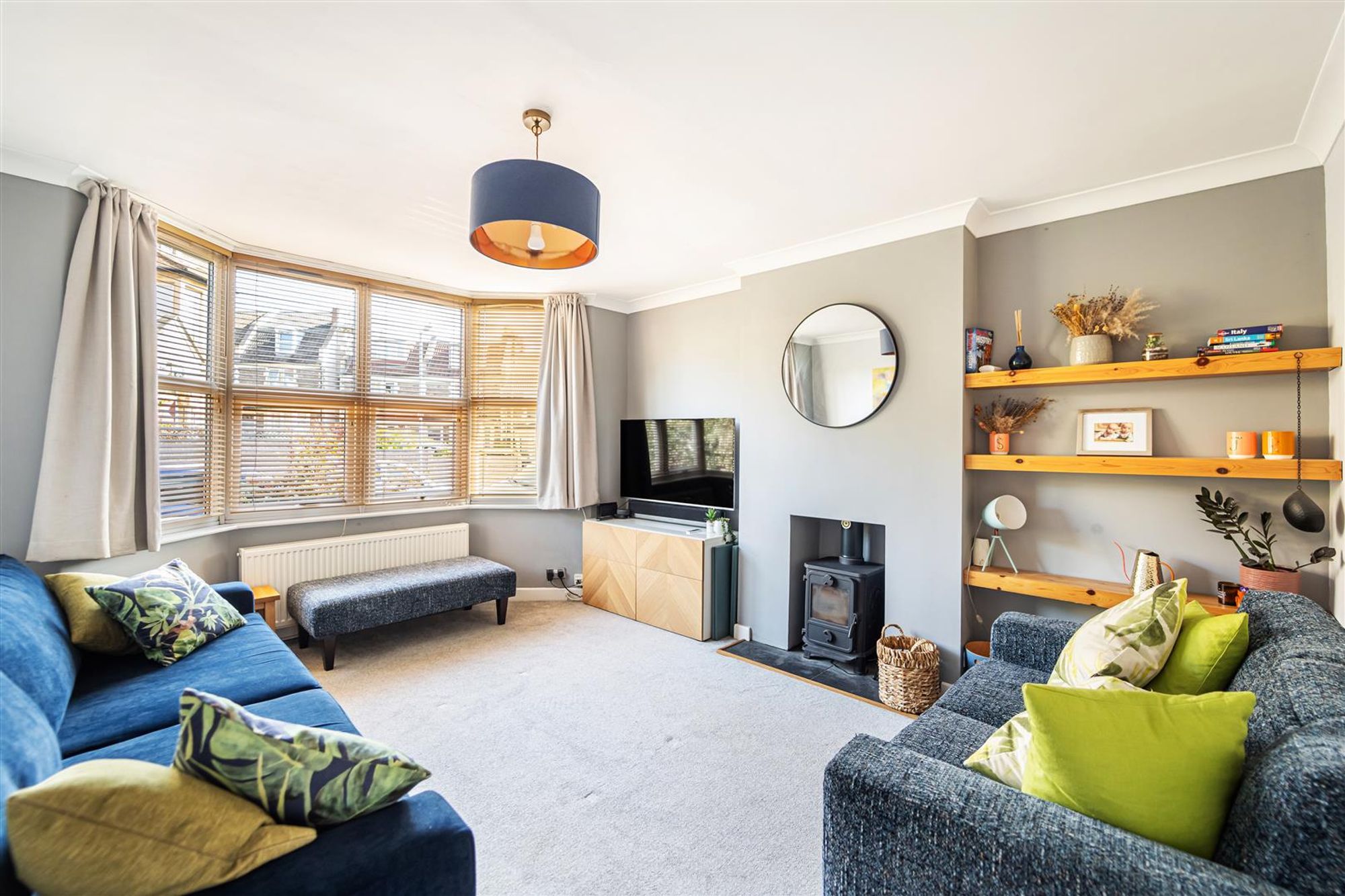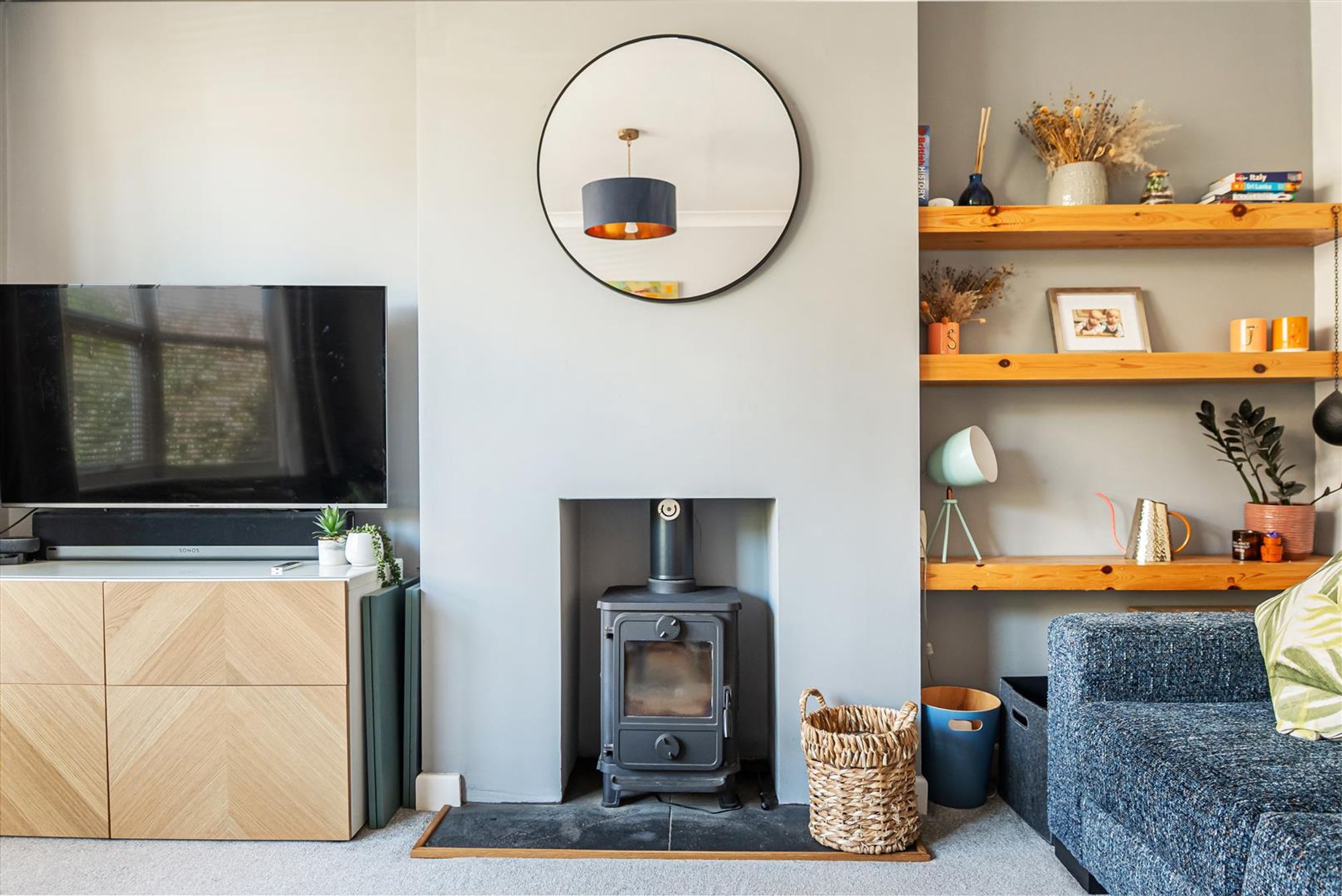 The sitting room to the front features a bay with UPVC double-glazed windows, a wood burner and alcove shelving.