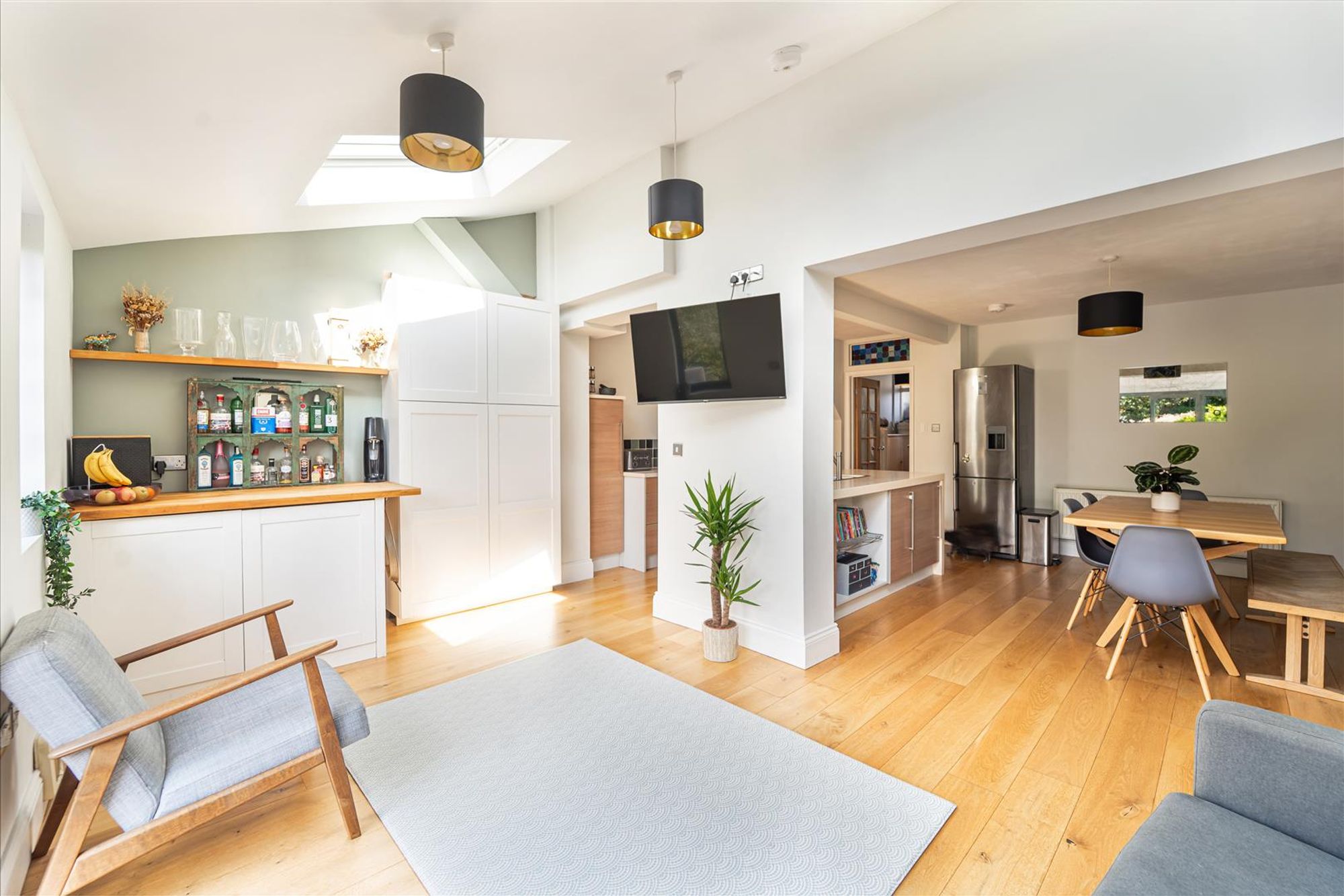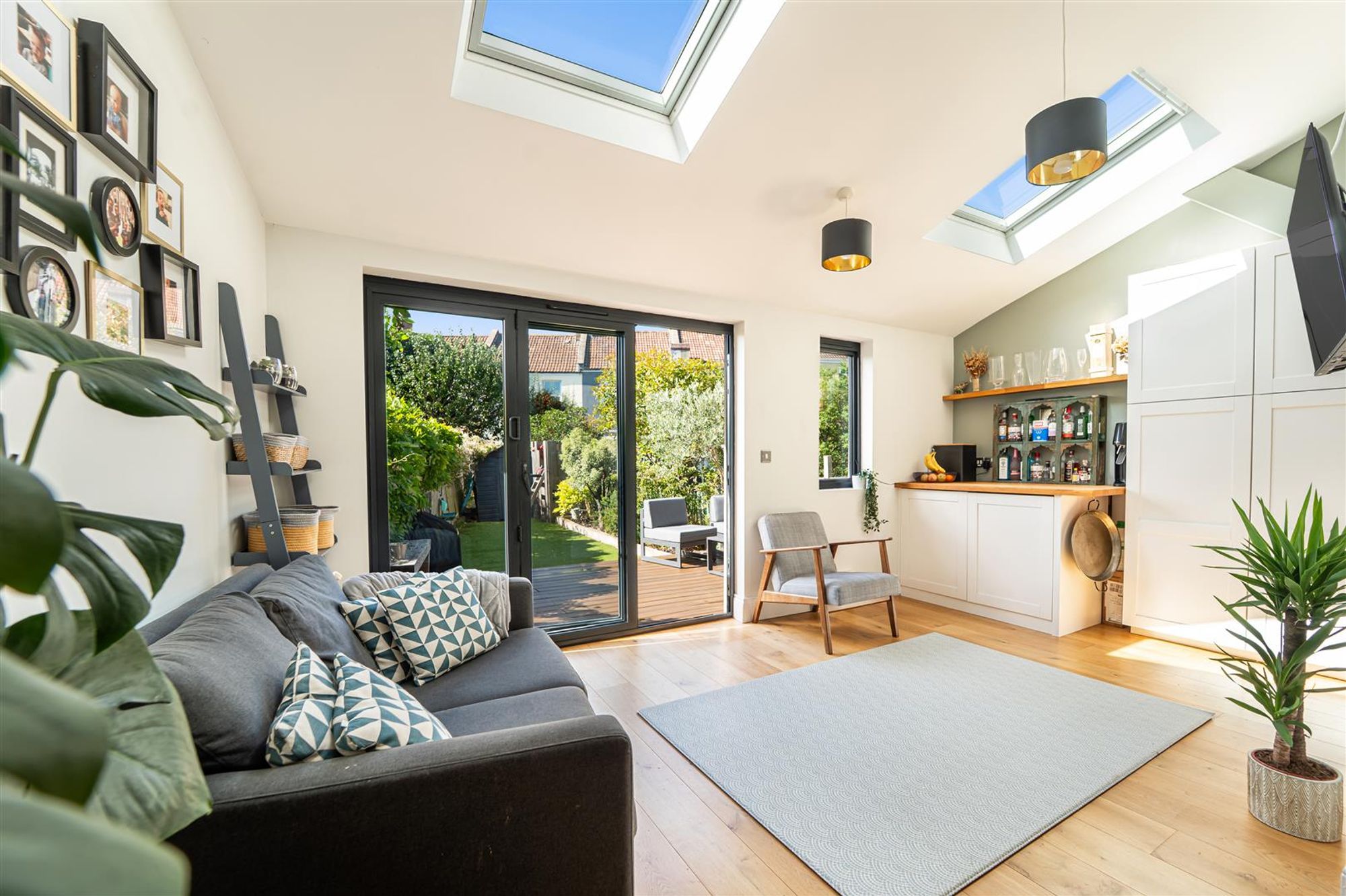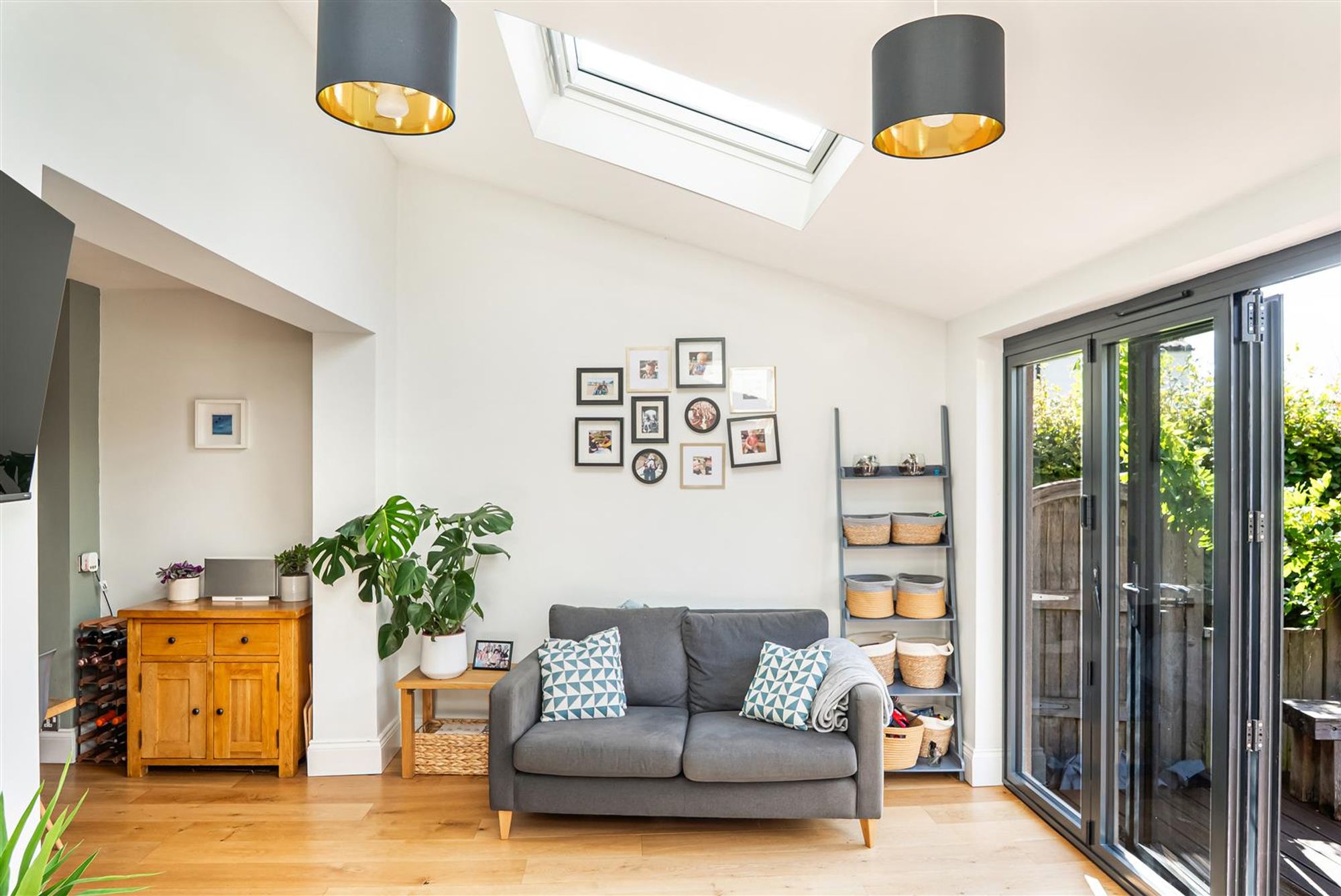At the rear of the house is a well-designed kitchen extension, creating an open and social space that seamlessly connects to the garden and extends the entire property width. The modern kitchen comprises a range of base units, built-in appliances, and an electric hob and double ovens. There is also a central kitchen island provides additional storage, a sink and drainer and shelving. The living area of the extension feels light and bright due to the glazed bi-fold doors and skylight windows.