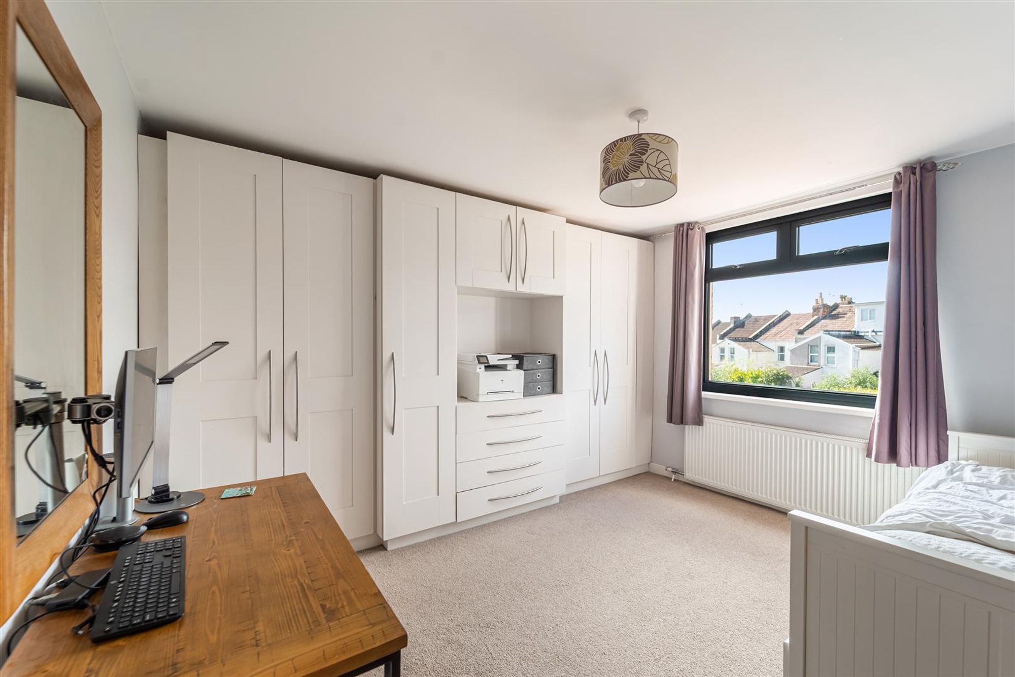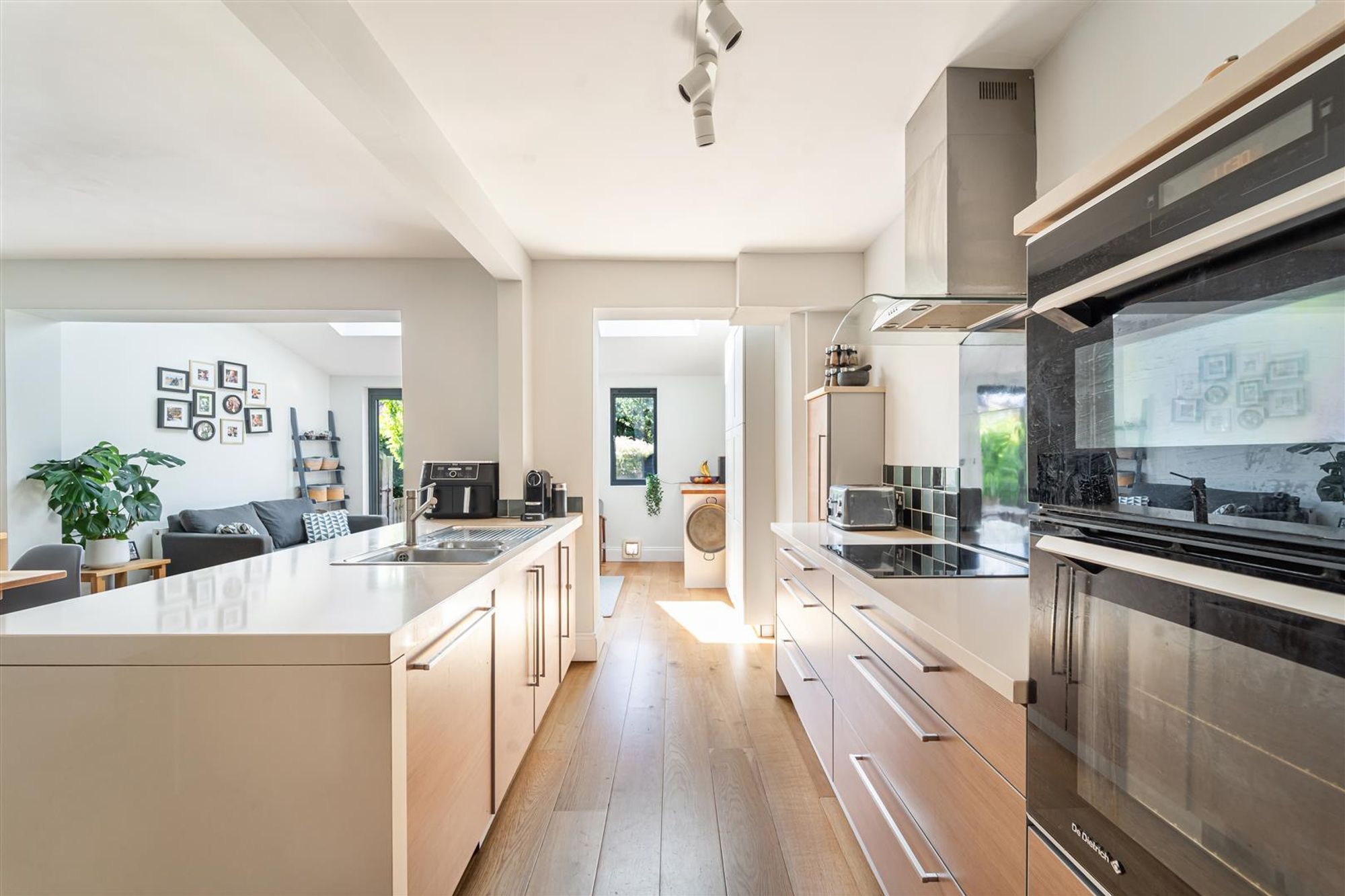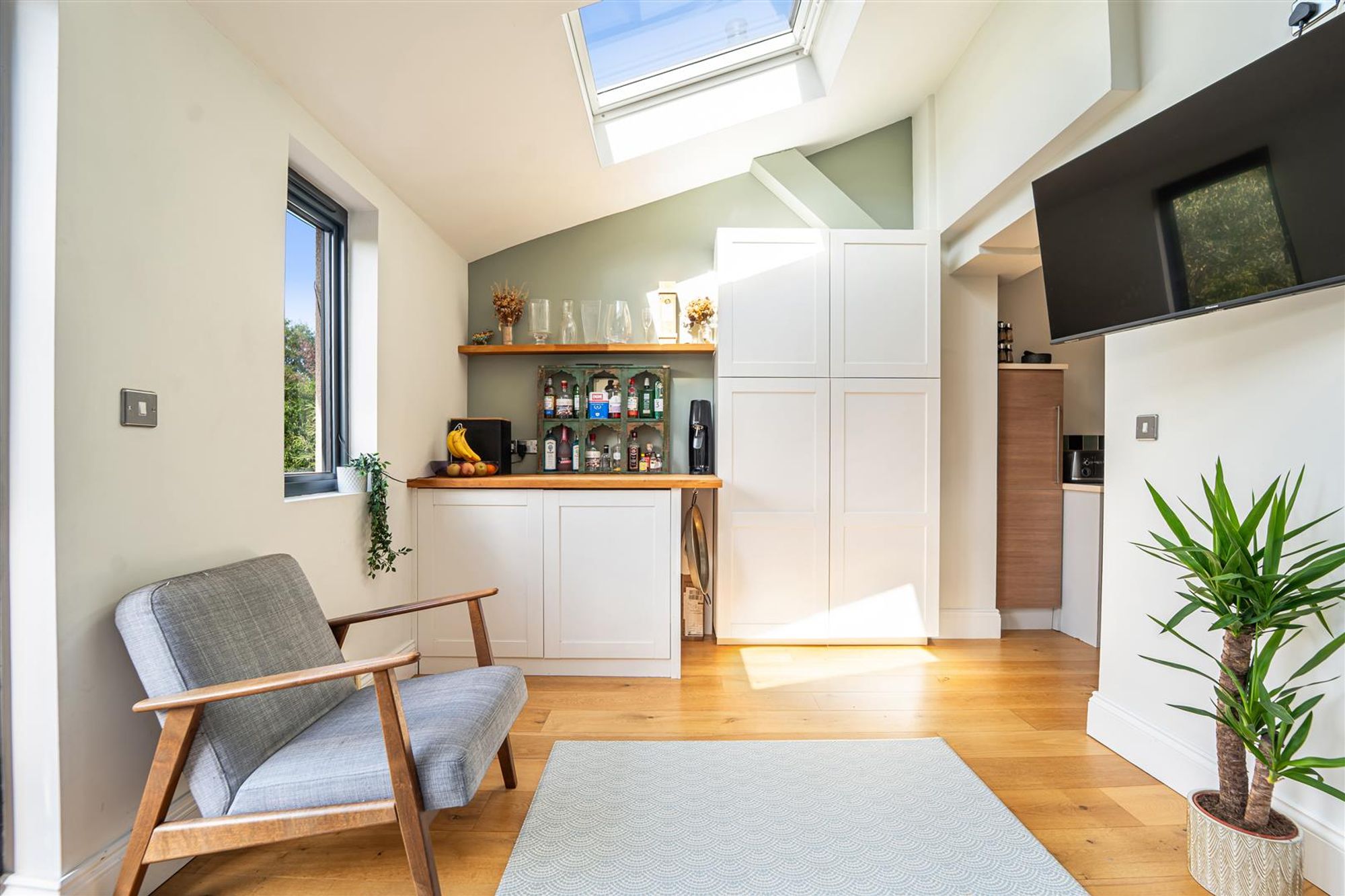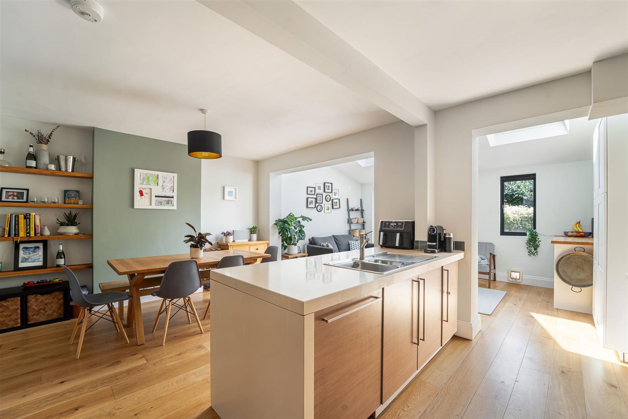 At the rear of the house is a well-designed kitchen extension, creating an open and social space that seamlessly connects to the garden and extends the entire property width. The modern kitchen comprises a range of base units, built-in appliances, and an electric hob and double ovens. There is also a central kitchen island provides additional storage, a sink and drainer and shelving. The living area of the extension feels light and bright due to the glazed bi-fold doors and skylight windows.