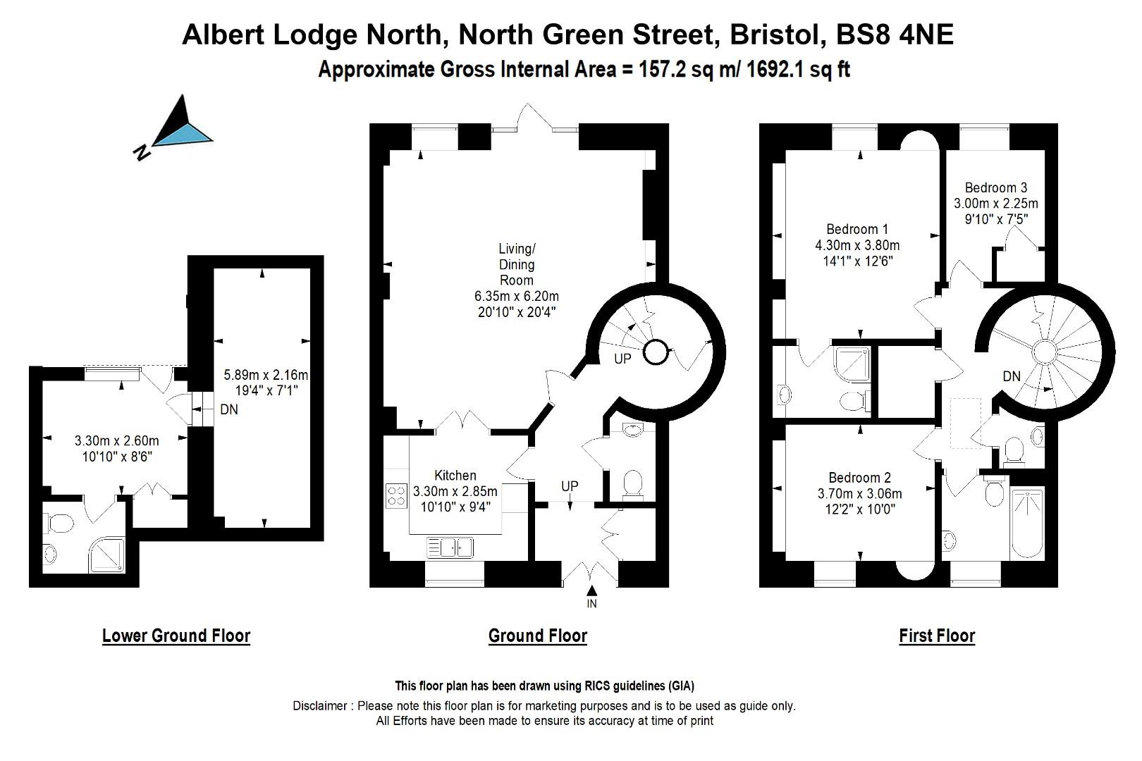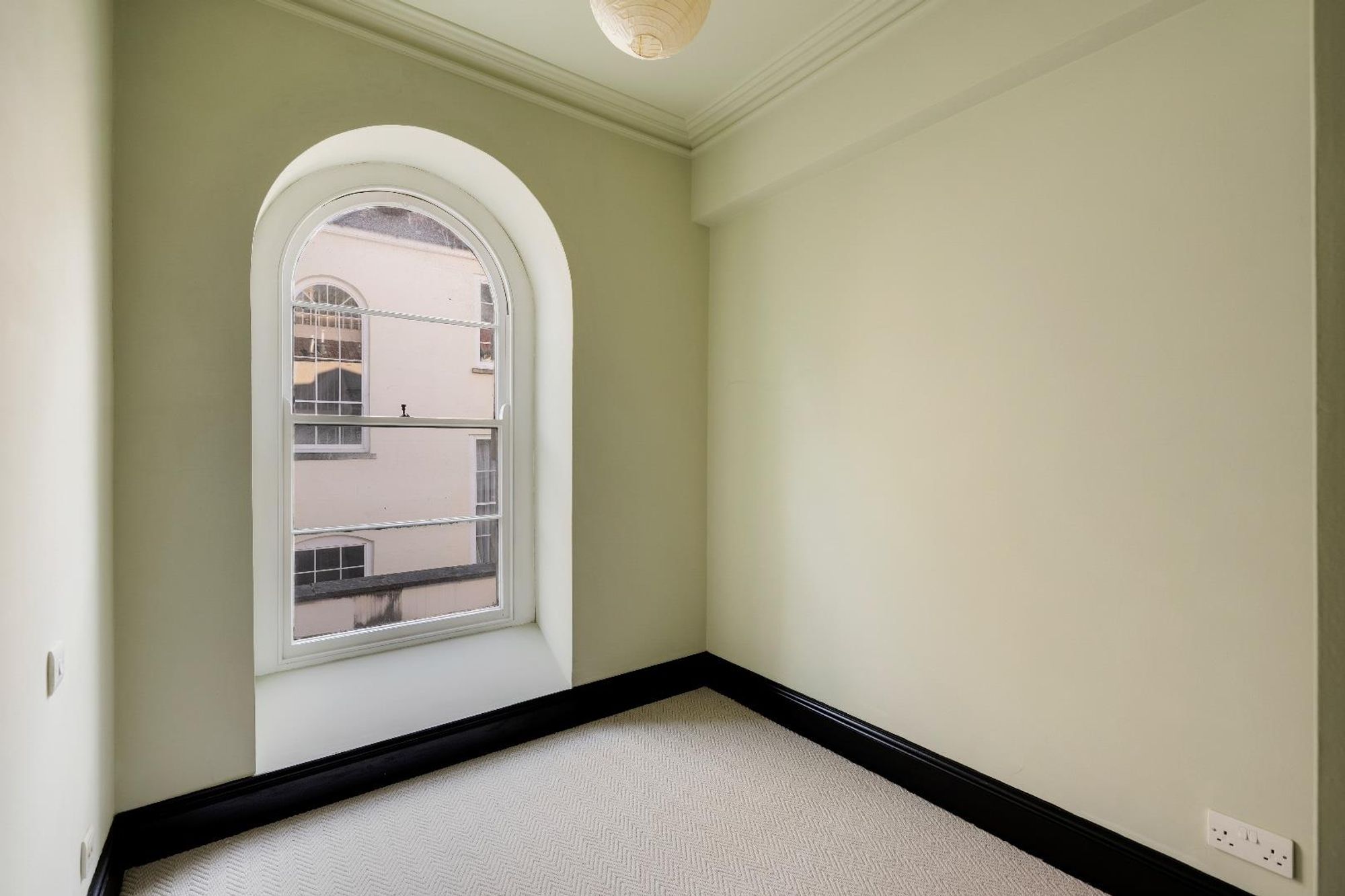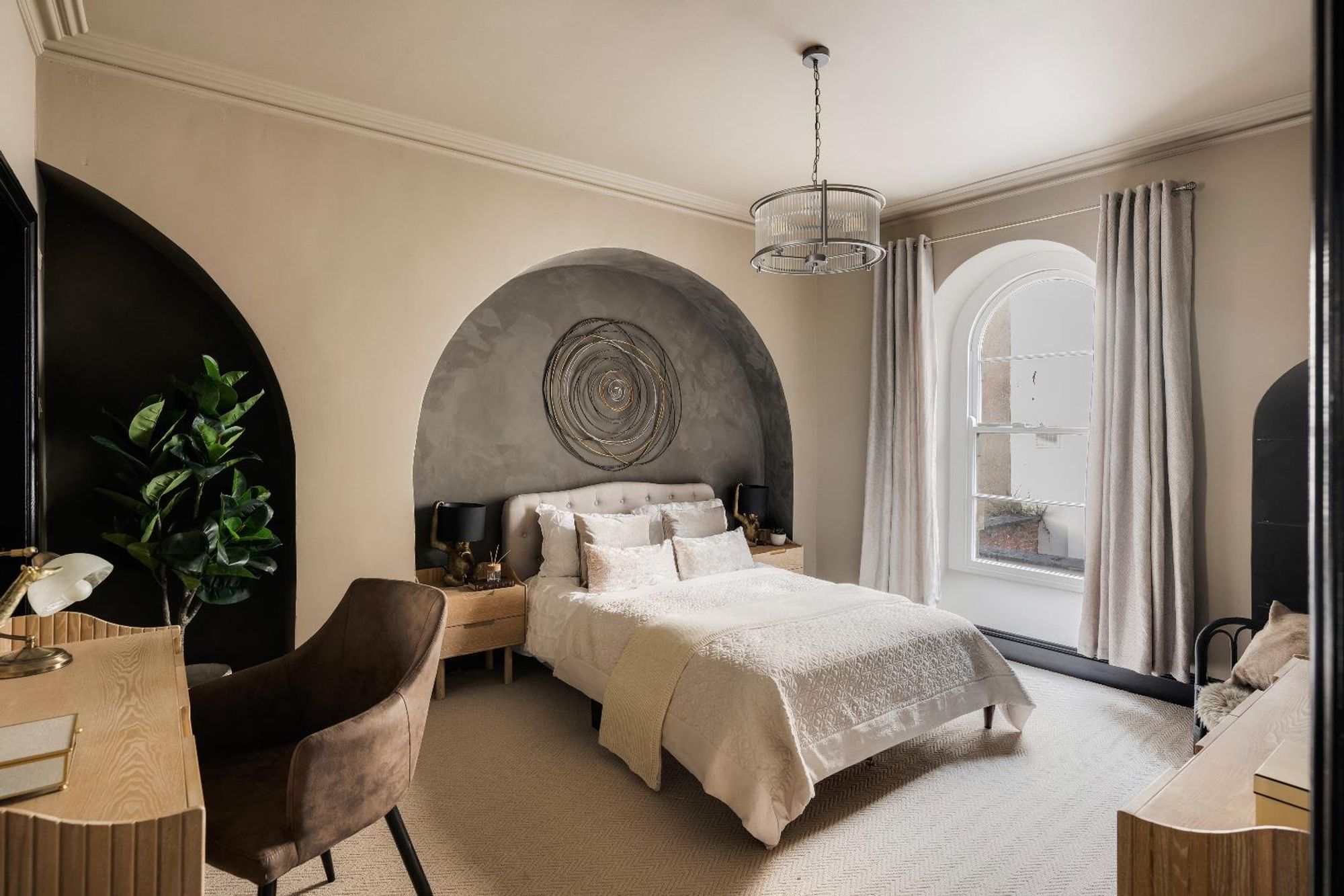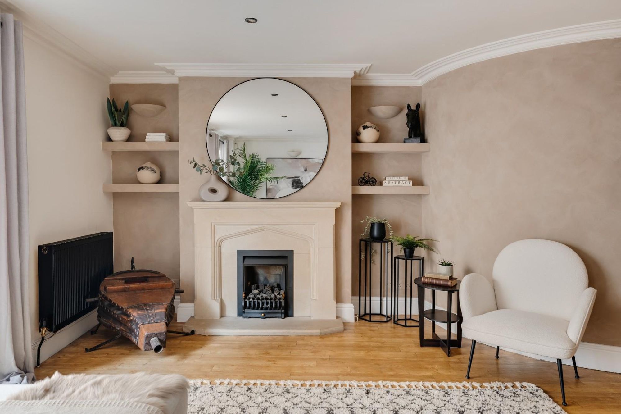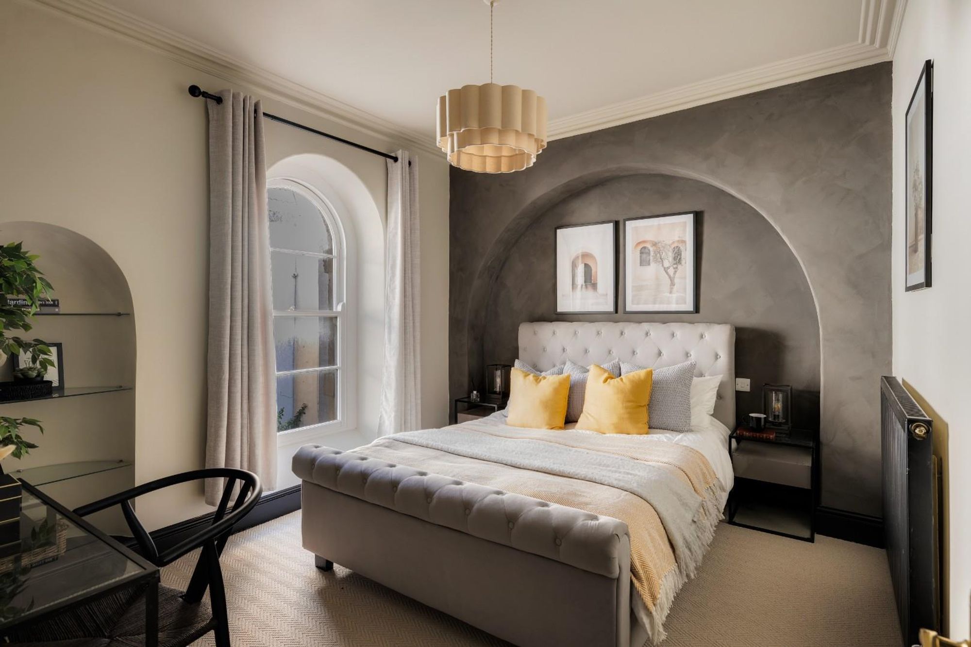 The first floor is home to three bedrooms. The primary bedroom is a bright and spacious retreat, with an arched sash window and characterful arched alcoves. It also benefits from an en suite with a corner shower and built-in cabinetry for storage. The second bedroom is similarly well-sized and features the same arched details, while the third bedroom, painted in soft green tones, includes a sash window and useful built-in storage.