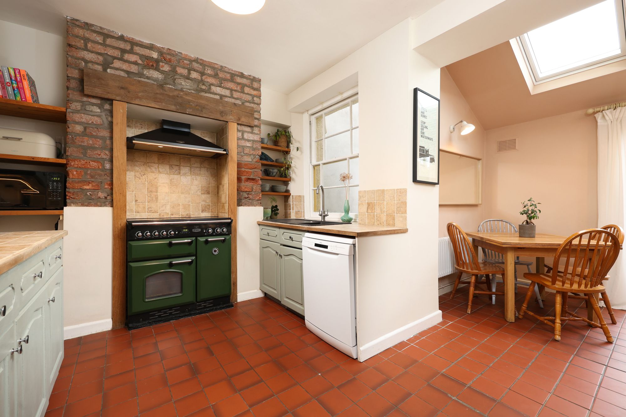 An additional staircase at the rear of the property leads you downstairs and directly into the large, extended open plan kitchen/diner. This space is really the heart of the home with skylights providing plenty of natural light. The kitchen has been fitted with a range of solid wood wall and base units with wood work-tops. An exposed chimney breast provides space for a large range style cooker and adds to the country kitchen feel. There is ample space for a large dining table and a terracotta tiled floor completes the look joining both spaces together, whilst double glazed patio doors lead seamlessly out on to the garden. This floor further benefits from a cellar/utility room off of the kitchen, providing ample storage.