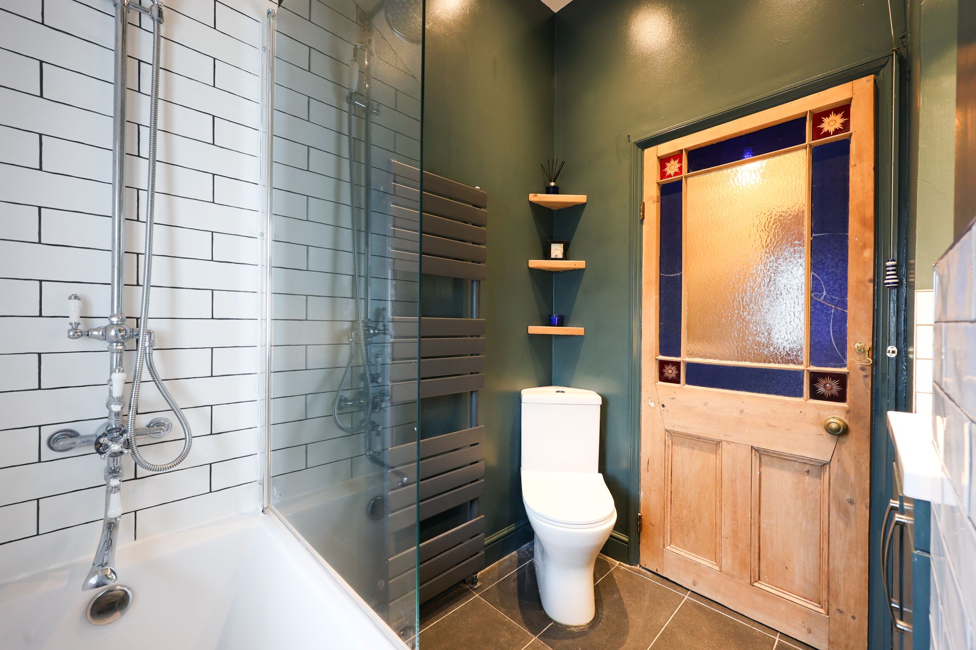 A staircase leads up to the top floor to two double bedrooms and a modern family bathroom. The stylish principal bedroom spans the full width of the house and benefits an ornate period fireplace, built-in wardrobes and a large walk-in wardrobe as a further storage option. Across the landing at the rear of the property is a second double bedroom currently being used as a nursery. Completing the accommodation is a smartly finished bathroom with bath and shower over, floor to ceiling metro tiled splash-backs, a tiled floor and an original stained glass door.