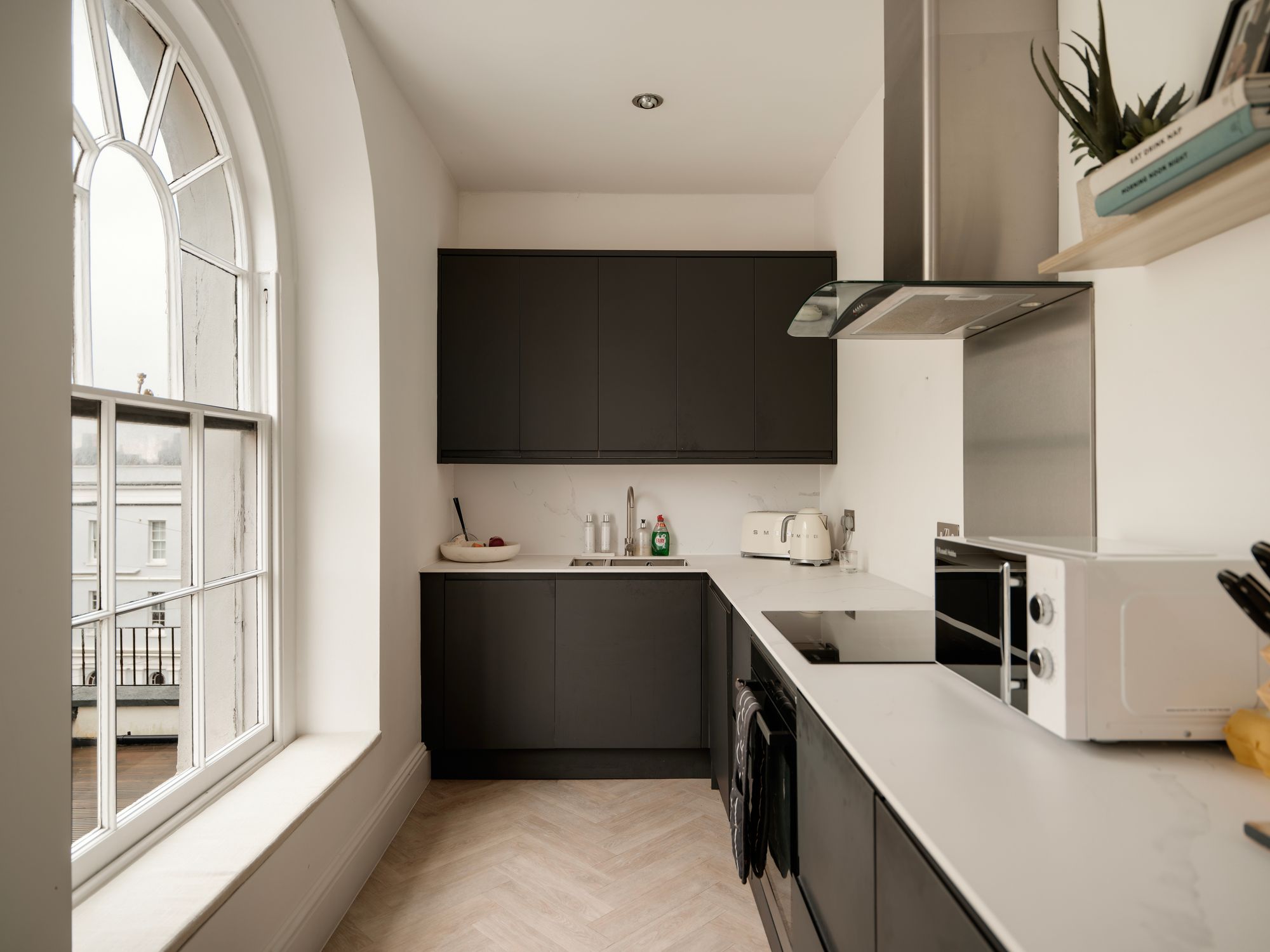 Inside, the entrance hallway provides access to the kitchen, living and dining room and one of the bedrooms. The kitchen has been thoughtfully updated with a sleek, modern finish. A large arched sash window fills the room with natural light, while wooden herringbone flooring adds warmth and texture. Dark cabinetry is paired with marble worktops, offering generous storage and integrated appliances.