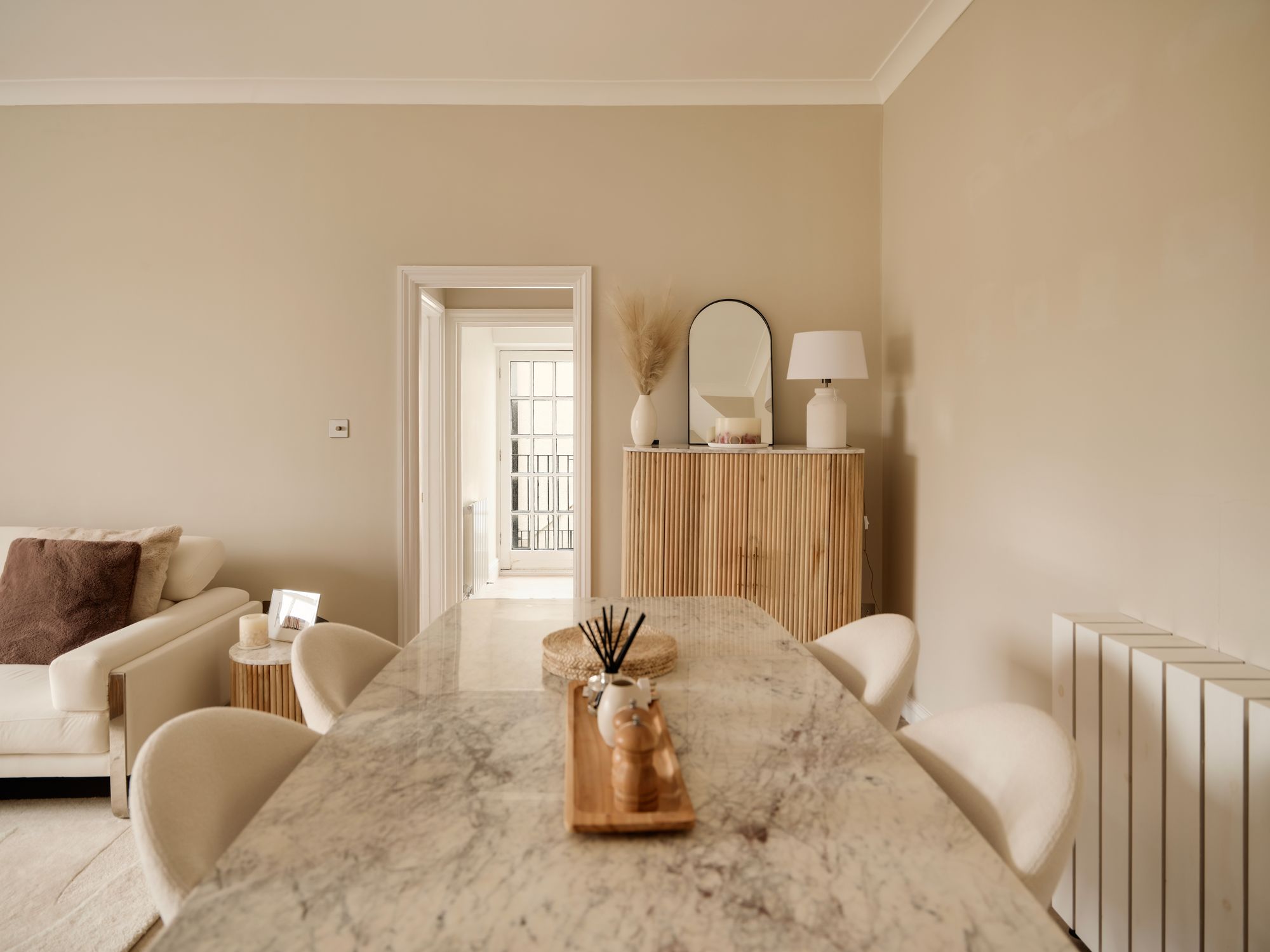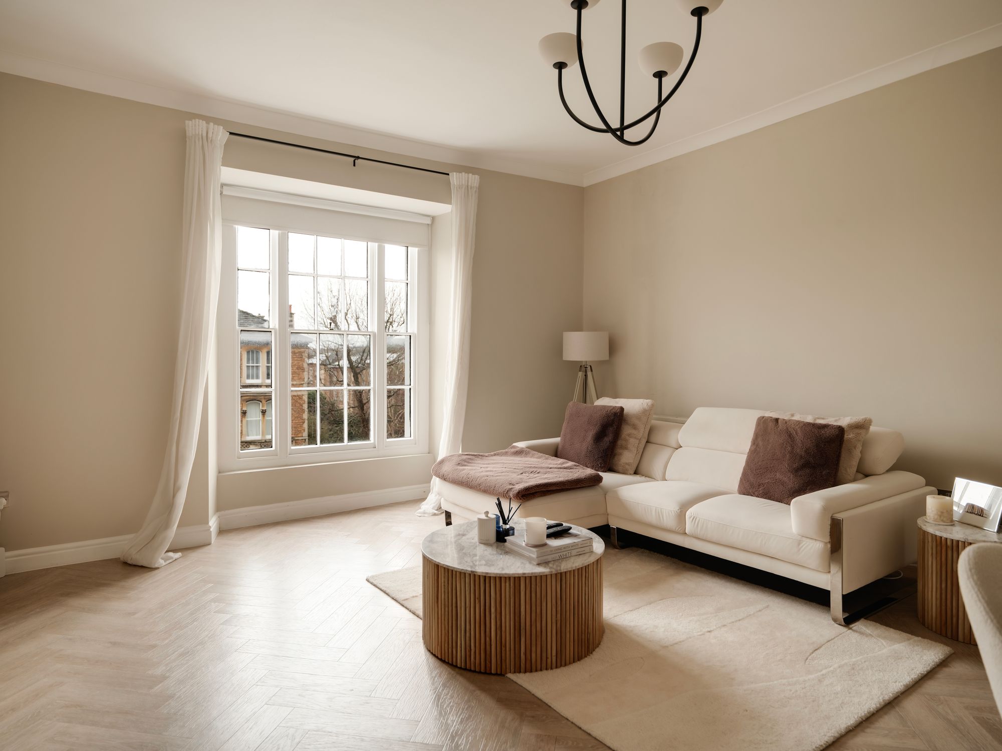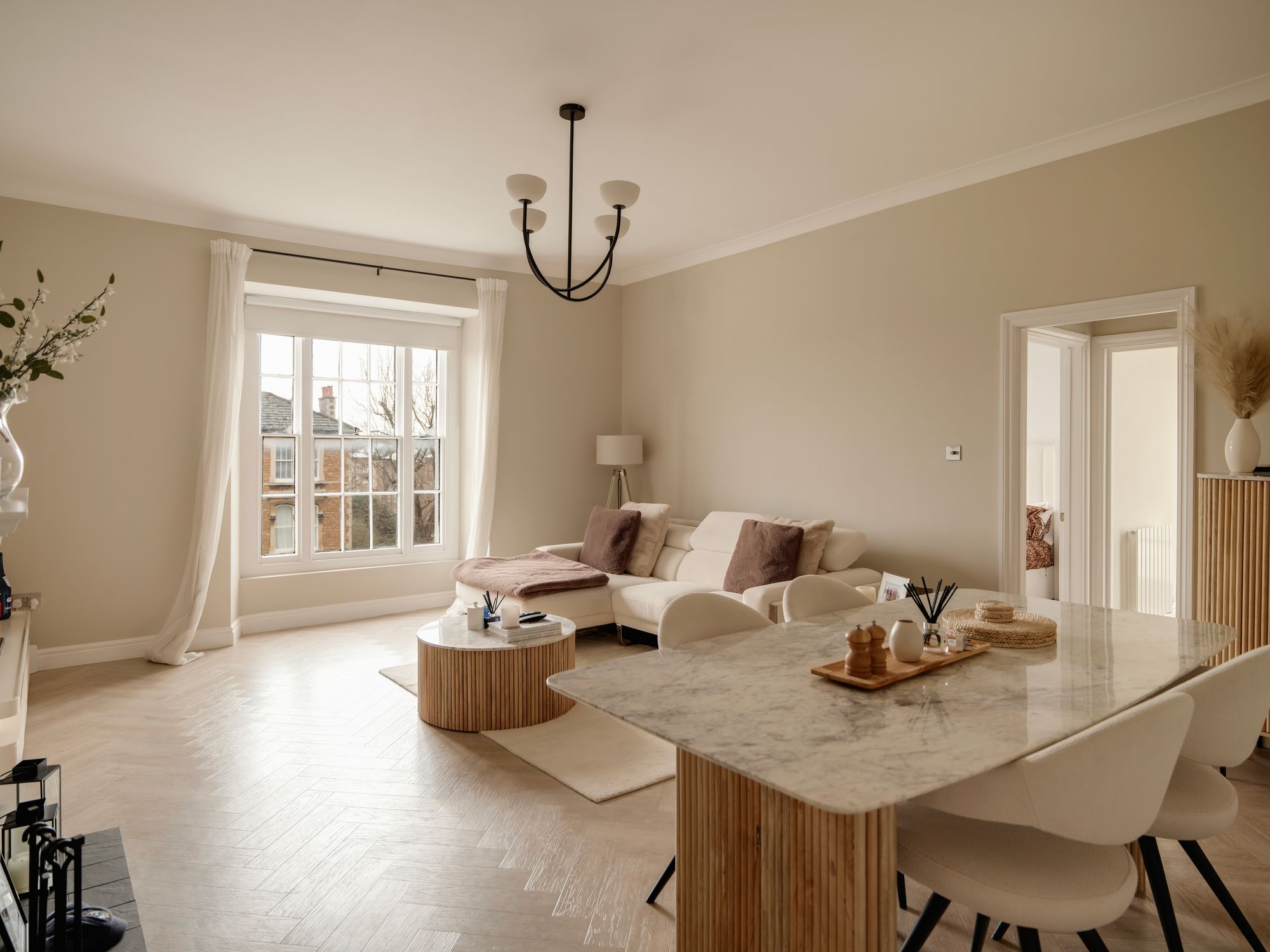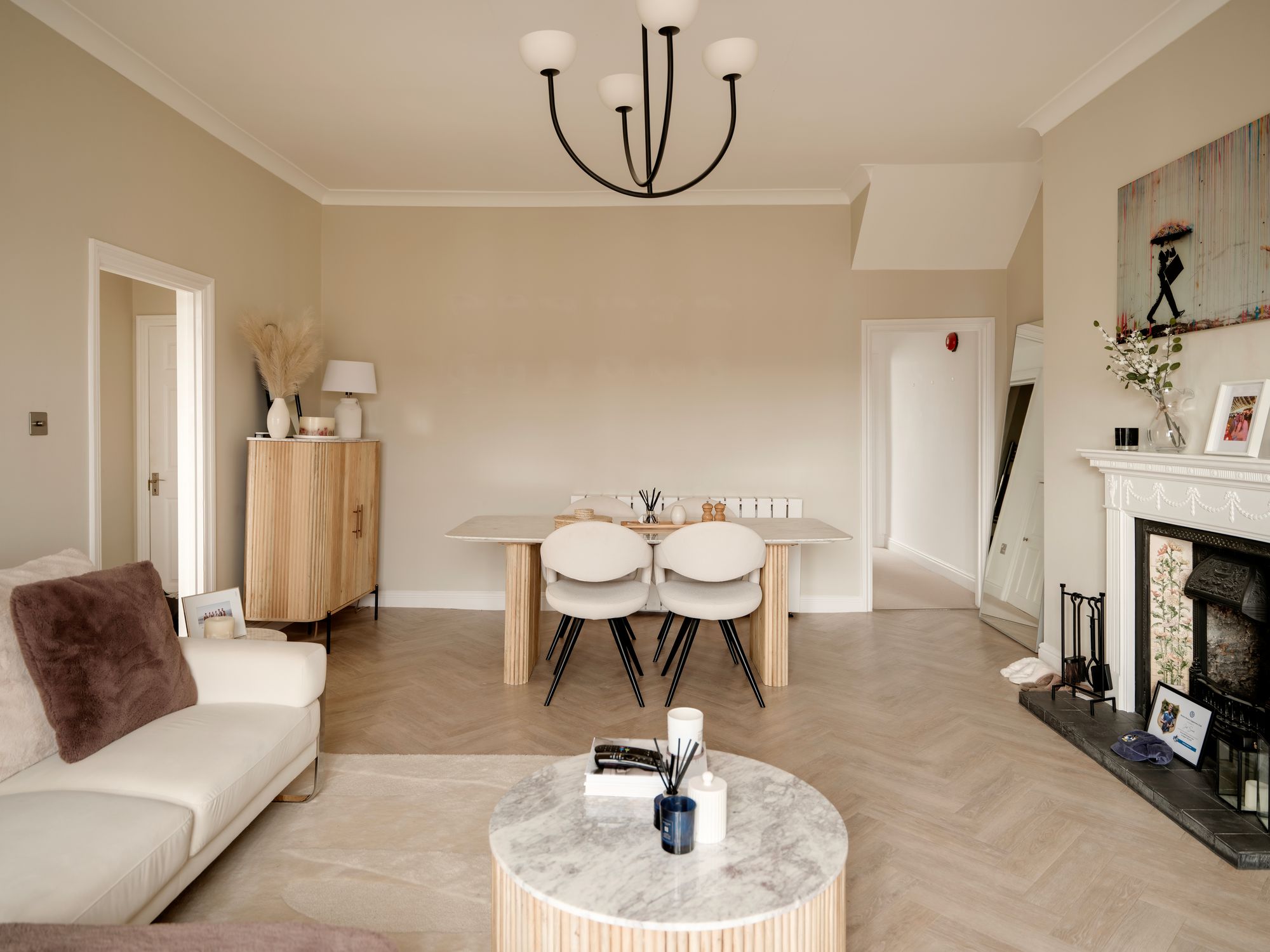 The herringbone flooring continues into the living and dining room, creating a cohesive feel. This is a bright and comfortable space with a large sash window and a period fireplace adding character. The room is well proportioned, with ample space for both a dining table and a separate seating area.