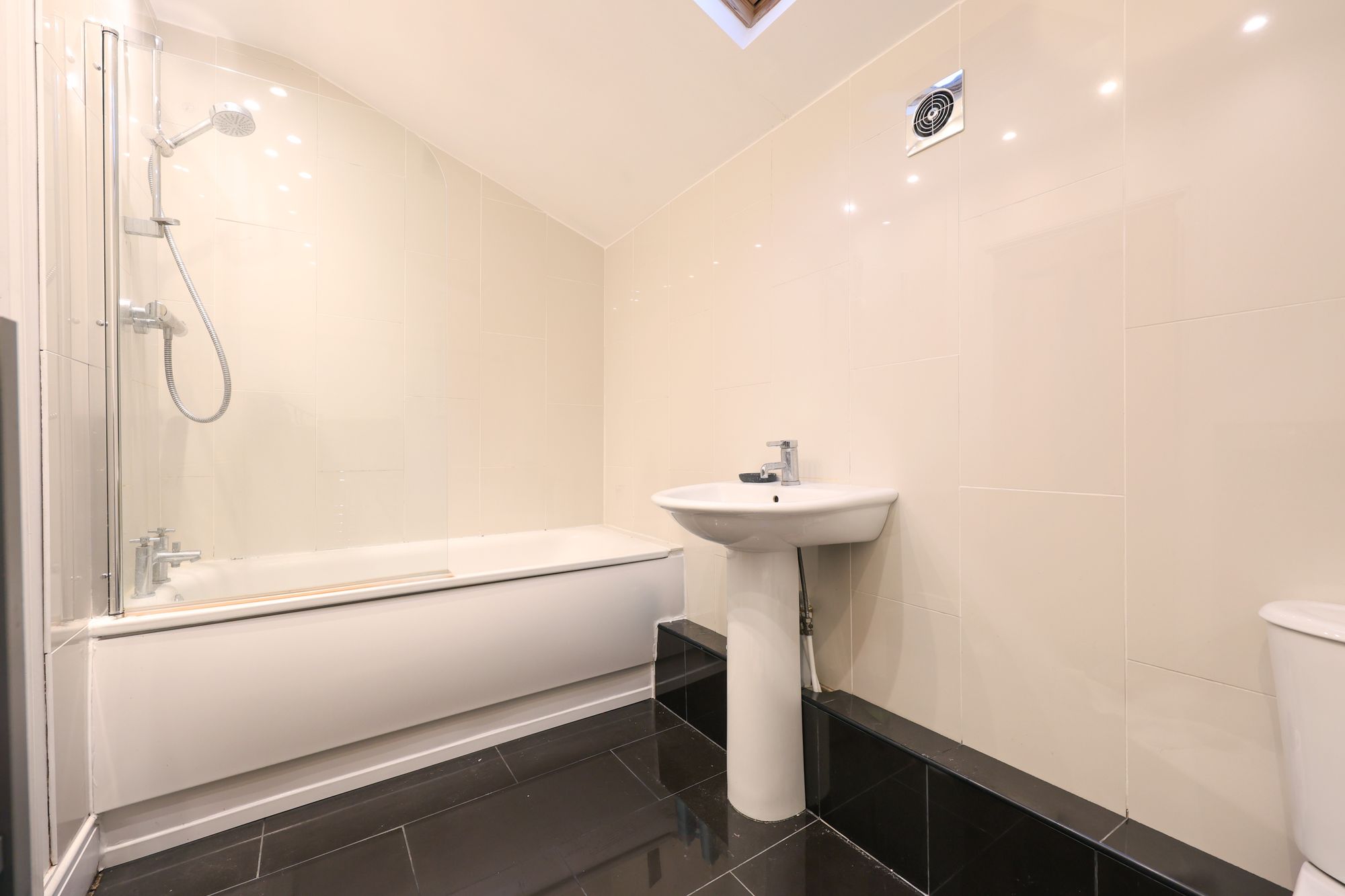The family bathroom features a panelled bath with a shower, tiled walls and flooring, and a skylight.