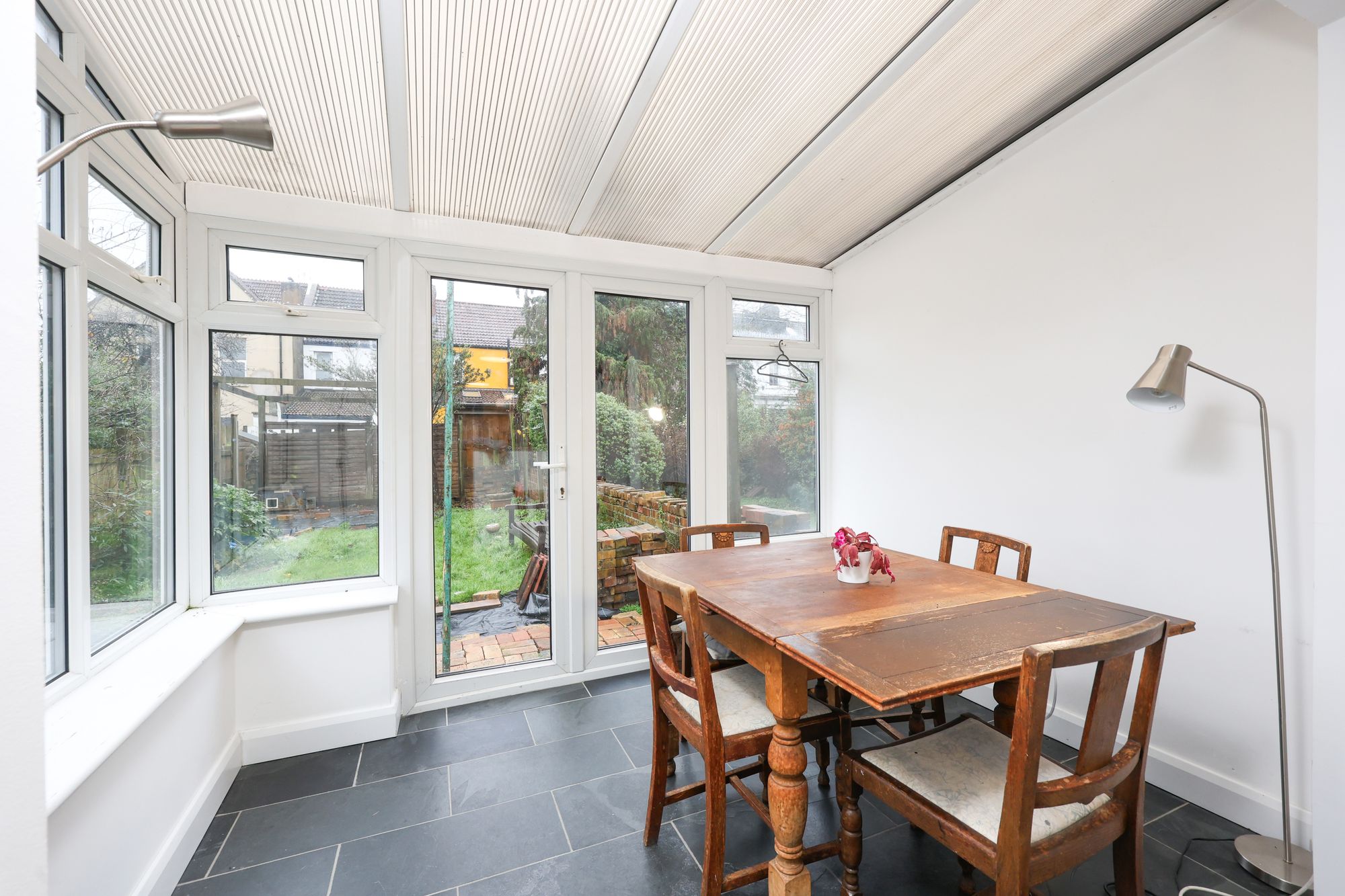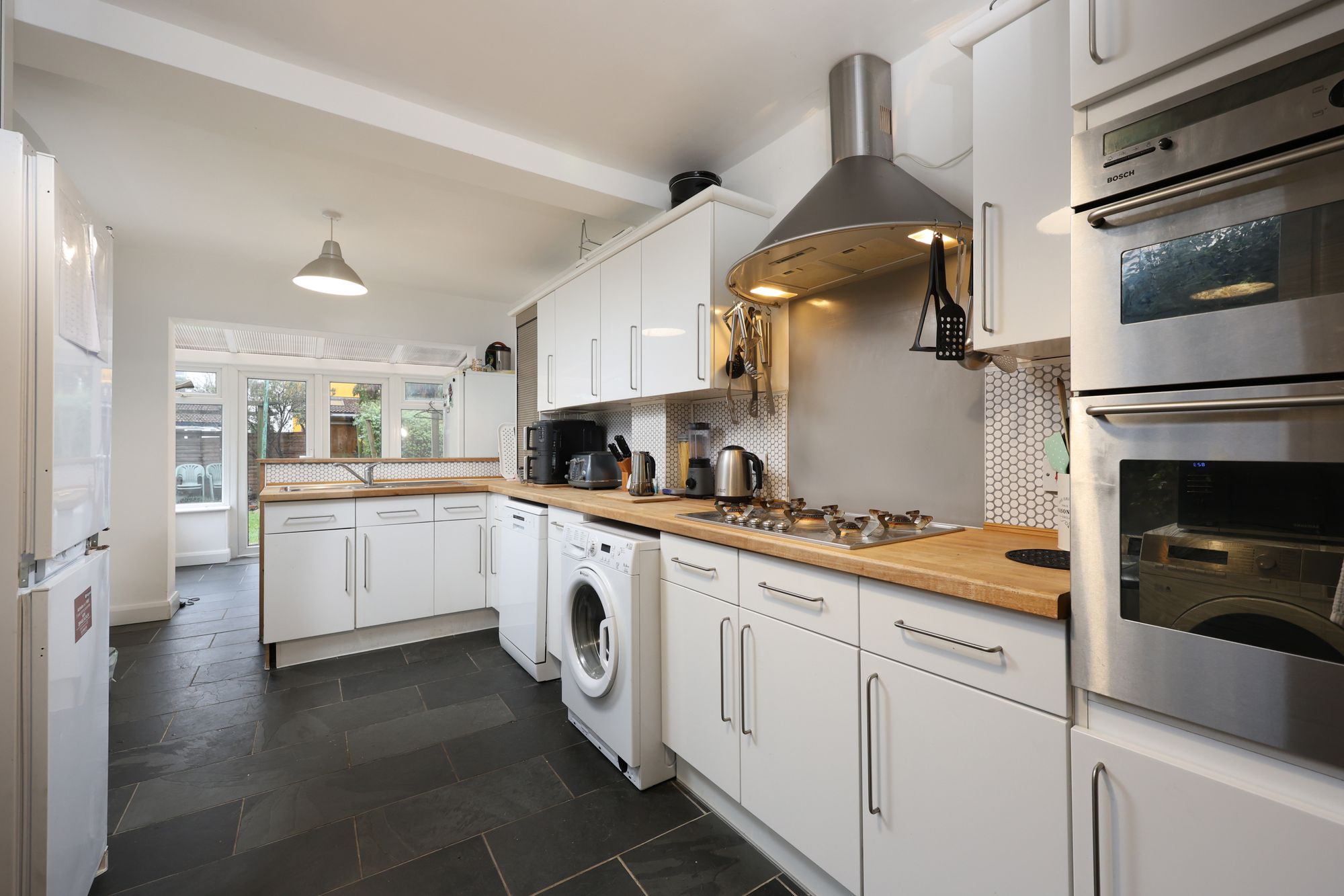 At the rear, the kitchen extends an impressive 5.6m. It has a range of modern wall and base units, an inset one-and-a-half-bowl stainless-steel sink and drainer, a gas hob, electric double ovens, and space for appliances. The kitchen leads onto a dining area with double-glazed windows and doors, allowing plenty of natural light into the room and offering a great connection to the southwest-facing garden.