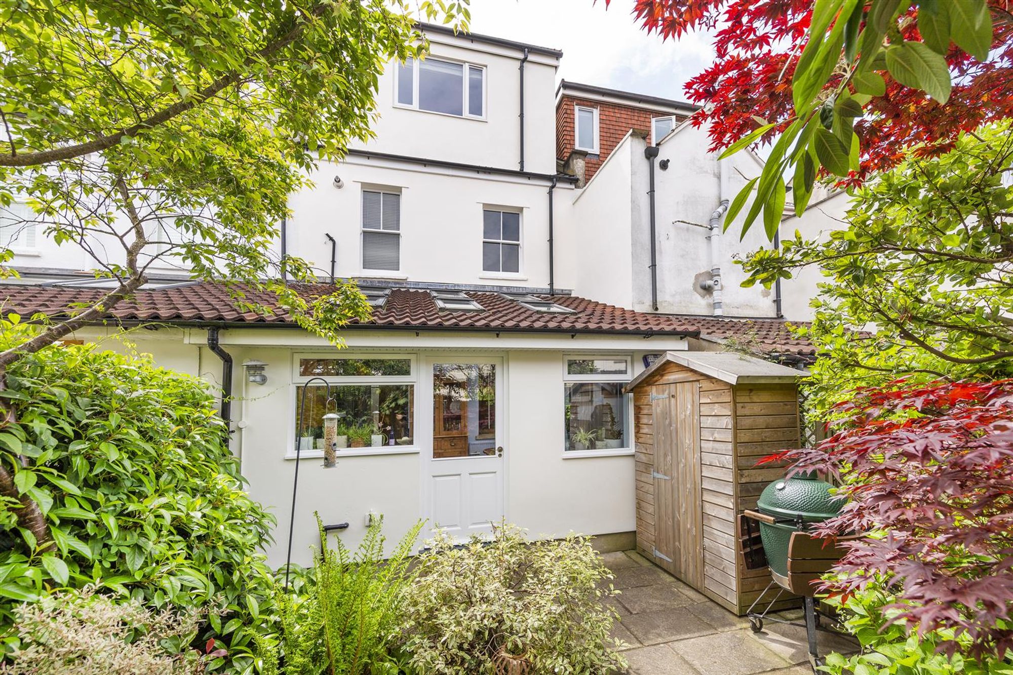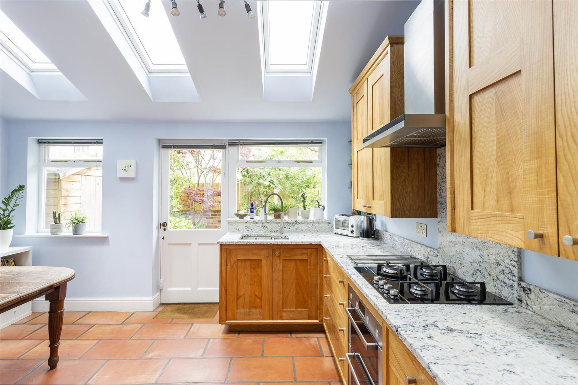 At the rear of the property is an extended open plan kitchen/diner which is bathed in natural light thanks to six Velux windows. The kitchen has been tastefully designed with a terracotta tiled floor and a range of contemporary solid wood wall and base units with stainless steel fittings and granite work surfaces. The dining area has plenty of space for a large table and overlooks the rear garden whilst a glazed door provides access on to the beautifully maintained sunny garden.