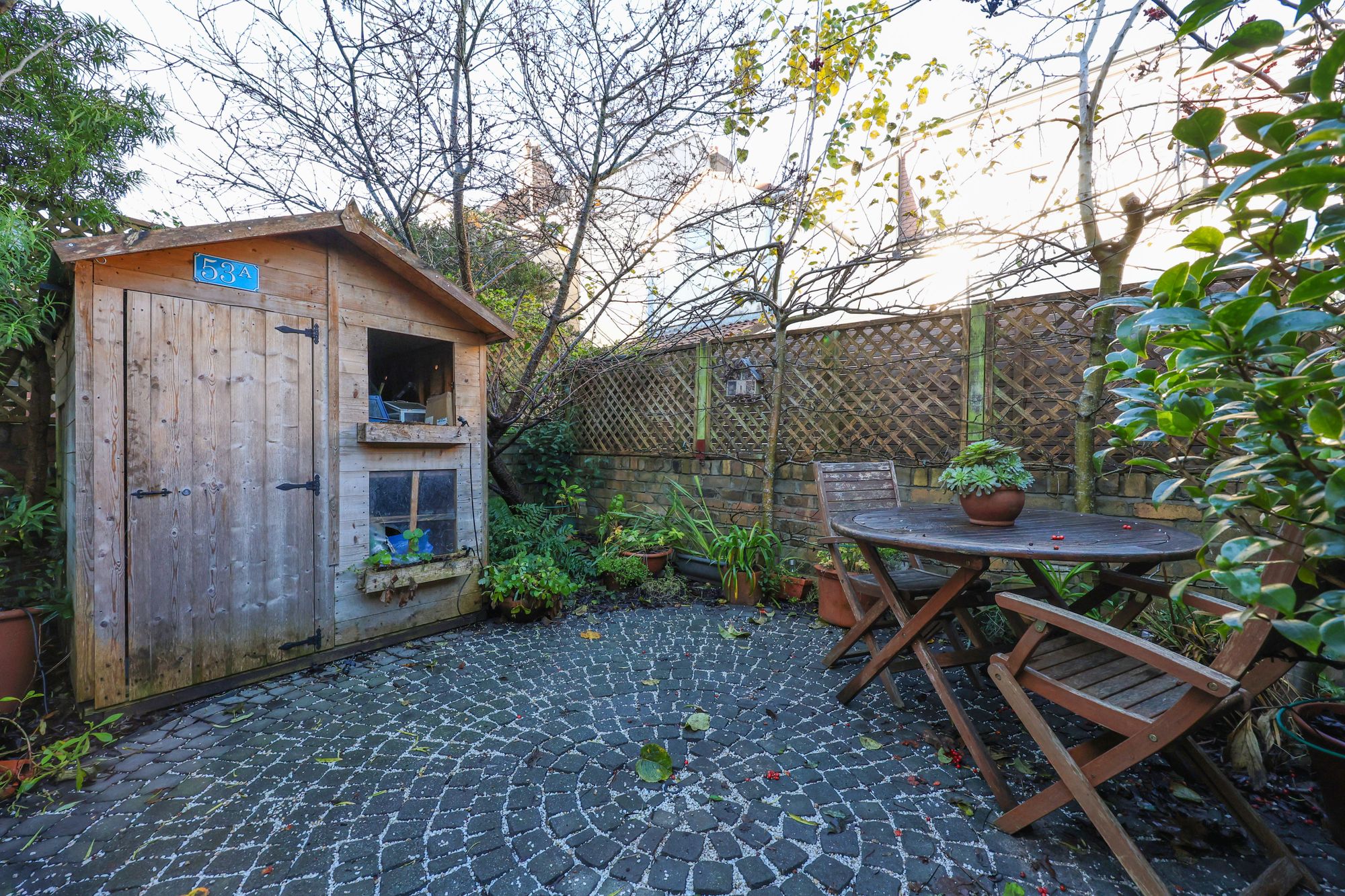 The front garden is enlosed by a low level retaining stone wall and has a wooden shed, useful for bike storage.