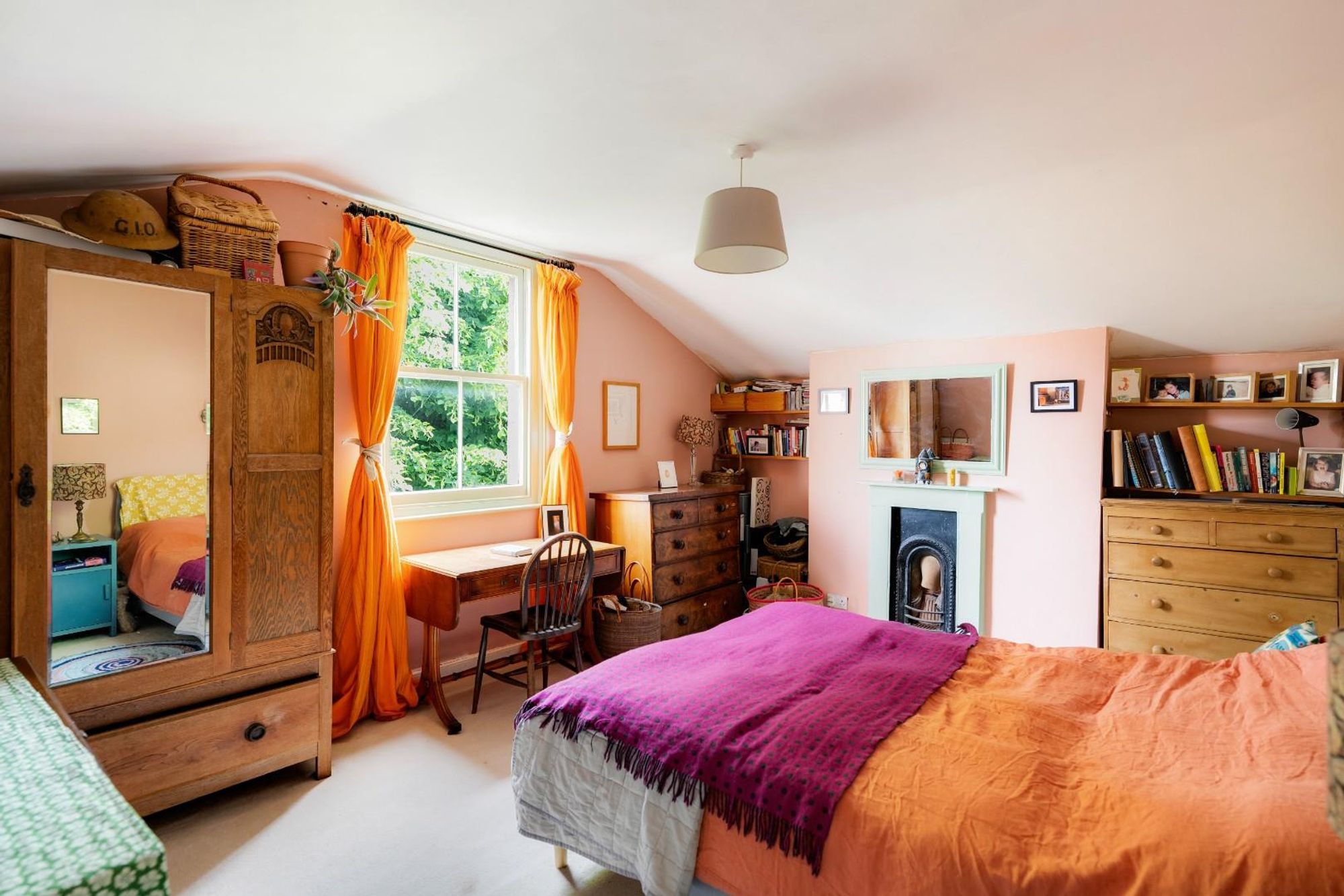 The first and second floors provide three bedrooms and a family bathroom. The principal bedroom occupies the full width of the house and features twin sash windows, ceiling cornice, and a large storage cupboard or wardrobe.