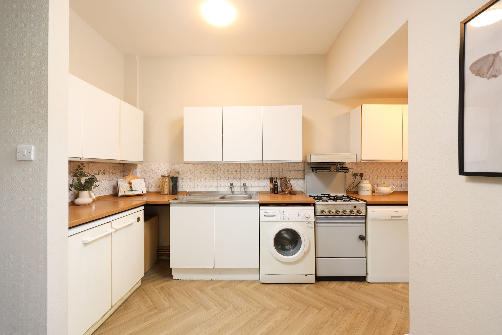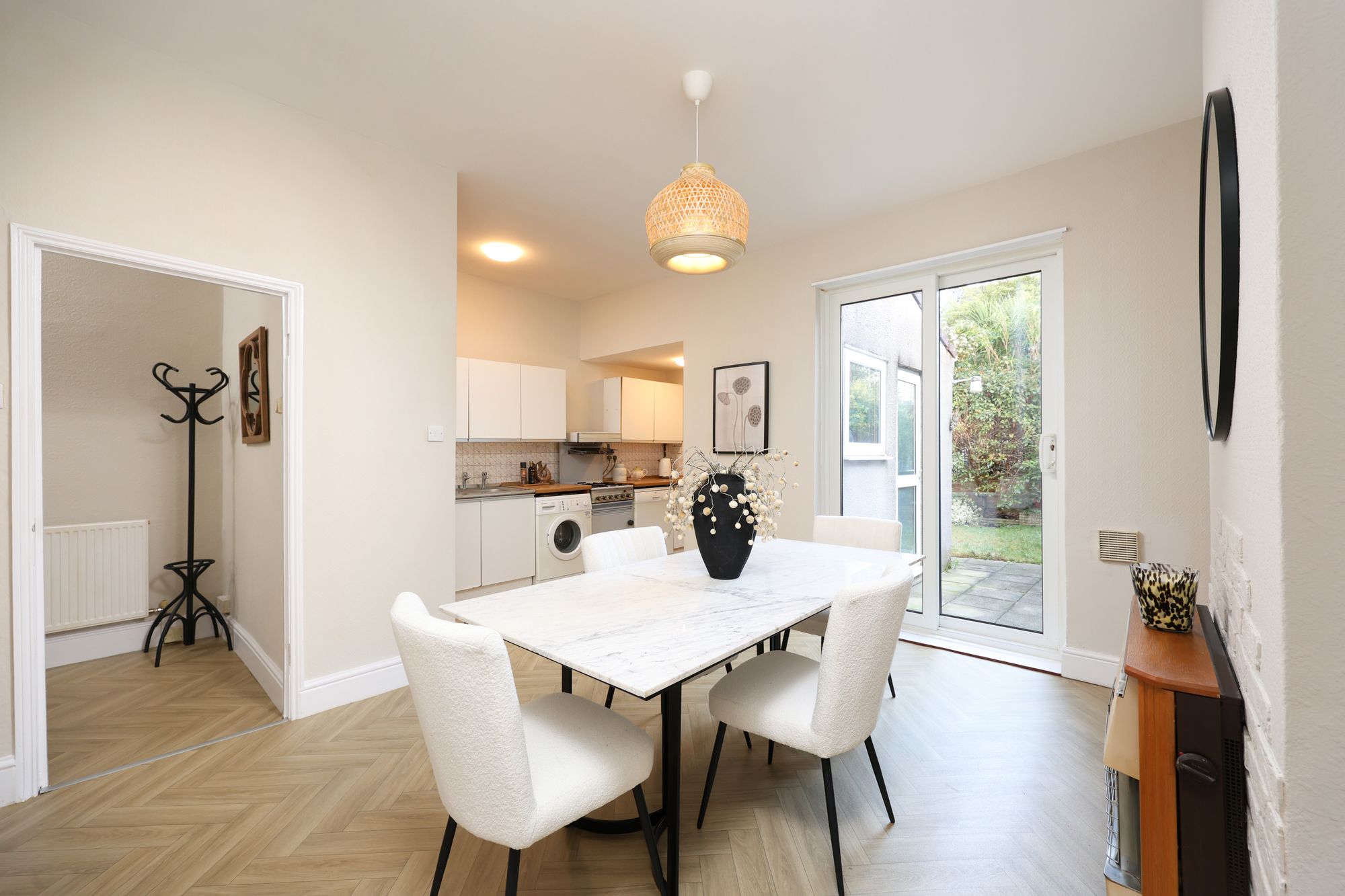 The ground floor comprises a welcoming entrance hall leading to a spacious sitting room with a large bay window. At the rear is a spacious kitchen/diner, ideal for entertaining or family meals. The kitchen is well-proportioned and offers ample storage and workspace, with potential for modernisation or reconfiguration to suit individual requirements. The bathroom is beyond the kitchen and could be remodelled into a utility room or opened to create a larger kitchen.
