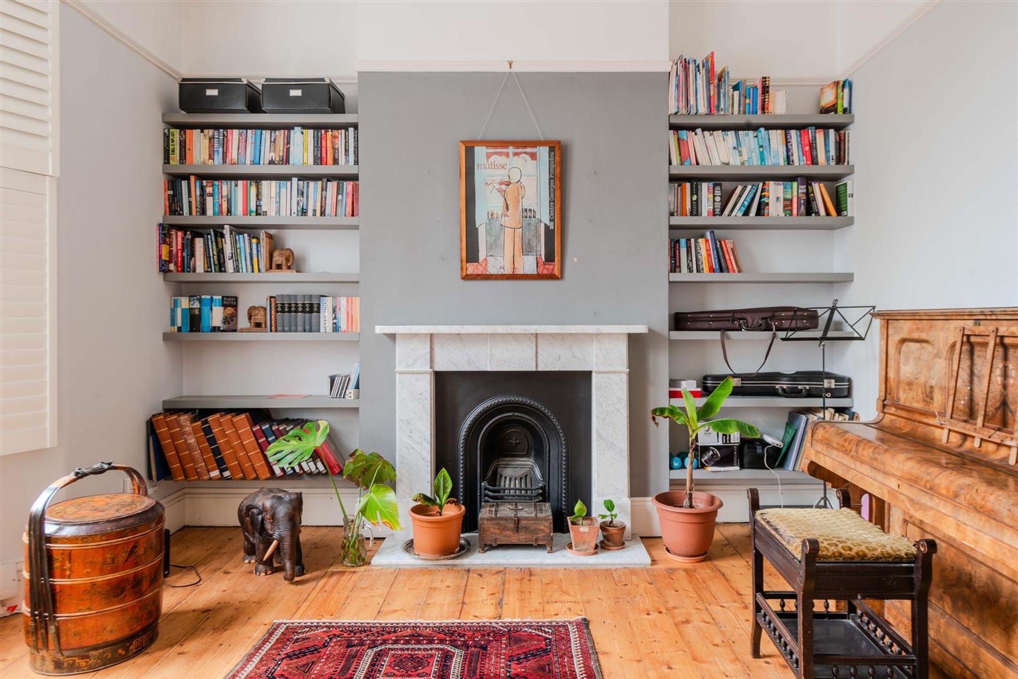 At the front of the property is an impressive reception room with original sash windows, plantation half shutters, period fireplace with marble surround, high ceilings, cornice and rose and alcove shelving.