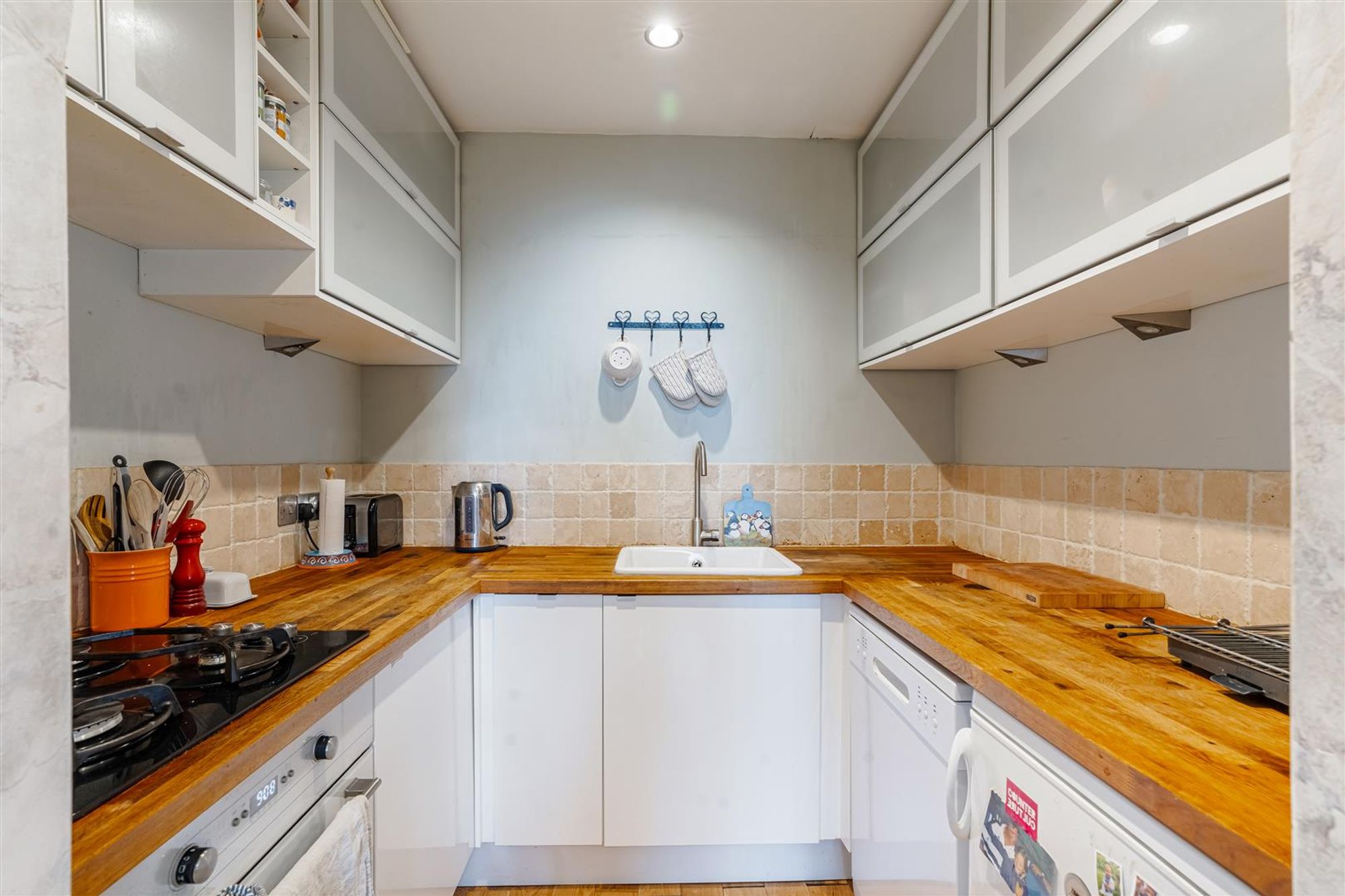 The kitchen itself is well designed, offering ample storage with a combination of wall and base cabinets, space for modern appliances including a dishwasher, and stylish finishes such as a wooden worktop and tiled splashback.