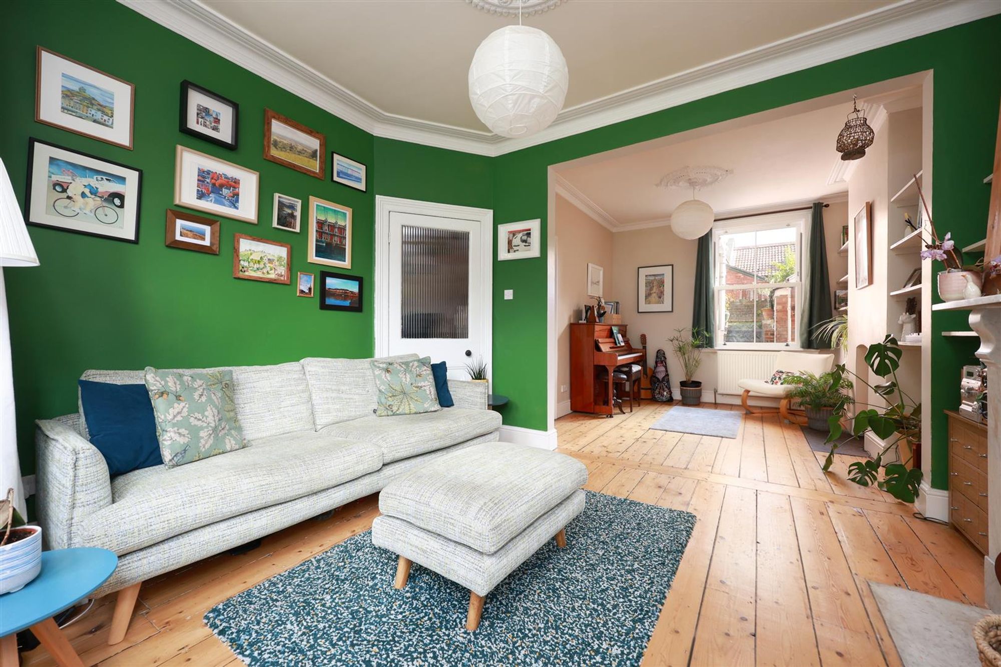 Ground floor accommodation comprises two open plan living rooms with stripped wood floors. The front reception room has a bay window with new double-glazed uPVC sash windows, ornate ceiling cornice and rose, stripped wood floor and a period fireplace. The rear of the two reception rooms feels light and bright and features ceiling coving and a new uPVC double-glazed sash window overlooking the rear garden.