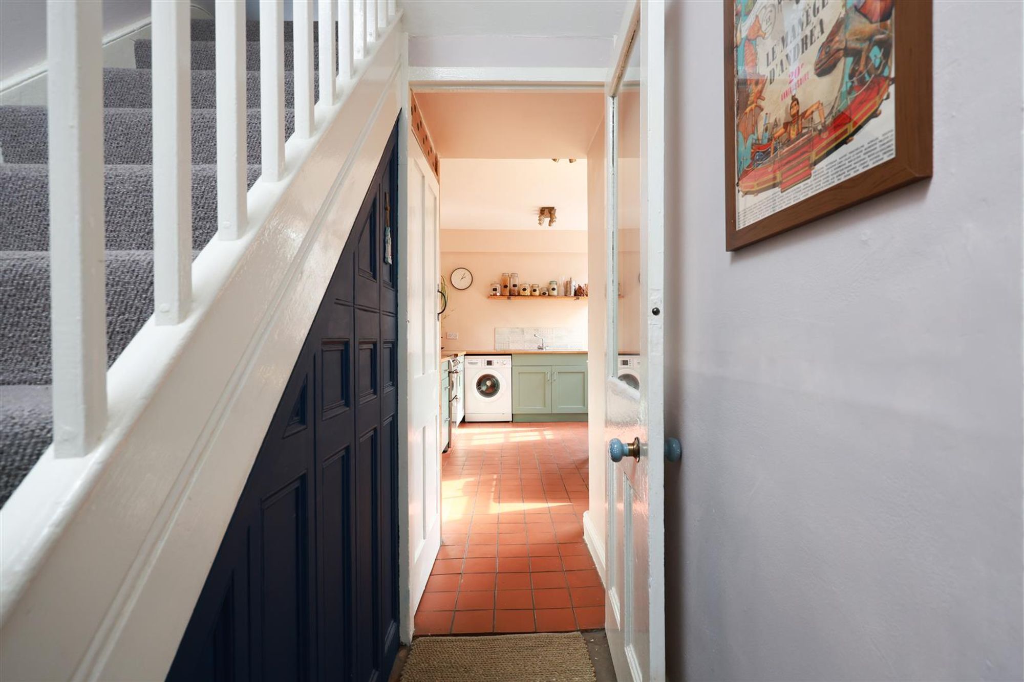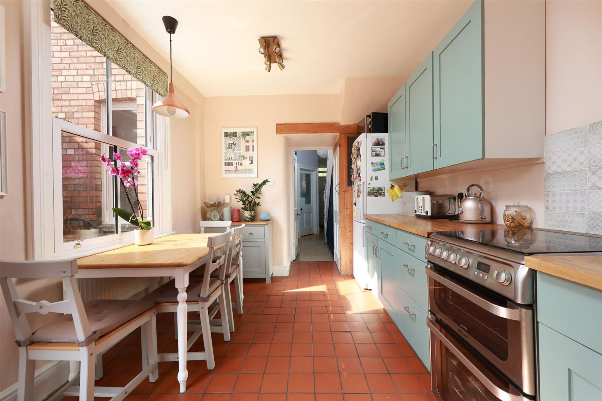 At the rear of the ground floor is a stylish kitchen/diner complete with a range of contemporary wall and base units with solid wood worktops, tiled splash-backs and terracotta tiled floor. This space is filled with natural light thanks to two large windows and a glazed door leading out onto the rear garden.