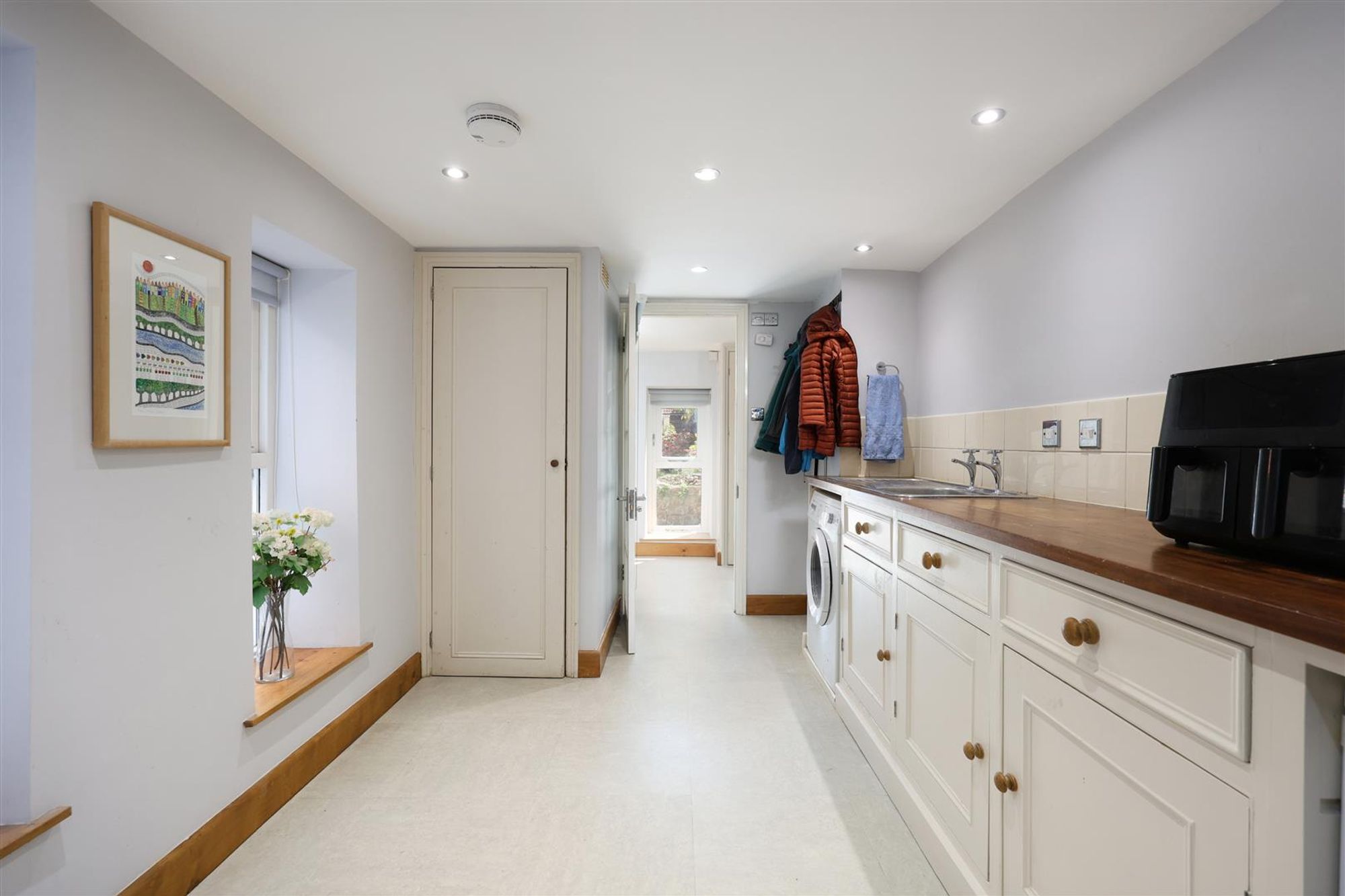 On the lower ground floor, the open plan kitchen and dining room makes a fantastic social hub. White cabinetry with wooden worktops offer plenty of storage and workspace, as well as providing room for integrated appliances. French doors open out to a southerly facing garden with a paved area ideal for al fresco dining, surrounded by mature planting and a calming water feature. Adjacent to the kitchen, a utility room provides space for a washing machine and additional storage, as well as access to a bathroom complete with a shower.