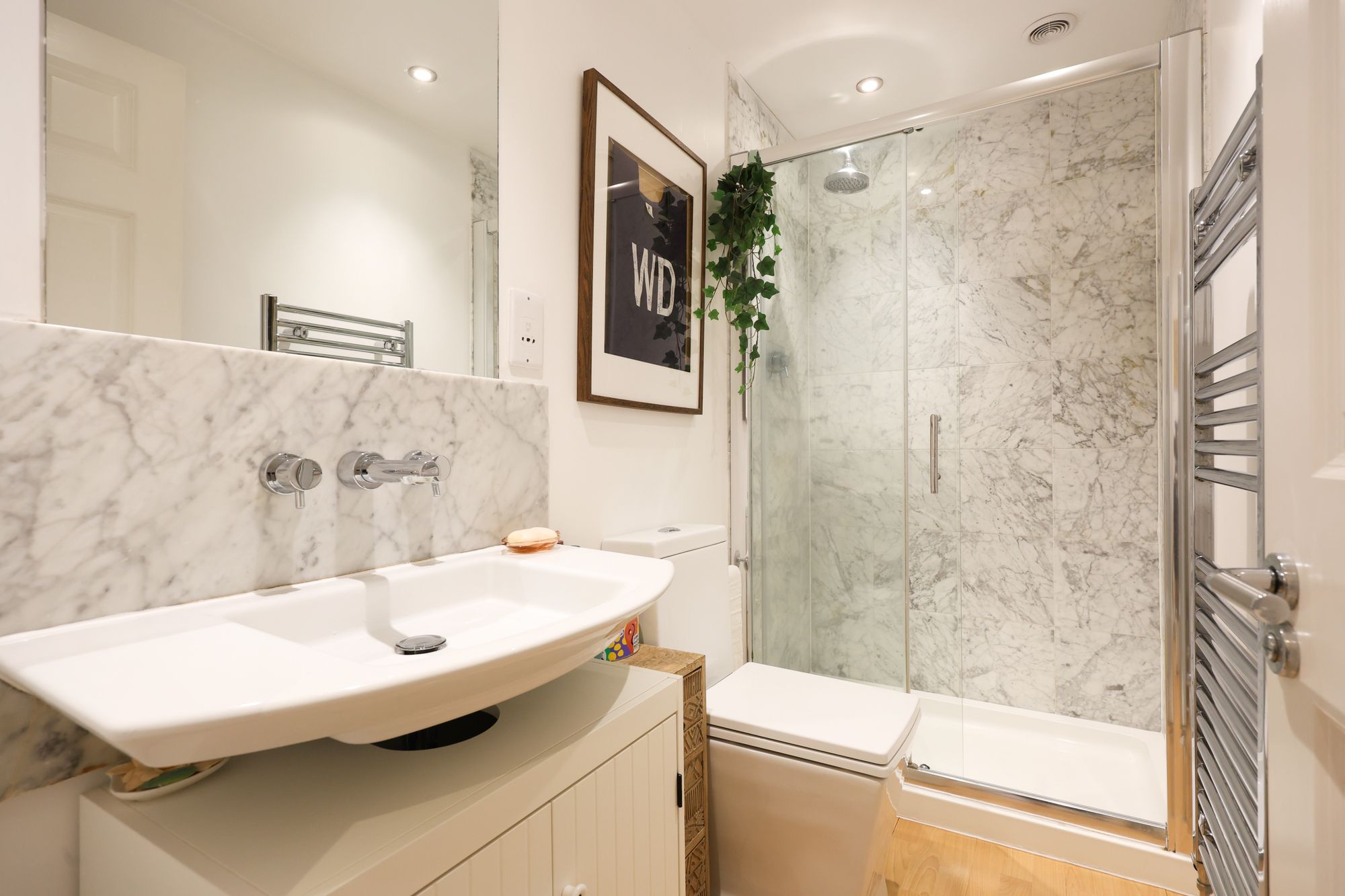 A modern bathroom completes the accommodation, fitted with a walk-in shower and cabinetry beneath the sink. Marble-style tiling and wooden flooring give the room a contemporary and polished feel.