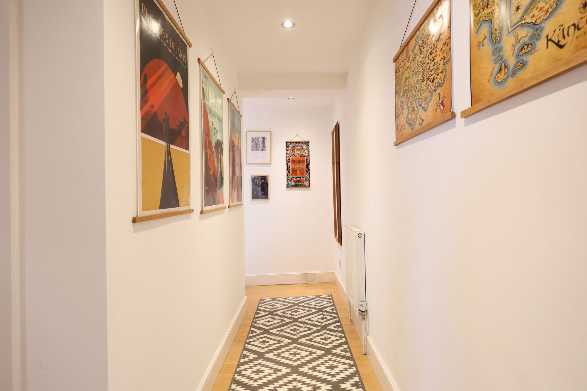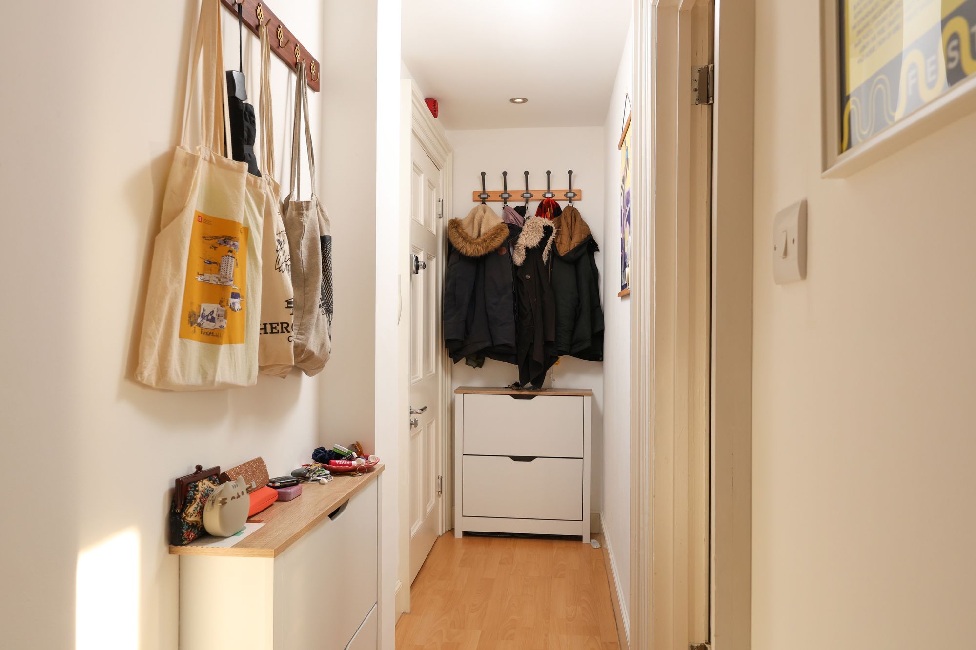 Set back from the road, the flat is accessed via a paved approach beside a popular independent coffee shop. The communal areas are tidy and well maintained, with a staircase leading up to the flat on the third floor.